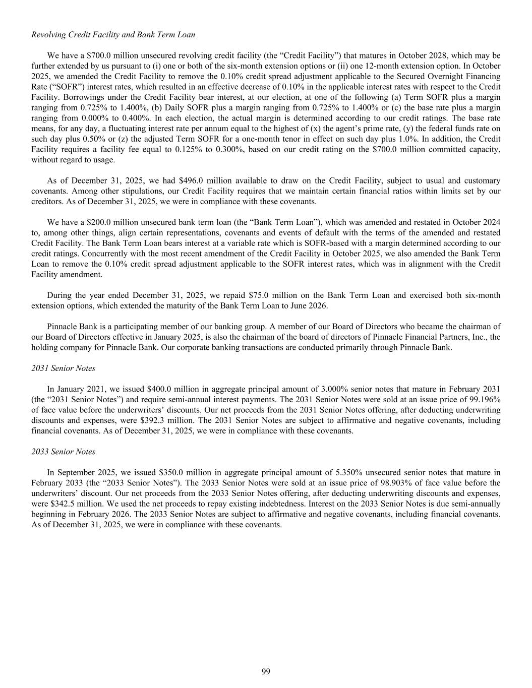 Revolving Credit Facility and Bank Term Loan We have a $700.0 million unsecured revolving credit facility (the “Credit Facility”) that matures in October 2028, which may be further extended by us pursuant to (i) one or both of the six-month extension options or (ii) one 12-month extension option. In October 2025, we amended the Credit Facility to remove the 0.10% credit spread adjustment applicable to the Secured Overnight Financing Rate (“SOFR”) interest rates, which resulted in an effective decrease of 0.10% in the applicable interest rates with respect to the Credit Facility. Borrowings under the Credit Facility bear interest, at our election, at one of the following (a) Term SOFR plus a margin ranging from 0.725% to 1.400%, (b) Daily SOFR plus a margin ranging from 0.725% to 1.400% or (c) the base rate plus a margin ranging from 0.000% to 0.400%. In each election, the actual margin is determined according to our credit ratings. The base rate means, for any day, a fluctuating interest rate per annum equal to the highest of (x) the agent’s prime rate, (y) the federal funds rate on such day plus 0.50% or (z) the adjusted Term SOFR for a one-month tenor in effect on such day plus 1.0%. In addition, the Credit Facility requires a facility fee equal to 0.125% to 0.300%, based on our credit rating on the $700.0 million committed capacity, without regard to usage. As of December 31, 2025, we had $496.0 million available to draw on the Credit Facility, subject to usual and customary covenants. Among other stipulations, our Credit Facility requires that we maintain certain financial ratios within limits set by our creditors. As of December 31, 2025, we were in compliance with these covenants. We have a $200.0 million unsecured bank term loan (the “Bank Term Loan”), which was amended and restated in October 2024 to, among other things, align certain representations, covenants and events of default with the terms of the amended and restated Credit Facility. The Bank Term Loan bears interest at a variable rate which is SOFR-based with a margin determined according to our credit ratings. Concurrently with the most recent amendment of the Credit Facility in October 2025, we also amended the Bank Term Loan to remove the 0.10% credit spread adjustment applicable to the SOFR interest rates, which was in alignment with the Credit Facility amendment. During the year ended December 31, 2025, we repaid $75.0 million on the Bank Term Loan and exercised both six-month extension options, which extended the maturity of the Bank Term Loan to June 2026. Pinnacle Bank is a participating member of our banking group. A member of our Board of Directors who became the chairman of our Board of Directors effective in January 2025, is also the chairman of the board of directors of Pinnacle Financial Partners, Inc., the holding company for Pinnacle Bank. Our corporate banking transactions are conducted primarily through Pinnacle Bank. 2031 Senior Notes In January 2021, we issued $400.0 million in aggregate principal amount of 3.000% senior notes that mature in February 2031 (the “2031 Senior Notes”) and require semi-annual interest payments. The 2031 Senior Notes were sold at an issue price of 99.196% of face value before the underwriters’ discounts. Our net proceeds from the 2031 Senior Notes offering, after deducting underwriting discounts and expenses, were $392.3 million. The 2031 Senior Notes are subject to affirmative and negative covenants, including financial covenants. As of December 31, 2025, we were in compliance with these covenants. 2033 Senior Notes In September 2025, we issued $350.0 million in aggregate principal amount of 5.350% unsecured senior notes that mature in February 2033 (the “2033 Senior Notes”). The 2033 Senior Notes were sold at an issue price of 98.903% of face value before the underwriters’ discount. Our net proceeds from the 2033 Senior Notes offering, after deducting underwriting discounts and expenses, were $342.5 million. We used the net proceeds to repay existing indebtedness. Interest on the 2033 Senior Notes is due semi-annually beginning in February 2026. The 2033 Senior Notes are subject to affirmative and negative covenants, including financial covenants. As of December 31, 2025, we were in compliance with these covenants. 99