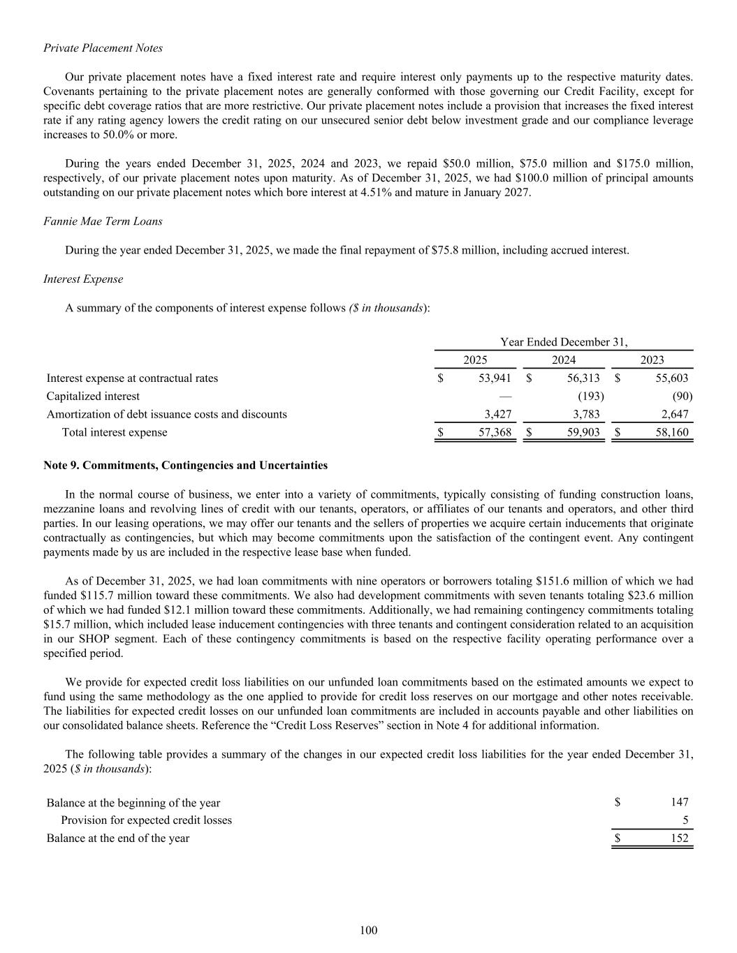 A summary of the components of interest expense follows ($ in thousands): Year Ended December 31, 2025 2024 2023 Interest expense at contractual rates $ 53,941 $ 56,313 $ 55,603 Capitalized interest — (193) (90) Amortization of debt issuance costs and discounts 3,427 3,783 2,647 Total interest expense $ 57,368 $ 59,903 $ 58,160 Note 9. Commitments, Contingencies and Uncertainties In the normal course of business, we enter into a variety of commitments, typically consisting of funding construction loans, mezzanine loans and revolving lines of credit with our tenants, operators, or affiliates of our tenants and operators, and other third parties. In our leasing operations, we may offer our tenants and the sellers of properties we acquire certain inducements that originate contractually as contingencies, but which may become commitments upon the satisfaction of the contingent event. Any contingent payments made by us are included in the respective lease base when funded. As of December 31, 2025, we had loan commitments with nine operators or borrowers totaling $151.6 million of which we had funded $115.7 million toward these commitments. We also had development commitments with seven tenants totaling $23.6 million of which we had funded $12.1 million toward these commitments. Additionally, we had remaining contingency commitments totaling $15.7 million, which included lease inducement contingencies with three tenants and contingent consideration related to an acquisition in our SHOP segment. Each of these contingency commitments is based on the respective facility operating performance over a specified period. We provide for expected credit loss liabilities on our unfunded loan commitments based on the estimated amounts we expect to fund using the same methodology as the one applied to provide for credit loss reserves on our mortgage and other notes receivable. The liabilities for expected credit losses on our unfunded loan commitments are included in accounts payable and other liabilities on our consolidated balance sheets. Reference the “Credit Loss Reserves” section in Note 4 for additional information. The following table provides a summary of the changes in our expected credit loss liabilities for the year ended December 31, 2025 ($ in thousands): Balance at the beginning of the year $ 147 Provision for expected credit losses 5 Balance at the end of the year $ 152 Private Placement Notes Our private placement notes have a fixed interest rate and require interest only payments up to the respective maturity dates. Covenants pertaining to the private placement notes are generally conformed with those governing our Credit Facility, except for specific debt coverage ratios that are more restrictive. Our private placement notes include a provision that increases the fixed interest rate if any rating agency lowers the credit rating on our unsecured senior debt below investment grade and our compliance leverage increases to 50.0% or more. During the years ended December 31, 2025, 2024 and 2023, we repaid $50.0 million, $75.0 million and $175.0 million, respectively, of our private placement notes upon maturity. As of December 31, 2025, we had $100.0 million of principal amounts outstanding on our private placement notes which bore interest at 4.51% and mature in January 2027. Fannie Mae Term Loans During the year ended December 31, 2025, we made the final repayment of $75.8 million, including accrued interest. Interest Expense 100