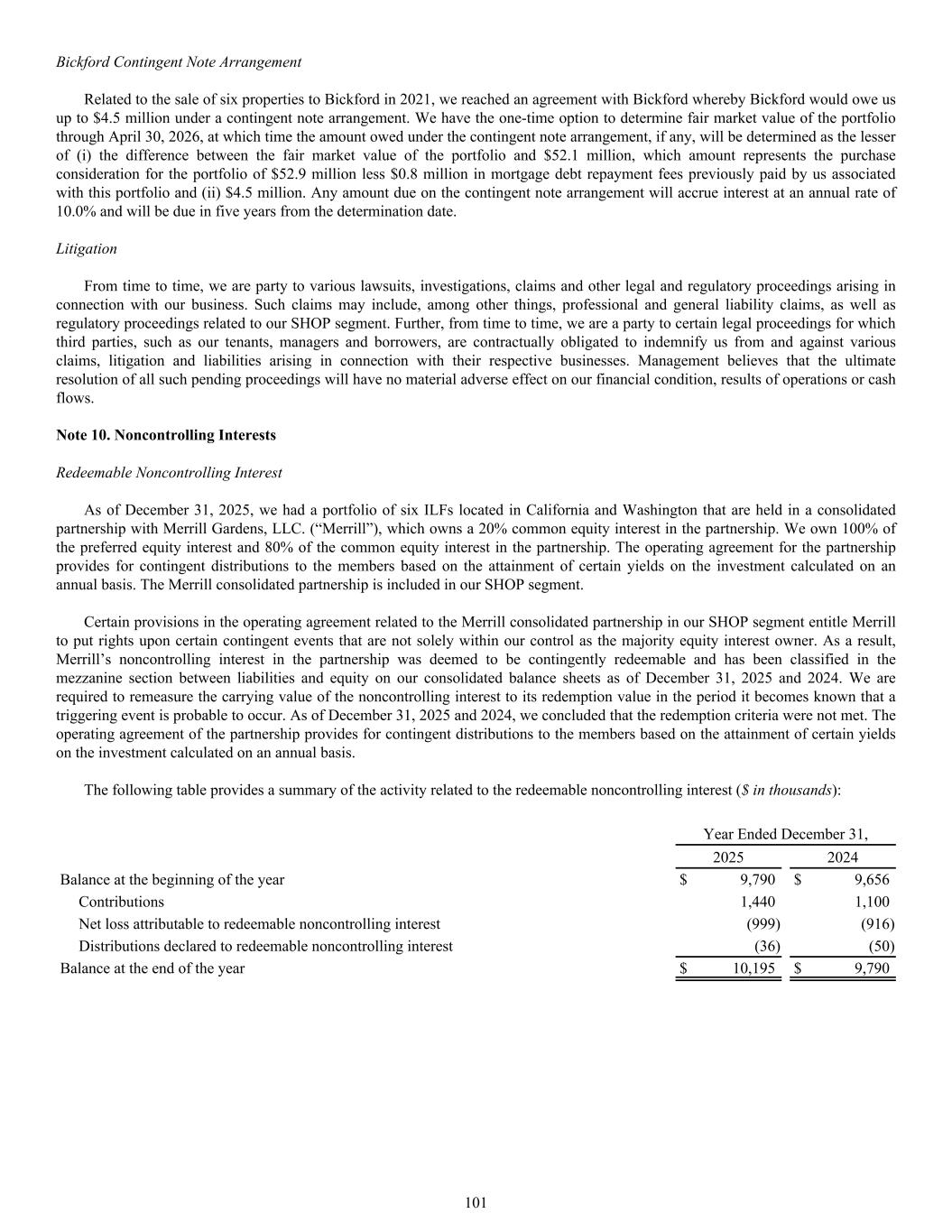 Note 10. Noncontrolling Interests Redeemable Noncontrolling Interest As of December 31, 2025, we had a portfolio of six ILFs located in California and Washington that are held in a consolidated partnership with Merrill Gardens, LLC. (“Merrill”), which owns a 20% common equity interest in the partnership. We own 100% of the preferred equity interest and 80% of the common equity interest in the partnership. The operating agreement for the partnership provides for contingent distributions to the members based on the attainment of certain yields on the investment calculated on an annual basis. The Merrill consolidated partnership is included in our SHOP segment. Certain provisions in the operating agreement related to the Merrill consolidated partnership in our SHOP segment entitle Merrill to put rights upon certain contingent events that are not solely within our control as the majority equity interest owner. As a result, Merrill’s noncontrolling interest in the partnership was deemed to be contingently redeemable and has been classified in the mezzanine section between liabilities and equity on our consolidated balance sheets as of December 31, 2025 and 2024. We are required to remeasure the carrying value of the noncontrolling interest to its redemption value in the period it becomes known that a triggering event is probable to occur. As of December 31, 2025 and 2024, we concluded that the redemption criteria were not met. The operating agreement of the partnership provides for contingent distributions to the members based on the attainment of certain yields on the investment calculated on an annual basis. The following table provides a summary of the activity related to the redeemable noncontrolling interest ($ in thousands): Year Ended December 31, 2025 2024 Balance at the beginning of the year $ 9,790 $ 9,656 Contributions 1,440 1,100 Net loss attributable to redeemable noncontrolling interest (999) (916) Distributions declared to redeemable noncontrolling interest (36) (50) Balance at the end of the year $ 10,195 $ 9,790 Bickford Contingent Note Arrangement Related to the sale of six properties to Bickford in 2021, we reached an agreement with Bickford whereby Bickford would owe us up to $4.5 million under a contingent note arrangement. We have the one-time option to determine fair market value of the portfolio through April 30, 2026, at which time the amount owed under the contingent note arrangement, if any, will be determined as the lesser of (i) the difference between the fair market value of the portfolio and $52.1 million, which amount represents the purchase consideration for the portfolio of $52.9 million less $0.8 million in mortgage debt repayment fees previously paid by us associated with this portfolio and (ii) $4.5 million. Any amount due on the contingent note arrangement will accrue interest at an annual rate of 10.0% and will be due in five years from the determination date. Litigation From time to time, we are party to various lawsuits, investigations, claims and other legal and regulatory proceedings arising in connection with our business. Such claims may include, among other things, professional and general liability claims, as well as regulatory proceedings related to our SHOP segment. Further, from time to time, we are a party to certain legal proceedings for which third parties, such as our tenants, managers and borrowers, are contractually obligated to indemnify us from and against various claims, litigation and liabilities arising in connection with their respective businesses. Management believes that the ultimate resolution of all such pending proceedings will have no material adverse effect on our financial condition, results of operations or cash flows. 101