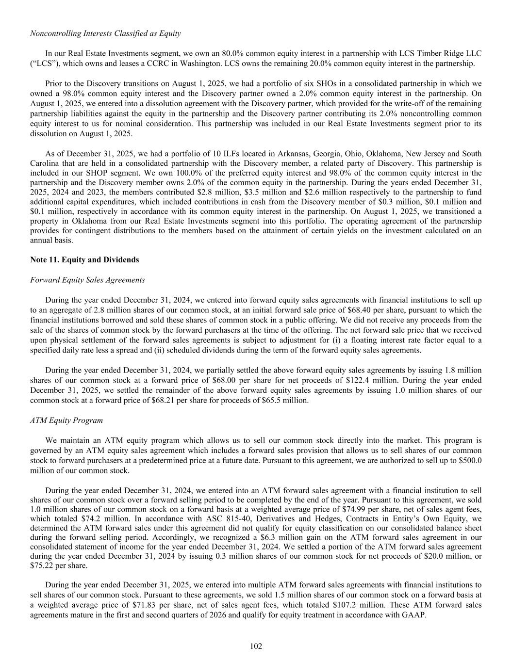 Noncontrolling Interests Classified as Equity In our Real Estate Investments segment, we own an 80.0% common equity interest in a partnership with LCS Timber Ridge LLC (“LCS”), which owns and leases a CCRC in Washington. LCS owns the remaining 20.0% common equity interest in the partnership. Prior to the Discovery transitions on August 1, 2025, we had a portfolio of six SHOs in a consolidated partnership in which we owned a 98.0% common equity interest and the Discovery partner owned a 2.0% common equity interest in the partnership. On August 1, 2025, we entered into a dissolution agreement with the Discovery partner, which provided for the write-off of the remaining partnership liabilities against the equity in the partnership and the Discovery partner contributing its 2.0% noncontrolling common equity interest to us for nominal consideration. This partnership was included in our Real Estate Investments segment prior to its dissolution on August 1, 2025. As of December 31, 2025, we had a portfolio of 10 ILFs located in Arkansas, Georgia, Ohio, Oklahoma, New Jersey and South Carolina that are held in a consolidated partnership with the Discovery member, a related party of Discovery. This partnership is included in our SHOP segment. We own 100.0% of the preferred equity interest and 98.0% of the common equity interest in the partnership and the Discovery member owns 2.0% of the common equity in the partnership. During the years ended December 31, 2025, 2024 and 2023, the members contributed $2.8 million, $3.5 million and $2.6 million respectively to the partnership to fund additional capital expenditures, which included contributions in cash from the Discovery member of $0.3 million, $0.1 million and $0.1 million, respectively in accordance with its common equity interest in the partnership. On August 1, 2025, we transitioned a property in Oklahoma from our Real Estate Investments segment into this portfolio. The operating agreement of the partnership provides for contingent distributions to the members based on the attainment of certain yields on the investment calculated on an annual basis. Note 11. Equity and Dividends Forward Equity Sales Agreements During the year ended December 31, 2024, we entered into forward equity sales agreements with financial institutions to sell up to an aggregate of 2.8 million shares of our common stock, at an initial forward sale price of $68.40 per share, pursuant to which the financial institutions borrowed and sold these shares of common stock in a public offering. We did not receive any proceeds from the sale of the shares of common stock by the forward purchasers at the time of the offering. The net forward sale price that we received upon physical settlement of the forward sales agreements is subject to adjustment for (i) a floating interest rate factor equal to a specified daily rate less a spread and (ii) scheduled dividends during the term of the forward equity sales agreements. During the year ended December 31, 2024, we partially settled the above forward equity sales agreements by issuing 1.8 million shares of our common stock at a forward price of $68.00 per share for net proceeds of $122.4 million. During the year ended December 31, 2025, we settled the remainder of the above forward equity sales agreements by issuing 1.0 million shares of our common stock at a forward price of $68.21 per share for proceeds of $65.5 million. ATM Equity Program We maintain an ATM equity program which allows us to sell our common stock directly into the market. This program is governed by an ATM equity sales agreement which includes a forward sales provision that allows us to sell shares of our common stock to forward purchasers at a predetermined price at a future date. Pursuant to this agreement, we are authorized to sell up to $500.0 million of our common stock. During the year ended December 31, 2024, we entered into an ATM forward sales agreement with a financial institution to sell shares of our common stock over a forward selling period to be completed by the end of the year. Pursuant to this agreement, we sold 1.0 million shares of our common stock on a forward basis at a weighted average price of $74.99 per share, net of sales agent fees, which totaled $74.2 million. In accordance with ASC 815-40, Derivatives and Hedges, Contracts in Entity’s Own Equity, we determined the ATM forward sales under this agreement did not qualify for equity classification on our consolidated balance sheet during the forward selling period. Accordingly, we recognized a $6.3 million gain on the ATM forward sales agreement in our consolidated statement of income for the year ended December 31, 2024. We settled a portion of the ATM forward sales agreement during the year ended December 31, 2024 by issuing 0.3 million shares of our common stock for net proceeds of $20.0 million, or $75.22 per share. During the year ended December 31, 2025, we entered into multiple ATM forward sales agreements with financial institutions to sell shares of our common stock. Pursuant to these agreements, we sold 1.5 million shares of our common stock on a forward basis at a weighted average price of $71.83 per share, net of sales agent fees, which totaled $107.2 million. These ATM forward sales agreements mature in the first and second quarters of 2026 and qualify for equity treatment in accordance with GAAP. 102