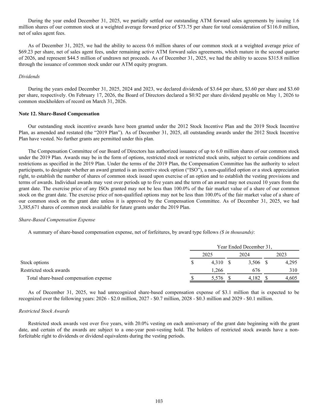 A summary of share-based compensation expense, net of forfeitures, by award type follows ($ in thousands): Year Ended December 31, 2025 2024 2023 Stock options $ 4,310 $ 3,506 $ 4,295 Restricted stock awards 1,266 676 310 Total share-based compensation expense $ 5,576 $ 4,182 $ 4,605 As of December 31, 2025, we had unrecognized share-based compensation expense of $3.1 million that is expected to be recognized over the following years: 2026 - $2.0 million, 2027 - $0.7 million, 2028 - $0.3 million and 2029 - $0.1 million. Restricted Stock Awards Restricted stock awards vest over five years, with 20.0% vesting on each anniversary of the grant date beginning with the grant date, and certain of the awards are subject to a one-year post-vesting hold. The holders of restricted stock awards have a non- forfeitable right to dividends or dividend equivalents during the vesting periods. During the year ended December 31, 2025, we partially settled our outstanding ATM forward sales agreements by issuing 1.6 million shares of our common stock at a weighted average forward price of $73.75 per share for total consideration of $116.0 million, net of sales agent fees. As of December 31, 2025, we had the ability to access 0.6 million shares of our common stock at a weighted average price of $69.23 per share, net of sales agent fees, under remaining active ATM forward sales agreements, which mature in the second quarter of 2026, and represent $44.5 million of undrawn net proceeds. As of December 31, 2025, we had the ability to access $315.8 million through the issuance of common stock under our ATM equity program. Dividends During the years ended December 31, 2025, 2024 and 2023, we declared dividends of $3.64 per share, $3.60 per share and $3.60 per share, respectively. On February 17, 2026, the Board of Directors declared a $0.92 per share dividend payable on May 1, 2026 to common stockholders of record on March 31, 2026. Note 12. Share-Based Compensation Our outstanding stock incentive awards have been granted under the 2012 Stock Incentive Plan and the 2019 Stock Incentive Plan, as amended and restated (the “2019 Plan”). As of December 31, 2025, all outstanding awards under the 2012 Stock Incentive Plan have vested. No further grants are permitted under this plan. The Compensation Committee of our Board of Directors has authorized issuance of up to 6.0 million shares of our common stock under the 2019 Plan. Awards may be in the form of options, restricted stock or restricted stock units, subject to certain conditions and restrictions as specified in the 2019 Plan. Under the terms of the 2019 Plan, the Compensation Committee has the authority to select participants, to designate whether an award granted is an incentive stock option (“ISO”), a non-qualified option or a stock appreciation right, to establish the number of shares of common stock issued upon exercise of an option and to establish the vesting provisions and terms of awards. Individual awards may vest over periods up to five years and the term of an award may not exceed 10 years from the grant date. The exercise price of any ISOs granted may not be less than 100.0% of the fair market value of a share of our common stock on the grant date. The exercise price of non-qualified options may not be less than 100.0% of the fair market value of a share of our common stock on the grant date unless it is approved by the Compensation Committee. As of December 31, 2025, we had 3,385,671 shares of common stock available for future grants under the 2019 Plan. Share-Based Compensation Expense 103