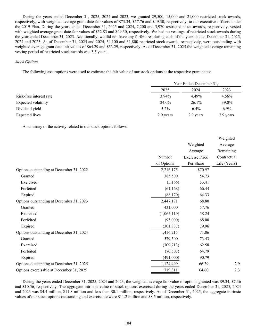 The following assumptions were used to estimate the fair value of our stock options at the respective grant dates: Year Ended December 31, 2025 2024 2023 Risk-free interest rate 3.94% 4.49% 4.56% Expected volatility 24.0% 26.1% 39.0% Dividend yield 5.2% 6.4% 6.9% Expected lives 2.9 years 2.9 years 2.9 years A summary of the activity related to our stock options follows: Weighted Weighted Average Average Remaining Number Exercise Price Contractual of Options Per Share Life (Years) Options outstanding at December 31, 2022 2,216,175 $70.97 Granted 385,500 54.73 Exercised (5,166) 53.41 Forfeited (61,168) 66.44 Expired (88,170) 64.33 Options outstanding at December 31, 2023 2,447,171 68.80 Granted 431,000 57.76 Exercised (1,065,119) 58.24 Forfeited (95,000) 68.00 Expired (301,837) 79.96 Options outstanding at December 31, 2024 1,416,215 71.06 Granted 579,500 73.43 Exercised (309,713) 62.58 Forfeited (70,503) 64.79 Expired (491,000) 90.79 Options outstanding at December 31, 2025 1,124,499 66.39 2.9 Options exercisable at December 31, 2025 719,311 64.60 2.3 During the years ended December 31, 2025, 2024 and 2023, the weighted average fair value of options granted was $9.34, $7.36 and $10.56, respectively. The aggregate intrinsic value of stock options exercised during the years ended December 31, 2025, 2024 and 2023 was $4.4 million, $11.8 million and less than $0.1 million, respectively. As of December 31, 2025, the aggregate intrinsic values of our stock options outstanding and exercisable were $11.2 million and $8.5 million, respectively. During the years ended December 31, 2025, 2024 and 2023, we granted 29,500, 15,000 and 21,000 restricted stock awards, respectively, with weighted average grant date fair values of $73.34, $57.76 and $49.30, respectively, to our executive officers under the 2019 Plan. During the years ended December 31, 2025 and 2024, 7,200 and 3,970 restricted stock awards, respectively, vested with weighted average grant date fair values of $52.83 and $49.30, respectively. We had no vestings of restricted stock awards during the year ended December 31, 2023. Additionally, we did not have any forfeitures during each of the years ended December 31, 2025, 2024 and 2023. As of December 31, 2025 and 2024, 54,100 and 31,800 restricted stock awards, respectively, were outstanding with weighted average grant date fair values of $64.29 and $53.29, respectively. As of December 31, 2025 the weighted average remaining vesting period of restricted stock awards was 3.5 years. Stock Options 104