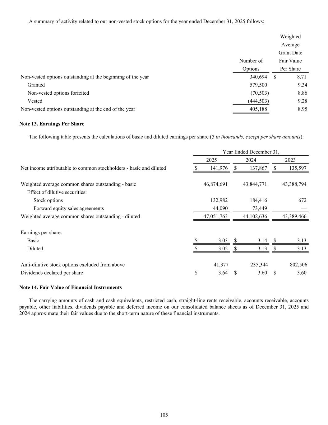 A summary of activity related to our non-vested stock options for the year ended December 31, 2025 follows: Weighted Average Grant Date Number of Fair Value Options Per Share Non-vested options outstanding at the beginning of the year 340,694 $ 8.71 Granted 579,500 9.34 Non-vested options forfeited (70,503) 8.86 Vested (444,503) 9.28 Non-vested options outstanding at the end of the year 405,188 8.95 Note 13. Earnings Per Share The following table presents the calculations of basic and diluted earnings per share ($ in thousands, except per share amounts): Year Ended December 31, 2025 2024 2023 Net income attributable to common stockholders - basic and diluted $ 141,976 $ 137,867 $ 135,597 Weighted average common shares outstanding - basic 46,874,691 43,844,771 43,388,794 Effect of dilutive securities: Stock options 132,982 184,416 672 Forward equity sales agreements 44,090 73,449 — Weighted average common shares outstanding - diluted 47,051,763 44,102,636 43,389,466 Earnings per share: Basic $ 3.03 $ 3.14 $ 3.13 Diluted $ 3.02 $ 3.13 $ 3.13 Anti-dilutive stock options excluded from above 41,377 235,344 802,506 Dividends declared per share $ 3.64 $ 3.60 $ 3.60 Note 14. Fair Value of Financial Instruments The carrying amounts of cash and cash equivalents, restricted cash, straight-line rents receivable, accounts receivable, accounts payable, other liabilities. dividends payable and deferred income on our consolidated balance sheets as of December 31, 2025 and 2024 approximate their fair values due to the short-term nature of these financial instruments. 105