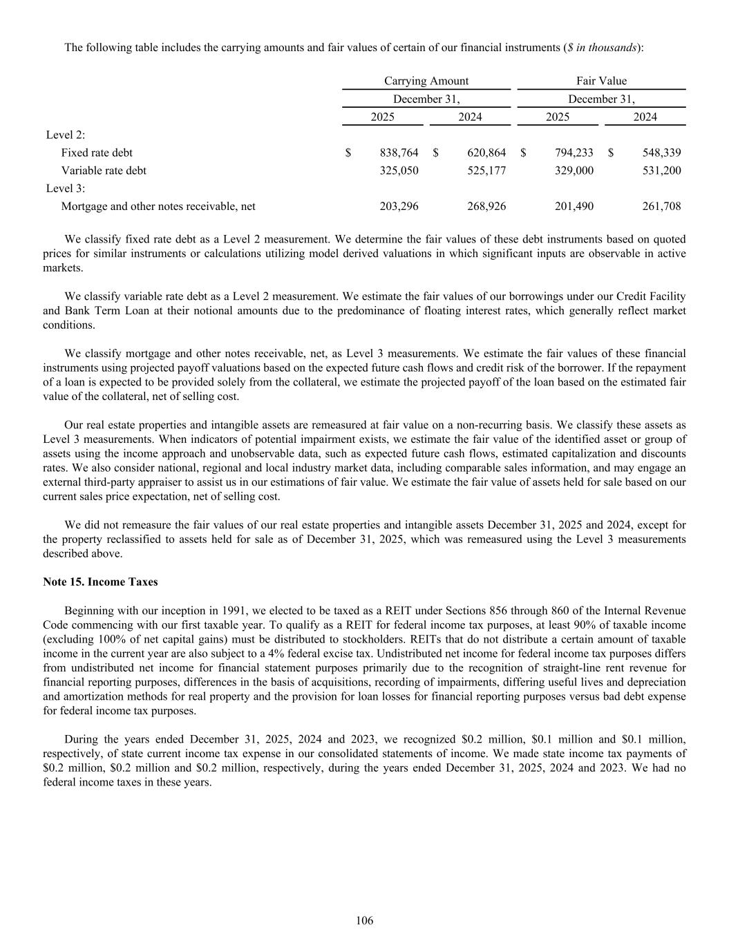The following table includes the carrying amounts and fair values of certain of our financial instruments ($ in thousands): Carrying Amount Fair Value December 31, December 31, 2025 2024 2025 2024 Level 2: Fixed rate debt $ 838,764 $ 620,864 $ 794,233 $ 548,339 Variable rate debt 325,050 525,177 329,000 531,200 Level 3: Mortgage and other notes receivable, net 203,296 268,926 201,490 261,708 We classify fixed rate debt as a Level 2 measurement. We determine the fair values of these debt instruments based on quoted prices for similar instruments or calculations utilizing model derived valuations in which significant inputs are observable in active markets. We classify variable rate debt as a Level 2 measurement. We estimate the fair values of our borrowings under our Credit Facility and Bank Term Loan at their notional amounts due to the predominance of floating interest rates, which generally reflect market conditions. We classify mortgage and other notes receivable, net, as Level 3 measurements. We estimate the fair values of these financial instruments using projected payoff valuations based on the expected future cash flows and credit risk of the borrower. If the repayment of a loan is expected to be provided solely from the collateral, we estimate the projected payoff of the loan based on the estimated fair value of the collateral, net of selling cost. Our real estate properties and intangible assets are remeasured at fair value on a non-recurring basis. We classify these assets as Level 3 measurements. When indicators of potential impairment exists, we estimate the fair value of the identified asset or group of assets using the income approach and unobservable data, such as expected future cash flows, estimated capitalization and discounts rates. We also consider national, regional and local industry market data, including comparable sales information, and may engage an external third-party appraiser to assist us in our estimations of fair value. We estimate the fair value of assets held for sale based on our current sales price expectation, net of selling cost. We did not remeasure the fair values of our real estate properties and intangible assets December 31, 2025 and 2024, except for the property reclassified to assets held for sale as of December 31, 2025, which was remeasured using the Level 3 measurements described above. Note 15. Income Taxes Beginning with our inception in 1991, we elected to be taxed as a REIT under Sections 856 through 860 of the Internal Revenue Code commencing with our first taxable year. To qualify as a REIT for federal income tax purposes, at least 90% of taxable income (excluding 100% of net capital gains) must be distributed to stockholders. REITs that do not distribute a certain amount of taxable income in the current year are also subject to a 4% federal excise tax. Undistributed net income for federal income tax purposes differs from undistributed net income for financial statement purposes primarily due to the recognition of straight-line rent revenue for financial reporting purposes, differences in the basis of acquisitions, recording of impairments, differing useful lives and depreciation and amortization methods for real property and the provision for loan losses for financial reporting purposes versus bad debt expense for federal income tax purposes. During the years ended December 31, 2025, 2024 and 2023, we recognized $0.2 million, $0.1 million and $0.1 million, respectively, of state current income tax expense in our consolidated statements of income. We made state income tax payments of $0.2 million, $0.2 million and $0.2 million, respectively, during the years ended December 31, 2025, 2024 and 2023. We had no federal income taxes in these years. 106