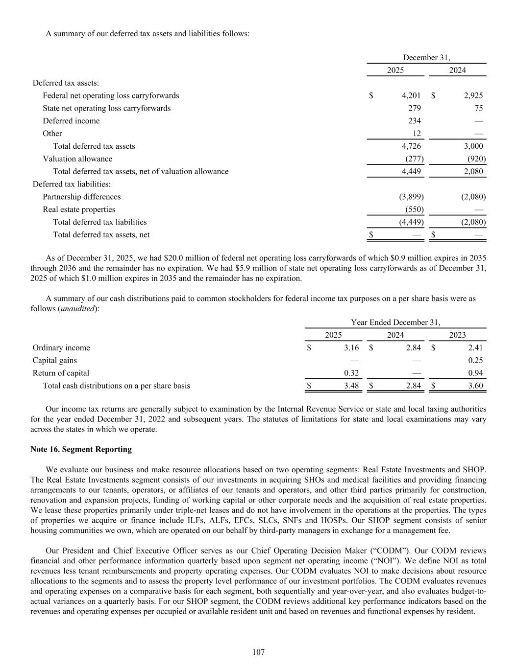 A summary of our deferred tax assets and liabilities follows: December 31, 2025 2024 Deferred tax assets: Federal net operating loss carryforwards $ 4,201 $ 2,925 State net operating loss carryforwards 279 75 Deferred income 234 — Other 12 — Total deferred tax assets 4,726 3,000 Valuation allowance (277) (920) Total deferred tax assets, net of valuation allowance 4,449 2,080 Deferred tax liabilities: Partnership differences (3,899) (2,080) Real estate properties (550) — Total deferred tax liabilities (4,449) (2,080) Total deferred tax assets, net $ — $ — As of December 31, 2025, we had $20.0 million of federal net operating loss carryforwards of which $0.9 million expires in 2035 through 2036 and the remainder has no expiration. We had $5.9 million of state net operating loss carryforwards as of December 31, 2025 of which $1.0 million expires in 2035 and the remainder has no expiration. A summary of our cash distributions paid to common stockholders for federal income tax purposes on a per share basis were as follows (unaudited): Year Ended December 31, 2025 2024 2023 Ordinary income $ 3.16 $ 2.84 $ 2.41 Capital gains — — 0.25 Return of capital 0.32 — 0.94 Total cash distributions on a per share basis $ 3.48 $ 2.84 $ 3.60 Our income tax returns are generally subject to examination by the Internal Revenue Service or state and local taxing authorities for the year ended December 31, 2022 and subsequent years. The statutes of limitations for state and local examinations may vary across the states in which we operate. Note 16. Segment Reporting We evaluate our business and make resource allocations based on two operating segments: Real Estate Investments and SHOP. The Real Estate Investments segment consists of our investments in acquiring SHOs and medical facilities and providing financing arrangements to our tenants, operators, or affiliates of our tenants and operators, and other third parties primarily for construction, renovation and expansion projects, funding of working capital or other corporate needs and the acquisition of real estate properties. We lease these properties primarily under triple-net leases and do not have involvement in the operations at the properties. The types of properties we acquire or finance include ILFs, ALFs, EFCs, SLCs, SNFs and HOSPs. Our SHOP segment consists of senior housing communities we own, which are operated on our behalf by third-party managers in exchange for a management fee. Our President and Chief Executive Officer serves as our Chief Operating Decision Maker (“CODM”). Our CODM reviews financial and other performance information quarterly based upon segment net operating income (“NOI”). We define NOI as total revenues less tenant reimbursements and property operating expenses. Our CODM evaluates NOI to make decisions about resource allocations to the segments and to assess the property level performance of our investment portfolios. The CODM evaluates revenues and operating expenses on a comparative basis for each segment, both sequentially and year-over-year, and also evaluates budget-to- actual variances on a quarterly basis. For our SHOP segment, the CODM reviews additional key performance indicators based on the revenues and operating expenses per occupied or available resident unit and based on revenues and functional expenses by resident. 107