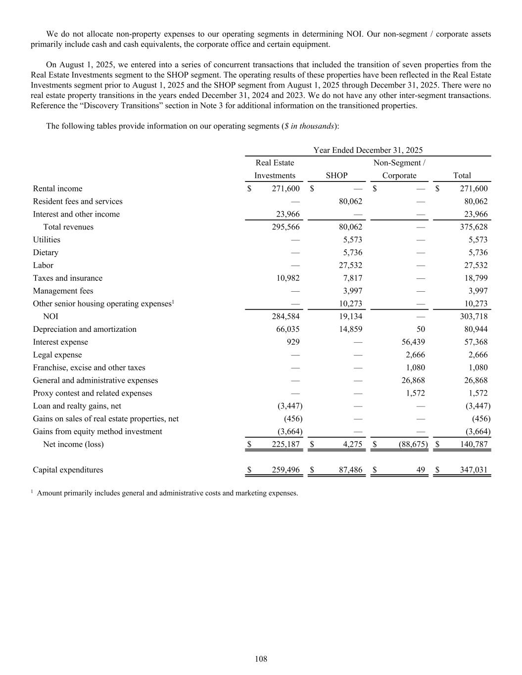The following tables provide information on our operating segments ($ in thousands): Year Ended December 31, 2025 Real Estate Non-Segment / Investments SHOP Corporate Total Rental income $ 271,600 $ — $ — $ 271,600 Resident fees and services — 80,062 — 80,062 Interest and other income 23,966 — — 23,966 Total revenues 295,566 80,062 — 375,628 Utilities — 5,573 — 5,573 Dietary — 5,736 — 5,736 Labor — 27,532 — 27,532 Taxes and insurance 10,982 7,817 — 18,799 Management fees — 3,997 — 3,997 Other senior housing operating expenses1 — 10,273 — 10,273 NOI 284,584 19,134 — 303,718 Depreciation and amortization 66,035 14,859 50 80,944 Interest expense 929 — 56,439 57,368 Legal expense — — 2,666 2,666 Franchise, excise and other taxes — — 1,080 1,080 General and administrative expenses — — 26,868 26,868 Proxy contest and related expenses — — 1,572 1,572 Loan and realty gains, net (3,447) — — (3,447) Gains on sales of real estate properties, net (456) — — (456) Gains from equity method investment (3,664) — — (3,664) Net income (loss) $ 225,187 $ 4,275 $ (88,675) $ 140,787 Capital expenditures $ 259,496 $ 87,486 $ 49 $ 347,031 1 Amount primarily includes general and administrative costs and marketing expenses. We do not allocate non-property expenses to our operating segments in determining NOI. Our non-segment / corporate assets primarily include cash and cash equivalents, the corporate office and certain equipment. On August 1, 2025, we entered into a series of concurrent transactions that included the transition of seven properties from the Real Estate Investments segment to the SHOP segment. The operating results of these properties have been reflected in the Real Estate Investments segment prior to August 1, 2025 and the SHOP segment from August 1, 2025 through December 31, 2025. There were no real estate property transitions in the years ended December 31, 2024 and 2023. We do not have any other inter-segment transactions. Reference the “Discovery Transitions” section in Note 3 for additional information on the transitioned properties. 108