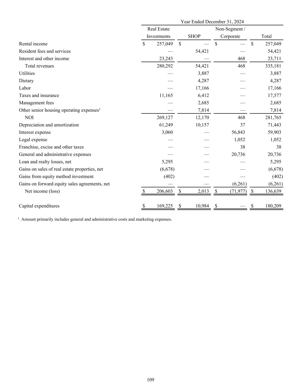 Year Ended December 31, 2024 Real Estate Non-Segment / Investments SHOP Corporate Total Rental income $ 257,049 $ — $ — $ 257,049 Resident fees and services — 54,421 — 54,421 Interest and other income 23,243 — 468 23,711 Total revenues 280,292 54,421 468 335,181 Utilities — 3,887 — 3,887 Dietary — 4,287 — 4,287 Labor — 17,166 — 17,166 Taxes and insurance 11,165 6,412 — 17,577 Management fees — 2,685 — 2,685 Other senior housing operating expenses1 — 7,814 — 7,814 NOI 269,127 12,170 468 281,765 Depreciation and amortization 61,249 10,157 37 71,443 Interest expense 3,060 — 56,843 59,903 Legal expense — — 1,052 1,052 Franchise, excise and other taxes — — 38 38 General and administrative expenses — — 20,736 20,736 Loan and realty losses, net 5,295 — — 5,295 Gains on sales of real estate properties, net (6,678) — — (6,678) Gains from equity method investment (402) — — (402) Gains on forward equity sales agreements, net — — (6,261) (6,261) Net income (loss) $ 206,603 $ 2,013 $ (71,977) $ 136,639 Capital expenditures $ 169,225 $ 10,984 $ — $ 180,209 1 Amount primarily includes general and administrative costs and marketing expenses. 109
