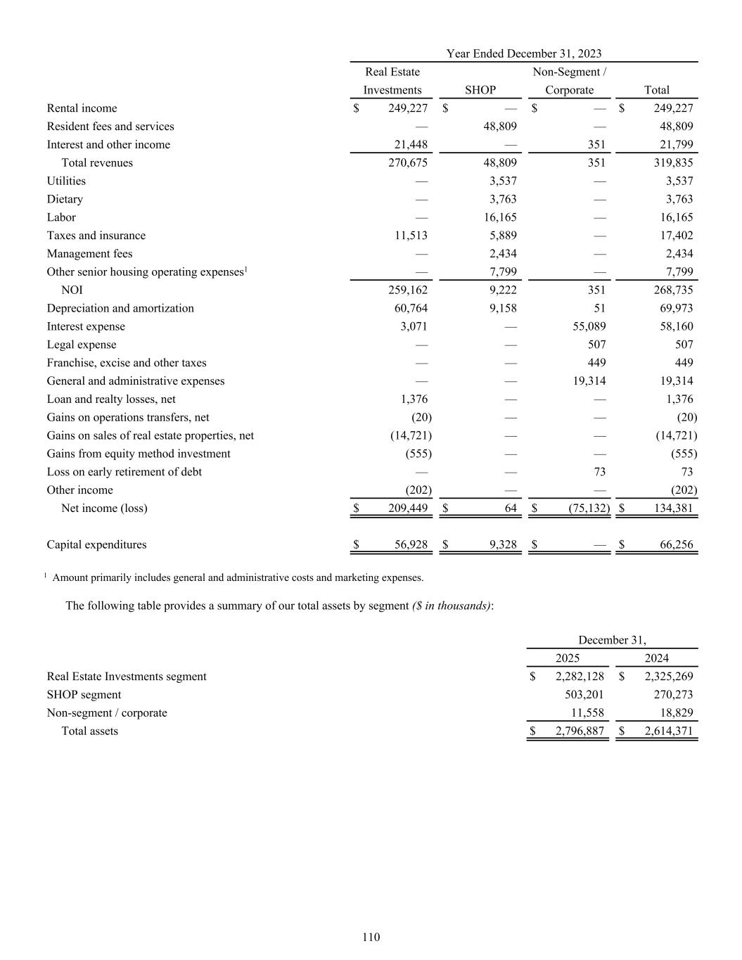 Year Ended December 31, 2023 Real Estate Non-Segment / Investments SHOP Corporate Total Rental income $ 249,227 $ — $ — $ 249,227 Resident fees and services — 48,809 — 48,809 Interest and other income 21,448 — 351 21,799 Total revenues 270,675 48,809 351 319,835 Utilities — 3,537 — 3,537 Dietary — 3,763 — 3,763 Labor — 16,165 — 16,165 Taxes and insurance 11,513 5,889 — 17,402 Management fees — 2,434 — 2,434 Other senior housing operating expenses1 — 7,799 — 7,799 NOI 259,162 9,222 351 268,735 Depreciation and amortization 60,764 9,158 51 69,973 Interest expense 3,071 — 55,089 58,160 Legal expense — — 507 507 Franchise, excise and other taxes — — 449 449 General and administrative expenses — — 19,314 19,314 Loan and realty losses, net 1,376 — — 1,376 Gains on operations transfers, net (20) — — (20) Gains on sales of real estate properties, net (14,721) — — (14,721) Gains from equity method investment (555) — — (555) Loss on early retirement of debt — — 73 73 Other income (202) — — (202) Net income (loss) $ 209,449 $ 64 $ (75,132) $ 134,381 Capital expenditures $ 56,928 $ 9,328 $ — $ 66,256 1 Amount primarily includes general and administrative costs and marketing expenses. The following table provides a summary of our total assets by segment ($ in thousands): December 31, 2025 2024 Real Estate Investments segment $ 2,282,128 $ 2,325,269 SHOP segment 503,201 270,273 Non-segment / corporate 11,558 18,829 Total assets $ 2,796,887 $ 2,614,371 110