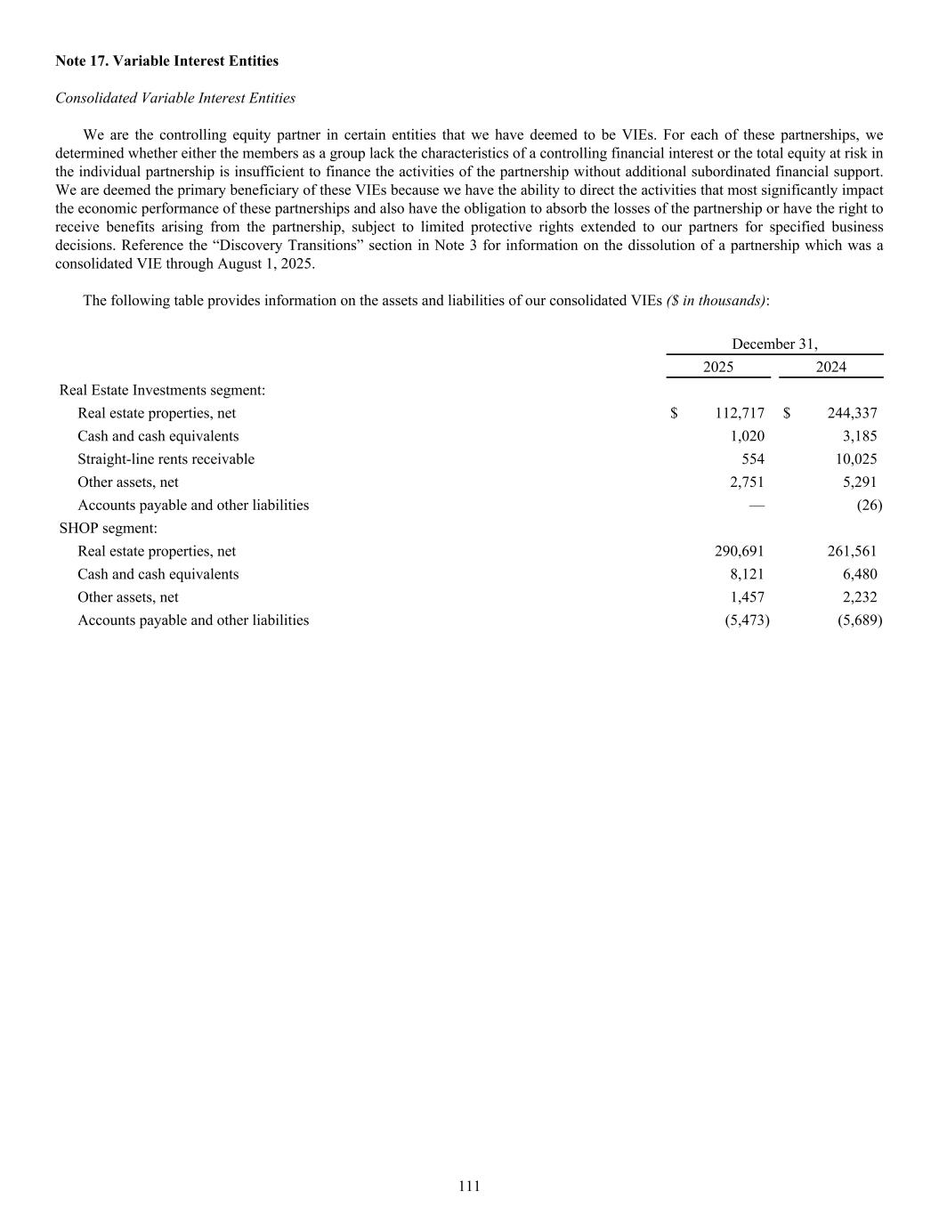The following table provides information on the assets and liabilities of our consolidated VIEs ($ in thousands): December 31, 2025 2024 Real Estate Investments segment: Real estate properties, net $ 112,717 $ 244,337 Cash and cash equivalents 1,020 3,185 Straight-line rents receivable 554 10,025 Other assets, net 2,751 5,291 Accounts payable and other liabilities — (26) SHOP segment: Real estate properties, net 290,691 261,561 Cash and cash equivalents 8,121 6,480 Other assets, net 1,457 2,232 Accounts payable and other liabilities (5,473) (5,689) Note 17. Variable Interest Entities Consolidated Variable Interest Entities We are the controlling equity partner in certain entities that we have deemed to be VIEs. For each of these partnerships, we determined whether either the members as a group lack the characteristics of a controlling financial interest or the total equity at risk in the individual partnership is insufficient to finance the activities of the partnership without additional subordinated financial support. We are deemed the primary beneficiary of these VIEs because we have the ability to direct the activities that most significantly impact the economic performance of these partnerships and also have the obligation to absorb the losses of the partnership or have the right to receive benefits arising from the partnership, subject to limited protective rights extended to our partners for specified business decisions. Reference the “Discovery Transitions” section in Note 3 for information on the dissolution of a partnership which was a consolidated VIE through August 1, 2025. 111