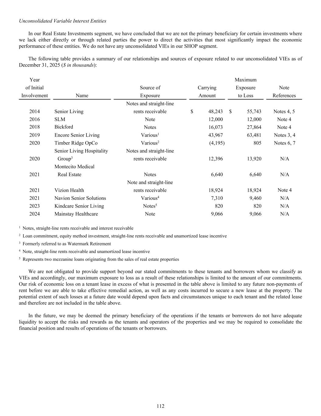 Year Maximum of Initial Source of Carrying Exposure Note Involvement Name Exposure Amount to Loss References Notes and straight-line 2014 Senior Living rents receivable $ 48,243 $ 55,743 Notes 4, 5 2016 SLM Note 12,000 12,000 Note 4 2018 Bickford Notes 16,073 27,864 Note 4 2019 Encore Senior Living Various1 43,967 63,481 Notes 3, 4 2020 Timber Ridge OpCo Various2 (4,195) 805 Notes 6, 7 Senior Living Hospitality Notes and straight-line 2020 Group3 rents receivable 12,396 13,920 N/A Montecito Medical 2021 Real Estate Notes 6,640 6,640 N/A Note and straight-line 2021 Vizion Health rents receivable 18,924 18,924 Note 4 2021 Navion Senior Solutions Various4 7,310 9,460 N/A 2023 Kindcare Senior Living Notes5 820 820 N/A 2024 Mainstay Healthcare Note 9,066 9,066 N/A 1 Notes, straight-line rents receivable and interest receivable 2 Loan commitment, equity method investment, straight-line rents receivable and unamortized lease incentive 3 Formerly referred to as Watermark Retirement 4 Note, straight-line rents receivable and unamortized lease incentive 5 Represents two mezzanine loans originating from the sales of real estate properties We are not obligated to provide support beyond our stated commitments to these tenants and borrowers whom we classify as VIEs and accordingly, our maximum exposure to loss as a result of these relationships is limited to the amount of our commitments. Our risk of economic loss on a tenant lease in excess of what is presented in the table above is limited to any future non-payments of rent before we are able to take effective remedial action, as well as any costs incurred to secure a new lease at the property. The potential extent of such losses at a future date would depend upon facts and circumstances unique to each tenant and the related lease and therefore are not included in the table above. In the future, we may be deemed the primary beneficiary of the operations if the tenants or borrowers do not have adequate liquidity to accept the risks and rewards as the tenants and operators of the properties and we may be required to consolidate the financial position and results of operations of the tenants or borrowers. Unconsolidated Variable Interest Entities In our Real Estate Investments segment, we have concluded that we are not the primary beneficiary for certain investments where we lack either directly or through related parties the power to direct the activities that most significantly impact the economic performance of these entities. We do not have any unconsolidated VIEs in our SHOP segment. The following table provides a summary of our relationships and sources of exposure related to our unconsolidated VIEs as of December 31, 2025 ($ in thousands): 112