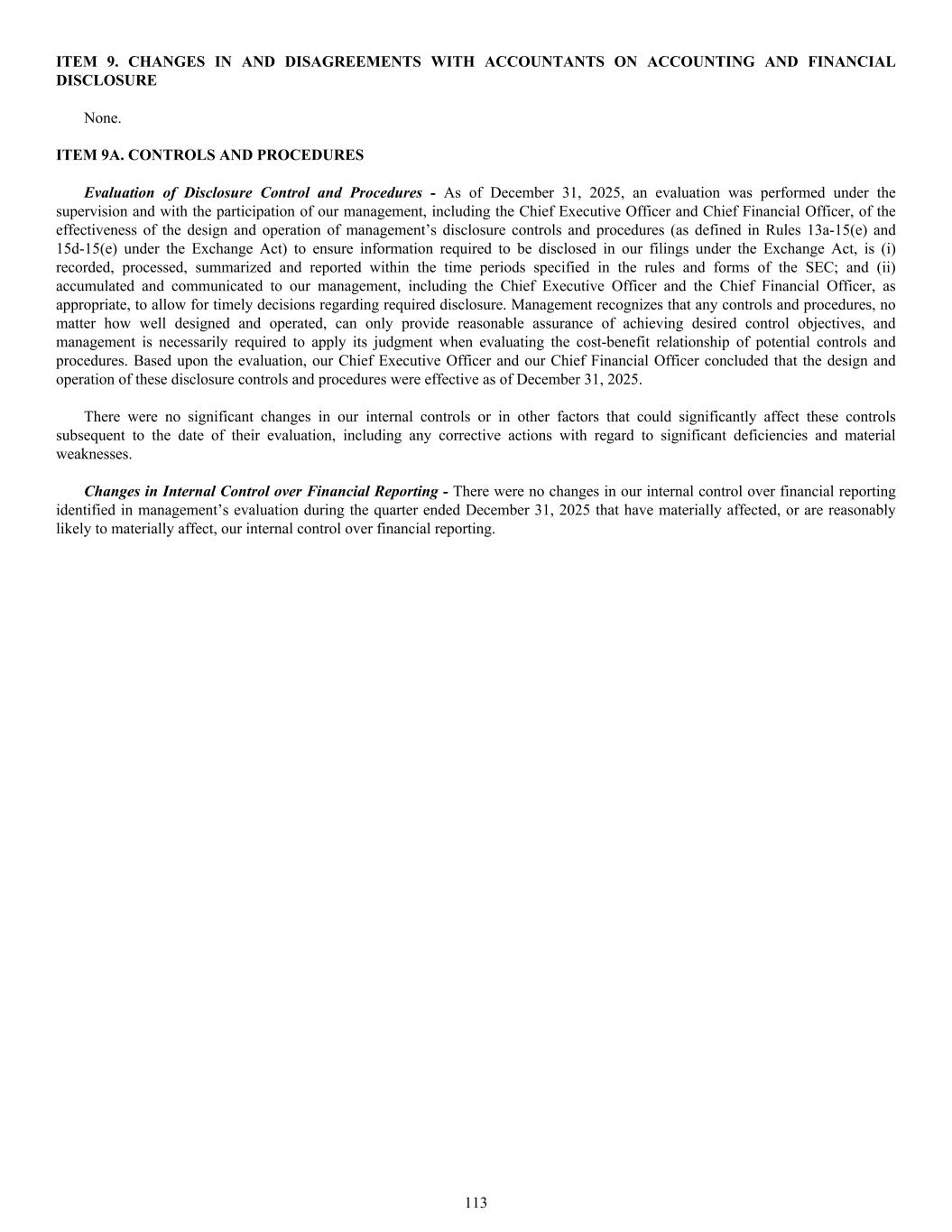 ITEM 9. CHANGES IN AND DISAGREEMENTS WITH ACCOUNTANTS ON ACCOUNTING AND FINANCIAL DISCLOSURE None. ITEM 9A. CONTROLS AND PROCEDURES Evaluation of Disclosure Control and Procedures - As of December 31, 2025, an evaluation was performed under the supervision and with the participation of our management, including the Chief Executive Officer and Chief Financial Officer, of the effectiveness of the design and operation of management’s disclosure controls and procedures (as defined in Rules 13a-15(e) and 15d-15(e) under the Exchange Act) to ensure information required to be disclosed in our filings under the Exchange Act, is (i) recorded, processed, summarized and reported within the time periods specified in the rules and forms of the SEC; and (ii) accumulated and communicated to our management, including the Chief Executive Officer and the Chief Financial Officer, as appropriate, to allow for timely decisions regarding required disclosure. Management recognizes that any controls and procedures, no matter how well designed and operated, can only provide reasonable assurance of achieving desired control objectives, and management is necessarily required to apply its judgment when evaluating the cost-benefit relationship of potential controls and procedures. Based upon the evaluation, our Chief Executive Officer and our Chief Financial Officer concluded that the design and operation of these disclosure controls and procedures were effective as of December 31, 2025. There were no significant changes in our internal controls or in other factors that could significantly affect these controls subsequent to the date of their evaluation, including any corrective actions with regard to significant deficiencies and material weaknesses. Changes in Internal Control over Financial Reporting - There were no changes in our internal control over financial reporting identified in management’s evaluation during the quarter ended December 31, 2025 that have materially affected, or are reasonably likely to materially affect, our internal control over financial reporting. 113