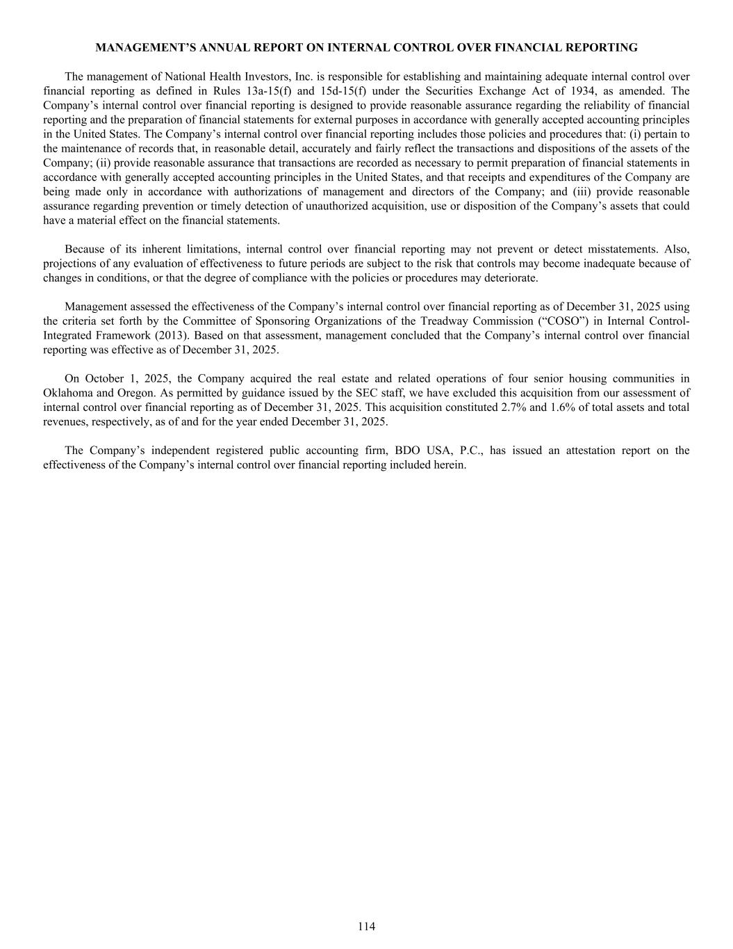 MANAGEMENT’S ANNUAL REPORT ON INTERNAL CONTROL OVER FINANCIAL REPORTING The management of National Health Investors, Inc. is responsible for establishing and maintaining adequate internal control over financial reporting as defined in Rules 13a-15(f) and 15d-15(f) under the Securities Exchange Act of 1934, as amended. The Company’s internal control over financial reporting is designed to provide reasonable assurance regarding the reliability of financial reporting and the preparation of financial statements for external purposes in accordance with generally accepted accounting principles in the United States. The Company’s internal control over financial reporting includes those policies and procedures that: (i) pertain to the maintenance of records that, in reasonable detail, accurately and fairly reflect the transactions and dispositions of the assets of the Company; (ii) provide reasonable assurance that transactions are recorded as necessary to permit preparation of financial statements in accordance with generally accepted accounting principles in the United States, and that receipts and expenditures of the Company are being made only in accordance with authorizations of management and directors of the Company; and (iii) provide reasonable assurance regarding prevention or timely detection of unauthorized acquisition, use or disposition of the Company’s assets that could have a material effect on the financial statements. Because of its inherent limitations, internal control over financial reporting may not prevent or detect misstatements. Also, projections of any evaluation of effectiveness to future periods are subject to the risk that controls may become inadequate because of changes in conditions, or that the degree of compliance with the policies or procedures may deteriorate. Management assessed the effectiveness of the Company’s internal control over financial reporting as of December 31, 2025 using the criteria set forth by the Committee of Sponsoring Organizations of the Treadway Commission (“COSO”) in Internal Control- Integrated Framework (2013). Based on that assessment, management concluded that the Company’s internal control over financial reporting was effective as of December 31, 2025. On October 1, 2025, the Company acquired the real estate and related operations of four senior housing communities in Oklahoma and Oregon. As permitted by guidance issued by the SEC staff, we have excluded this acquisition from our assessment of internal control over financial reporting as of December 31, 2025. This acquisition constituted 2.7% and 1.6% of total assets and total revenues, respectively, as of and for the year ended December 31, 2025. The Company’s independent registered public accounting firm, BDO USA, P.C., has issued an attestation report on the effectiveness of the Company’s internal control over financial reporting included herein. 114