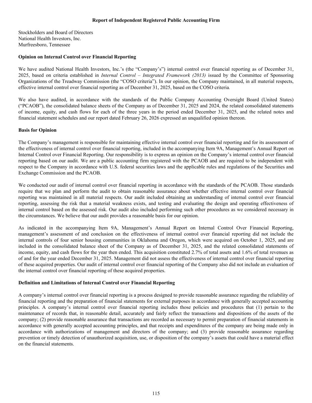 Report of Independent Registered Public Accounting Firm Stockholders and Board of Directors National Health Investors, Inc. Murfreesboro, Tennessee Opinion on Internal Control over Financial Reporting We have audited National Health Investors, Inc.’s (the “Company’s”) internal control over financial reporting as of December 31, 2025, based on criteria established in Internal Control – Integrated Framework (2013) issued by the Committee of Sponsoring Organizations of the Treadway Commission (the “COSO criteria”). In our opinion, the Company maintained, in all material respects, effective internal control over financial reporting as of December 31, 2025, based on the COSO criteria. We also have audited, in accordance with the standards of the Public Company Accounting Oversight Board (United States) (“PCAOB”), the consolidated balance sheets of the Company as of December 31, 2025 and 2024, the related consolidated statements of income, equity, and cash flows for each of the three years in the period ended December 31, 2025, and the related notes and financial statement schedules and our report dated February 26, 2026 expressed an unqualified opinion thereon. Basis for Opinion The Company’s management is responsible for maintaining effective internal control over financial reporting and for its assessment of the effectiveness of internal control over financial reporting, included in the accompanying Item 9A, Management’s Annual Report on Internal Control over Financial Reporting. Our responsibility is to express an opinion on the Company’s internal control over financial reporting based on our audit. We are a public accounting firm registered with the PCAOB and are required to be independent with respect to the Company in accordance with U.S. federal securities laws and the applicable rules and regulations of the Securities and Exchange Commission and the PCAOB. We conducted our audit of internal control over financial reporting in accordance with the standards of the PCAOB. Those standards require that we plan and perform the audit to obtain reasonable assurance about whether effective internal control over financial reporting was maintained in all material respects. Our audit included obtaining an understanding of internal control over financial reporting, assessing the risk that a material weakness exists, and testing and evaluating the design and operating effectiveness of internal control based on the assessed risk. Our audit also included performing such other procedures as we considered necessary in the circumstances. We believe that our audit provides a reasonable basis for our opinion. As indicated in the accompanying Item 9A, Management’s Annual Report on Internal Control Over Financial Reporting, management’s assessment of and conclusion on the effectiveness of internal control over financial reporting did not include the internal controls of four senior housing communities in Oklahoma and Oregon, which were acquired on October 1, 2025, and are included in the consolidated balance sheet of the Company as of December 31, 2025, and the related consolidated statements of income, equity, and cash flows for the year then ended. This acquisition constituted 2.7% of total assets and 1.6% of total revenues as of and for the year ended December 31, 2025. Management did not assess the effectiveness of internal control over financial reporting of these acquired properties. Our audit of internal control over financial reporting of the Company also did not include an evaluation of the internal control over financial reporting of these acquired properties. Definition and Limitations of Internal Control over Financial Reporting A company’s internal control over financial reporting is a process designed to provide reasonable assurance regarding the reliability of financial reporting and the preparation of financial statements for external purposes in accordance with generally accepted accounting principles. A company’s internal control over financial reporting includes those policies and procedures that (1) pertain to the maintenance of records that, in reasonable detail, accurately and fairly reflect the transactions and dispositions of the assets of the company; (2) provide reasonable assurance that transactions are recorded as necessary to permit preparation of financial statements in accordance with generally accepted accounting principles, and that receipts and expenditures of the company are being made only in accordance with authorizations of management and directors of the company; and (3) provide reasonable assurance regarding prevention or timely detection of unauthorized acquisition, use, or disposition of the company’s assets that could have a material effect on the financial statements. 115