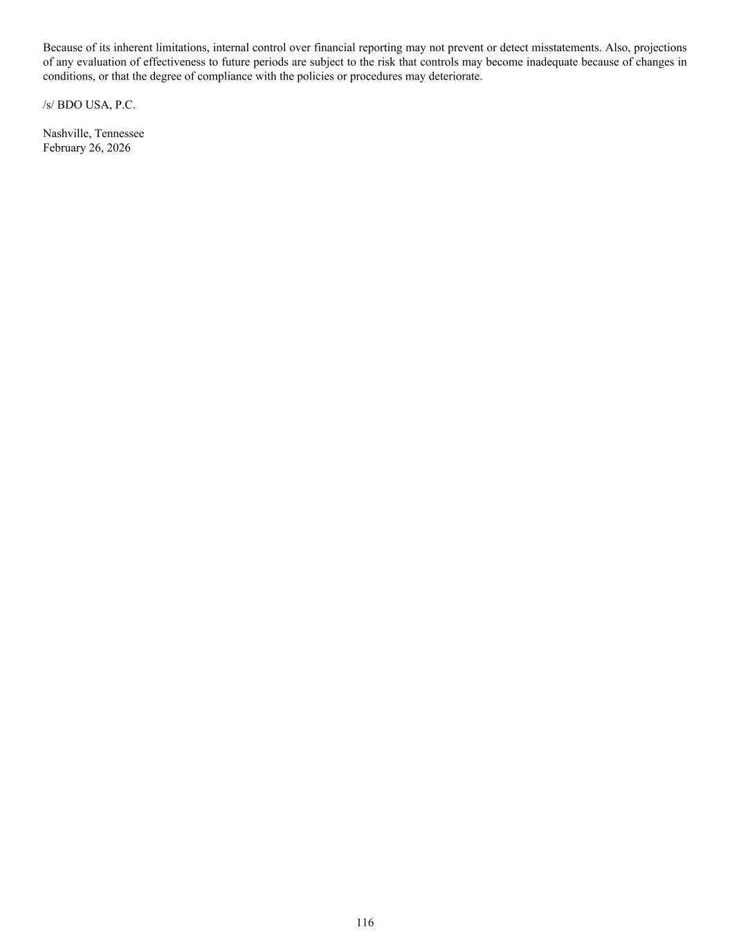 Because of its inherent limitations, internal control over financial reporting may not prevent or detect misstatements. Also, projections of any evaluation of effectiveness to future periods are subject to the risk that controls may become inadequate because of changes in conditions, or that the degree of compliance with the policies or procedures may deteriorate. /s/ BDO USA, P.C. Nashville, Tennessee February 26, 2026 116
