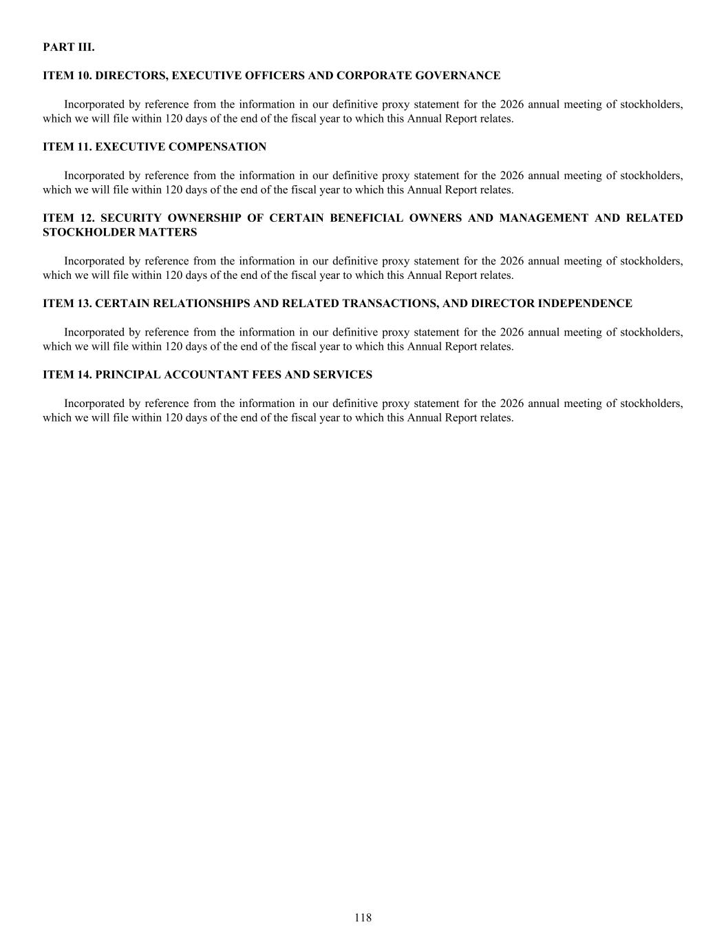 PART III. ITEM 10. DIRECTORS, EXECUTIVE OFFICERS AND CORPORATE GOVERNANCE Incorporated by reference from the information in our definitive proxy statement for the 2026 annual meeting of stockholders, which we will file within 120 days of the end of the fiscal year to which this Annual Report relates. ITEM 11. EXECUTIVE COMPENSATION Incorporated by reference from the information in our definitive proxy statement for the 2026 annual meeting of stockholders, which we will file within 120 days of the end of the fiscal year to which this Annual Report relates. ITEM 12. SECURITY OWNERSHIP OF CERTAIN BENEFICIAL OWNERS AND MANAGEMENT AND RELATED STOCKHOLDER MATTERS Incorporated by reference from the information in our definitive proxy statement for the 2026 annual meeting of stockholders, which we will file within 120 days of the end of the fiscal year to which this Annual Report relates. ITEM 13. CERTAIN RELATIONSHIPS AND RELATED TRANSACTIONS, AND DIRECTOR INDEPENDENCE Incorporated by reference from the information in our definitive proxy statement for the 2026 annual meeting of stockholders, which we will file within 120 days of the end of the fiscal year to which this Annual Report relates. ITEM 14. PRINCIPAL ACCOUNTANT FEES AND SERVICES Incorporated by reference from the information in our definitive proxy statement for the 2026 annual meeting of stockholders, which we will file within 120 days of the end of the fiscal year to which this Annual Report relates. 118