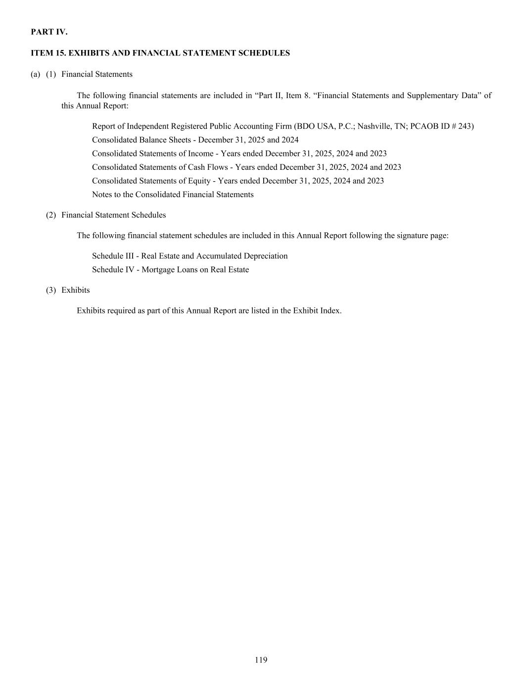 The following financial statements are included in “Part II, Item 8. “Financial Statements and Supplementary Data” of this Annual Report: Report of Independent Registered Public Accounting Firm (BDO USA, P.C.; Nashville, TN; PCAOB ID # 243) Consolidated Balance Sheets - December 31, 2025 and 2024 Consolidated Statements of Income - Years ended December 31, 2025, 2024 and 2023 Consolidated Statements of Cash Flows - Years ended December 31, 2025, 2024 and 2023 Consolidated Statements of Equity - Years ended December 31, 2025, 2024 and 2023 Notes to the Consolidated Financial Statements (2) Financial Statement Schedules The following financial statement schedules are included in this Annual Report following the signature page: Schedule III - Real Estate and Accumulated Depreciation Schedule IV - Mortgage Loans on Real Estate (3) Exhibits Exhibits required as part of this Annual Report are listed in the Exhibit Index. PART IV. ITEM 15. EXHIBITS AND FINANCIAL STATEMENT SCHEDULES (a) (1) Financial Statements 119