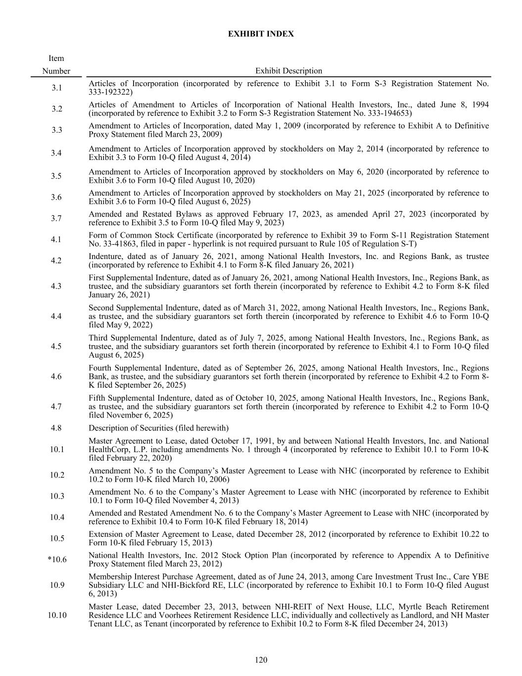 EXHIBIT INDEX 3.1 Articles of Incorporation (incorporated by reference to Exhibit 3.1 to Form S-3 Registration Statement No. 333-192322) 3.2 Articles of Amendment to Articles of Incorporation of National Health Investors, Inc., dated June 8, 1994 (incorporated by reference to Exhibit 3.2 to Form S-3 Registration Statement No. 333-194653) 3.3 Amendment to Articles of Incorporation, dated May 1, 2009 (incorporated by reference to Exhibit A to Definitive Proxy Statement filed March 23, 2009) 3.4 Amendment to Articles of Incorporation approved by stockholders on May 2, 2014 (incorporated by reference to Exhibit 3.3 to Form 10-Q filed August 4, 2014) 3.5 Amendment to Articles of Incorporation approved by stockholders on May 6, 2020 (incorporated by reference to Exhibit 3.6 to Form 10-Q filed August 10, 2020) 3.6 Amendment to Articles of Incorporation approved by stockholders on May 21, 2025 (incorporated by reference to Exhibit 3.6 to Form 10-Q filed August 6, 2025) 3.7 Amended and Restated Bylaws as approved February 17, 2023, as amended April 27, 2023 (incorporated by reference to Exhibit 3.5 to Form 10-Q filed May 9, 2023) 4.1 Form of Common Stock Certificate (incorporated by reference to Exhibit 39 to Form S-11 Registration Statement No. 33-41863, filed in paper - hyperlink is not required pursuant to Rule 105 of Regulation S-T) 4.2 Indenture, dated as of January 26, 2021, among National Health Investors, Inc. and Regions Bank, as trustee (incorporated by reference to Exhibit 4.1 to Form 8-K filed January 26, 2021) 4.3 First Supplemental Indenture, dated as of January 26, 2021, among National Health Investors, Inc., Regions Bank, as trustee, and the subsidiary guarantors set forth therein (incorporated by reference to Exhibit 4.2 to Form 8-K filed January 26, 2021) 4.4 Second Supplemental Indenture, dated as of March 31, 2022, among National Health Investors, Inc., Regions Bank, as trustee, and the subsidiary guarantors set forth therein (incorporated by reference to Exhibit 4.6 to Form 10-Q filed May 9, 2022) 4.5 Third Supplemental Indenture, dated as of July 7, 2025, among National Health Investors, Inc., Regions Bank, as trustee, and the subsidiary guarantors set forth therein (incorporated by reference to Exhibit 4.1 to Form 10-Q filed August 6, 2025) 4.6 Fourth Supplemental Indenture, dated as of September 26, 2025, among National Health Investors, Inc., Regions Bank, as trustee, and the subsidiary guarantors set forth therein (incorporated by reference to Exhibit 4.2 to Form 8- K filed September 26, 2025) 4.7 Fifth Supplemental Indenture, dated as of October 10, 2025, among National Health Investors, Inc., Regions Bank, as trustee, and the subsidiary guarantors set forth therein (incorporated by reference to Exhibit 4.2 to Form 10-Q filed November 6, 2025) 4.8 Description of Securities (filed herewith) 10.1 Master Agreement to Lease, dated October 17, 1991, by and between National Health Investors, Inc. and National HealthCorp, L.P. including amendments No. 1 through 4 (incorporated by reference to Exhibit 10.1 to Form 10-K filed February 22, 2020) 10.2 Amendment No. 5 to the Company’s Master Agreement to Lease with NHC (incorporated by reference to Exhibit 10.2 to Form 10-K filed March 10, 2006) 10.3 Amendment No. 6 to the Company’s Master Agreement to Lease with NHC (incorporated by reference to Exhibit 10.1 to Form 10-Q filed November 4, 2013) 10.4 Amended and Restated Amendment No. 6 to the Company’s Master Agreement to Lease with NHC (incorporated by reference to Exhibit 10.4 to Form 10-K filed February 18, 2014) 10.5 Extension of Master Agreement to Lease, dated December 28, 2012 (incorporated by reference to Exhibit 10.22 to Form 10-K filed February 15, 2013) *10.6 National Health Investors, Inc. 2012 Stock Option Plan (incorporated by reference to Appendix A to Definitive Proxy Statement filed March 23, 2012) 10.9 Membership Interest Purchase Agreement, dated as of June 24, 2013, among Care Investment Trust Inc., Care YBE Subsidiary LLC and NHI-Bickford RE, LLC (incorporated by reference to Exhibit 10.1 to Form 10-Q filed August 6, 2013) 10.10 Master Lease, dated December 23, 2013, between NHI-REIT of Next House, LLC, Myrtle Beach Retirement Residence LLC and Voorhees Retirement Residence LLC, individually and collectively as Landlord, and NH Master Tenant LLC, as Tenant (incorporated by reference to Exhibit 10.2 to Form 8-K filed December 24, 2013) Item Number Exhibit Description 120