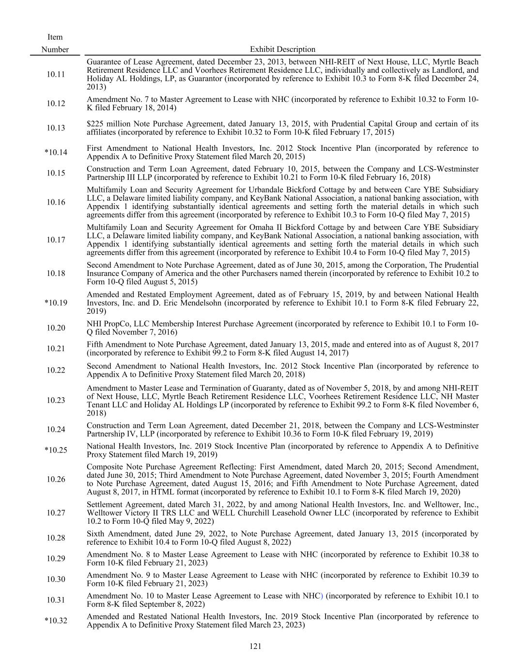 10.11 Guarantee of Lease Agreement, dated December 23, 2013, between NHI-REIT of Next House, LLC, Myrtle Beach Retirement Residence LLC and Voorhees Retirement Residence LLC, individually and collectively as Landlord, and Holiday AL Holdings, LP, as Guarantor (incorporated by reference to Exhibit 10.3 to Form 8-K filed December 24, 2013) 10.12 Amendment No. 7 to Master Agreement to Lease with NHC (incorporated by reference to Exhibit 10.32 to Form 10- K filed February 18, 2014) 10.13 $225 million Note Purchase Agreement, dated January 13, 2015, with Prudential Capital Group and certain of its affiliates (incorporated by reference to Exhibit 10.32 to Form 10-K filed February 17, 2015) *10.14 First Amendment to National Health Investors, Inc. 2012 Stock Incentive Plan (incorporated by reference to Appendix A to Definitive Proxy Statement filed March 20, 2015) 10.15 Construction and Term Loan Agreement, dated February 10, 2015, between the Company and LCS-Westminster Partnership III LLP (incorporated by reference to Exhibit 10.21 to Form 10-K filed February 16, 2018) 10.16 Multifamily Loan and Security Agreement for Urbandale Bickford Cottage by and between Care YBE Subsidiary LLC, a Delaware limited liability company, and KeyBank National Association, a national banking association, with Appendix 1 identifying substantially identical agreements and setting forth the material details in which such agreements differ from this agreement (incorporated by reference to Exhibit 10.3 to Form 10-Q filed May 7, 2015) 10.17 Multifamily Loan and Security Agreement for Omaha II Bickford Cottage by and between Care YBE Subsidiary LLC, a Delaware limited liability company, and KeyBank National Association, a national banking association, with Appendix 1 identifying substantially identical agreements and setting forth the material details in which such agreements differ from this agreement (incorporated by reference to Exhibit 10.4 to Form 10-Q filed May 7, 2015) 10.18 Second Amendment to Note Purchase Agreement, dated as of June 30, 2015, among the Corporation, The Prudential Insurance Company of America and the other Purchasers named therein (incorporated by reference to Exhibit 10.2 to Form 10-Q filed August 5, 2015) *10.19 Amended and Restated Employment Agreement, dated as of February 15, 2019, by and between National Health Investors, Inc. and D. Eric Mendelsohn (incorporated by reference to Exhibit 10.1 to Form 8-K filed February 22, 2019) 10.20 NHI PropCo, LLC Membership Interest Purchase Agreement (incorporated by reference to Exhibit 10.1 to Form 10- Q filed November 7, 2016) 10.21 Fifth Amendment to Note Purchase Agreement, dated January 13, 2015, made and entered into as of August 8, 2017 (incorporated by reference to Exhibit 99.2 to Form 8-K filed August 14, 2017) 10.22 Second Amendment to National Health Investors, Inc. 2012 Stock Incentive Plan (incorporated by reference to Appendix A to Definitive Proxy Statement filed March 20, 2018) 10.23 Amendment to Master Lease and Termination of Guaranty, dated as of November 5, 2018, by and among NHI-REIT of Next House, LLC, Myrtle Beach Retirement Residence LLC, Voorhees Retirement Residence LLC, NH Master Tenant LLC and Holiday AL Holdings LP (incorporated by reference to Exhibit 99.2 to Form 8-K filed November 6, 2018) 10.24 Construction and Term Loan Agreement, dated December 21, 2018, between the Company and LCS-Westminster Partnership IV, LLP (incorporated by reference to Exhibit 10.36 to Form 10-K filed February 19, 2019) *10.25 National Health Investors, Inc. 2019 Stock Incentive Plan (incorporated by reference to Appendix A to Definitive Proxy Statement filed March 19, 2019) 10.26 Composite Note Purchase Agreement Reflecting: First Amendment, dated March 20, 2015; Second Amendment, dated June 30, 2015; Third Amendment to Note Purchase Agreement, dated November 3, 2015; Fourth Amendment to Note Purchase Agreement, dated August 15, 2016; and Fifth Amendment to Note Purchase Agreement, dated August 8, 2017, in HTML format (incorporated by reference to Exhibit 10.1 to Form 8-K filed March 19, 2020) 10.27 Settlement Agreement, dated March 31, 2022, by and among National Health Investors, Inc. and Welltower, Inc., Welltower Victory II TRS LLC and WELL Churchill Leasehold Owner LLC (incorporated by reference to Exhibit 10.2 to Form 10-Q filed May 9, 2022) 10.28 Sixth Amendment, dated June 29, 2022, to Note Purchase Agreement, dated January 13, 2015 (incorporated by reference to Exhibit 10.4 to Form 10-Q filed August 8, 2022) 10.29 Amendment No. 8 to Master Lease Agreement to Lease with NHC (incorporated by reference to Exhibit 10.38 to Form 10-K filed February 21, 2023) 10.30 Amendment No. 9 to Master Lease Agreement to Lease with NHC (incorporated by reference to Exhibit 10.39 to Form 10-K filed February 21, 2023) 10.31 Amendment No. 10 to Master Lease Agreement to Lease with NHC) (incorporated by reference to Exhibit 10.1 to Form 8-K filed September 8, 2022) *10.32 Amended and Restated National Health Investors, Inc. 2019 Stock Incentive Plan (incorporated by reference to Appendix A to Definitive Proxy Statement filed March 23, 2023) Item Number Exhibit Description 121