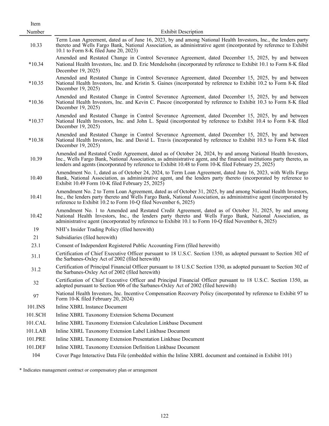 10.33 Term Loan Agreement, dated as of June 16, 2023, by and among National Health Investors, Inc., the lenders party thereto and Wells Fargo Bank, National Association, as administrative agent (incorporated by reference to Exhibit 10.1 to Form 8-K filed June 20, 2023) *10.34 Amended and Restated Change in Control Severance Agreement, dated December 15, 2025, by and between National Health Investors, Inc. and D. Eric Mendelsohn (incorporated by reference to Exhibit 10.1 to Form 8-K filed December 19, 2025) *10.35 Amended and Restated Change in Control Severance Agreement, dated December 15, 2025, by and between National Health Investors, Inc. and Kristin S. Gaines (incorporated by reference to Exhibit 10.2 to Form 8-K filed December 19, 2025) *10.36 Amended and Restated Change in Control Severance Agreement, dated December 15, 2025, by and between National Health Investors, Inc. and Kevin C. Pascoe (incorporated by reference to Exhibit 10.3 to Form 8-K filed December 19, 2025) *10.37 Amended and Restated Change in Control Severance Agreement, dated December 15, 2025, by and between National Health Investors, Inc. and John L. Spaid (incorporated by reference to Exhibit 10.4 to Form 8-K filed December 19, 2025) *10.38 Amended and Restated Change in Control Severance Agreement, dated December 15, 2025, by and between National Health Investors, Inc. and David L. Travis (incorporated by reference to Exhibit 10.5 to Form 8-K filed December 19, 2025) 10.39 Amended and Restated Credit Agreement, dated as of October 24, 2024, by and among National Health Investors, Inc., Wells Fargo Bank, National Association, as administrative agent, and the financial institutions party thereto, as lenders and agents (incorporated by reference to Exhibit 10.48 to Form 10-K filed February 25, 2025) 10.40 Amendment No. 1, dated as of October 24, 2024, to Term Loan Agreement, dated June 16, 2023, with Wells Fargo Bank, National Association, as administrative agent, and the lenders party thereto (incorporated by reference to Exhibit 10.49 Form 10-K filed February 25, 2025) 10.41 Amendment No. 2 to Term Loan Agreement, dated as of October 31, 2025, by and among National Health Investors, Inc., the lenders party thereto and Wells Fargo Bank, National Association, as administrative agent (incorporated by reference to Exhibit 10.2 to Form 10-Q filed November 6, 2025) 10.42 Amendment No. 1 to Amended and Restated Credit Agreement, dated as of October 31, 2025, by and among National Health Investors, Inc., the lenders party thereto and Wells Fargo Bank, National Association, as administrative agent (incorporated by reference to Exhibit 10.1 to Form 10-Q filed November 6, 2025) 19 NHI’s Insider Trading Policy (filed herewith) 21 Subsidiaries (filed herewith) 23.1 Consent of Independent Registered Public Accounting Firm (filed herewith) 31.1 Certification of Chief Executive Officer pursuant to 18 U.S.C. Section 1350, as adopted pursuant to Section 302 of the Sarbanes-Oxley Act of 2002 (filed herewith) 31.2 Certification of Principal Financial Officer pursuant to 18 U.S.C Section 1350, as adopted pursuant to Section 302 of the Sarbanes-Oxley Act of 2002 (filed herewith) 32 Certification of Chief Executive Officer and Principal Financial Officer pursuant to 18 U.S.C. Section 1350, as adopted pursuant to Section 906 of the Sarbanes-Oxley Act of 2002 (filed herewith) 97 National Health Investors, Inc. Incentive Compensation Recovery Policy (incorporated by reference to Exhibit 97 to Form 10-K filed February 20, 2024) 101.INS Inline XBRL Instance Document 101.SCH Inline XBRL Taxonomy Extension Schema Document 101.CAL Inline XBRL Taxonomy Extension Calculation Linkbase Document 101.LAB Inline XBRL Taxonomy Extension Label Linkbase Document 101.PRE Inline XBRL Taxonomy Extension Presentation Linkbase Document 101.DEF Inline XBRL Taxonomy Extension Definition Linkbase Document 104 Cover Page Interactive Data File (embedded within the Inline XBRL document and contained in Exhibit 101) Item Number Exhibit Description * Indicates management contract or compensatory plan or arrangement 122