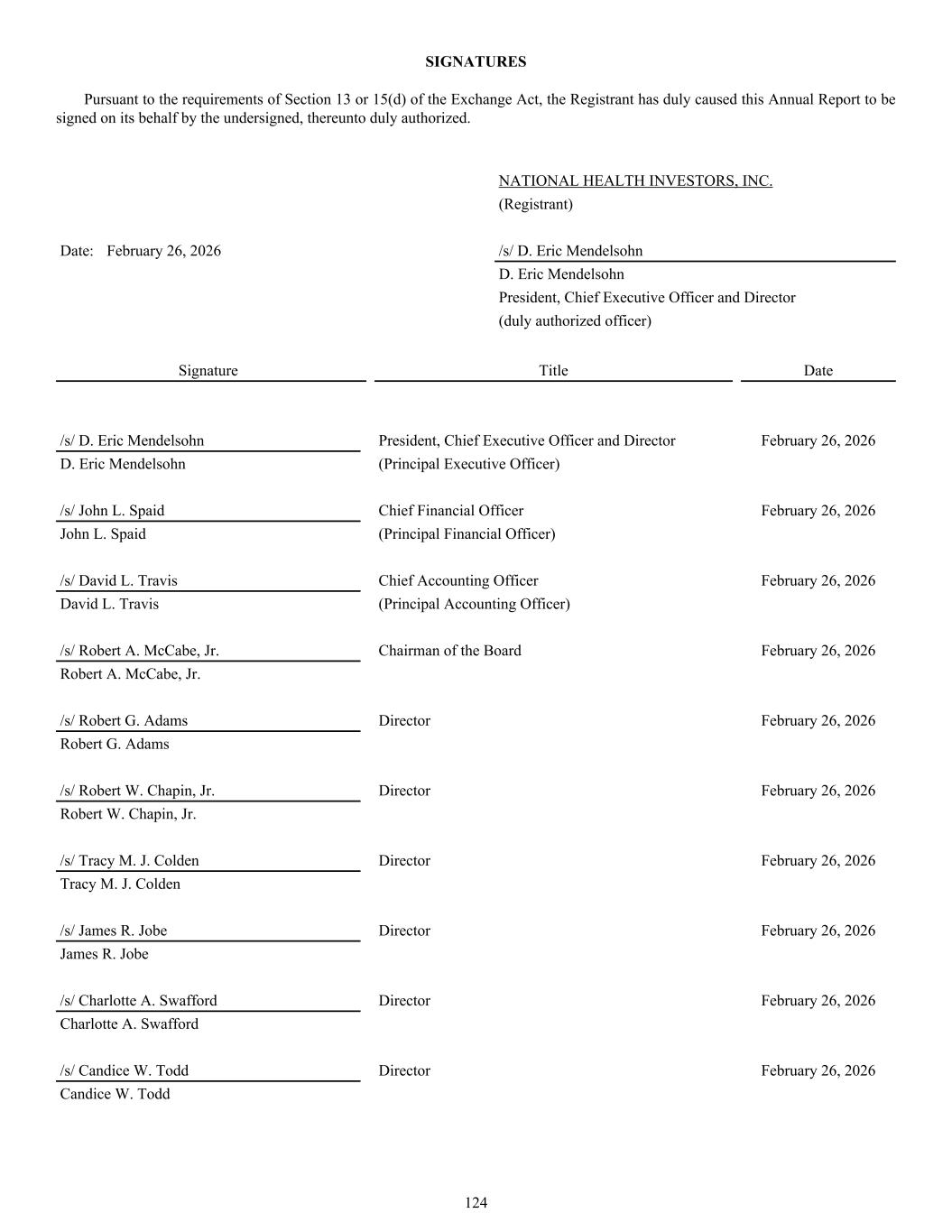 NATIONAL HEALTH INVESTORS, INC. (Registrant) Date: February 26, 2026 /s/ D. Eric Mendelsohn D. Eric Mendelsohn President, Chief Executive Officer and Director (duly authorized officer) Signature Title Date /s/ D. Eric Mendelsohn President, Chief Executive Officer and Director February 26, 2026 D. Eric Mendelsohn (Principal Executive Officer) /s/ John L. Spaid Chief Financial Officer February 26, 2026 John L. Spaid (Principal Financial Officer) /s/ David L. Travis Chief Accounting Officer February 26, 2026 David L. Travis (Principal Accounting Officer) /s/ Robert A. McCabe, Jr. Chairman of the Board February 26, 2026 Robert A. McCabe, Jr. /s/ Robert G. Adams Director February 26, 2026 Robert G. Adams /s/ Robert W. Chapin, Jr. Director February 26, 2026 Robert W. Chapin, Jr. /s/ Tracy M. J. Colden Director February 26, 2026 Tracy M. J. Colden /s/ James R. Jobe Director February 26, 2026 James R. Jobe /s/ Charlotte A. Swafford Director February 26, 2026 Charlotte A. Swafford /s/ Candice W. Todd Director February 26, 2026 Candice W. Todd SIGNATURES Pursuant to the requirements of Section 13 or 15(d) of the Exchange Act, the Registrant has duly caused this Annual Report to be signed on its behalf by the undersigned, thereunto duly authorized. 124