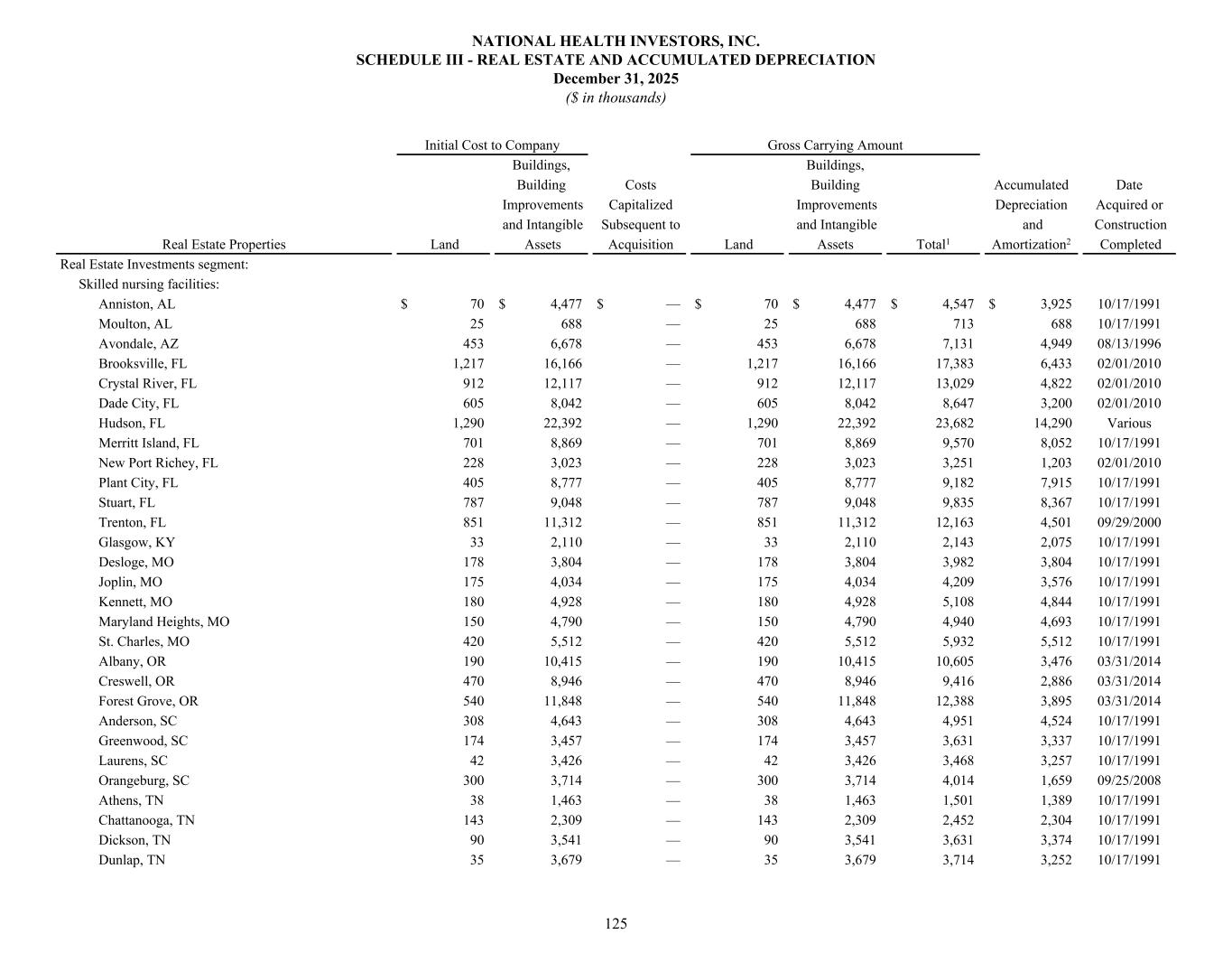 Real Estate Investments segment: Skilled nursing facilities: Anniston, AL $ 70 $ 4,477 $ — $ 70 $ 4,477 $ 4,547 $ 3,925 10/17/1991 Moulton, AL 25 688 — 25 688 713 688 10/17/1991 Avondale, AZ 453 6,678 — 453 6,678 7,131 4,949 08/13/1996 Brooksville, FL 1,217 16,166 — 1,217 16,166 17,383 6,433 02/01/2010 Crystal River, FL 912 12,117 — 912 12,117 13,029 4,822 02/01/2010 Dade City, FL 605 8,042 — 605 8,042 8,647 3,200 02/01/2010 Hudson, FL 1,290 22,392 — 1,290 22,392 23,682 14,290 Various Merritt Island, FL 701 8,869 — 701 8,869 9,570 8,052 10/17/1991 New Port Richey, FL 228 3,023 — 228 3,023 3,251 1,203 02/01/2010 Plant City, FL 405 8,777 — 405 8,777 9,182 7,915 10/17/1991 Stuart, FL 787 9,048 — 787 9,048 9,835 8,367 10/17/1991 Trenton, FL 851 11,312 — 851 11,312 12,163 4,501 09/29/2000 Glasgow, KY 33 2,110 — 33 2,110 2,143 2,075 10/17/1991 Desloge, MO 178 3,804 — 178 3,804 3,982 3,804 10/17/1991 Joplin, MO 175 4,034 — 175 4,034 4,209 3,576 10/17/1991 Kennett, MO 180 4,928 — 180 4,928 5,108 4,844 10/17/1991 Maryland Heights, MO 150 4,790 — 150 4,790 4,940 4,693 10/17/1991 St. Charles, MO 420 5,512 — 420 5,512 5,932 5,512 10/17/1991 Albany, OR 190 10,415 — 190 10,415 10,605 3,476 03/31/2014 Creswell, OR 470 8,946 — 470 8,946 9,416 2,886 03/31/2014 Forest Grove, OR 540 11,848 — 540 11,848 12,388 3,895 03/31/2014 Anderson, SC 308 4,643 — 308 4,643 4,951 4,524 10/17/1991 Greenwood, SC 174 3,457 — 174 3,457 3,631 3,337 10/17/1991 Laurens, SC 42 3,426 — 42 3,426 3,468 3,257 10/17/1991 Orangeburg, SC 300 3,714 — 300 3,714 4,014 1,659 09/25/2008 Athens, TN 38 1,463 — 38 1,463 1,501 1,389 10/17/1991 Chattanooga, TN 143 2,309 — 143 2,309 2,452 2,304 10/17/1991 Dickson, TN 90 3,541 — 90 3,541 3,631 3,374 10/17/1991 Dunlap, TN 35 3,679 — 35 3,679 3,714 3,252 10/17/1991 Initial Cost to Company Gross Carrying Amount Buildings, Buildings, Building Costs Building Accumulated Date Improvements Capitalized Improvements Depreciation Acquired or and Intangible Subsequent to and Intangible and Construction Real Estate Properties Land Assets Acquisition Land Assets Total1 Amortization2 Completed NATIONAL HEALTH INVESTORS, INC. SCHEDULE III - REAL ESTATE AND ACCUMULATED DEPRECIATION December 31, 2025 ($ in thousands) 125
