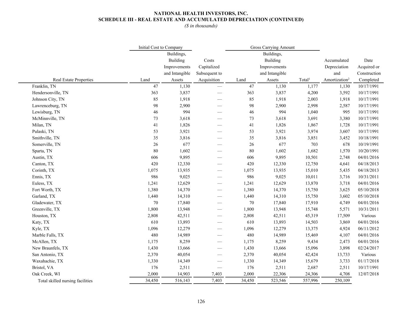 Franklin, TN 47 1,130 — 47 1,130 1,177 1,130 10/17/1991 Hendersonville, TN 363 3,837 — 363 3,837 4,200 3,592 10/17/1991 Johnson City, TN 85 1,918 — 85 1,918 2,003 1,918 10/17/1991 Lawrenceburg, TN 98 2,900 — 98 2,900 2,998 2,587 10/17/1991 Lewisburg, TN 46 994 — 46 994 1,040 995 10/17/1991 McMinnville, TN 73 3,618 — 73 3,618 3,691 3,380 10/17/1991 Milan, TN 41 1,826 — 41 1,826 1,867 1,728 10/17/1991 Pulaski, TN 53 3,921 — 53 3,921 3,974 3,607 10/17/1991 Smithville, TN 35 3,816 — 35 3,816 3,851 3,452 10/18/1991 Somerville, TN 26 677 — 26 677 703 678 10/19/1991 Sparta, TN 80 1,602 — 80 1,602 1,682 1,570 10/20/1991 Austin, TX 606 9,895 — 606 9,895 10,501 2,748 04/01/2016 Canton, TX 420 12,330 — 420 12,330 12,750 4,641 04/18/2013 Corinth, TX 1,075 13,935 — 1,075 13,935 15,010 5,435 04/18/2013 Ennis, TX 986 9,025 — 986 9,025 10,011 3,716 10/31/2011 Euless, TX 1,241 12,629 — 1,241 12,629 13,870 3,718 04/01/2016 Fort Worth, TX 1,380 14,370 — 1,380 14,370 15,750 3,625 05/10/2018 Garland, TX 1,440 14,310 — 1,440 14,310 15,750 3,602 05/10/2018 Gladewater, TX 70 17,840 — 70 17,840 17,910 4,749 04/01/2016 Greenville, TX 1,800 13,948 — 1,800 13,948 15,748 5,571 10/31/2011 Houston, TX 2,808 42,511 — 2,808 42,511 45,319 17,509 Various Katy, TX 610 13,893 — 610 13,893 14,503 3,869 04/01/2016 Kyle, TX 1,096 12,279 — 1,096 12,279 13,375 4,924 06/11/2012 Marble Falls, TX 480 14,989 — 480 14,989 15,469 4,107 04/01/2016 McAllen, TX 1,175 8,259 — 1,175 8,259 9,434 2,473 04/01/2016 New Braunfels, TX 1,430 13,666 — 1,430 13,666 15,096 3,898 02/24/2017 San Antonio, TX 2,370 40,054 — 2,370 40,054 42,424 13,733 Various Waxahachie, TX 1,330 14,349 — 1,330 14,349 15,679 3,733 01/17/2018 Bristol, VA 176 2,511 — 176 2,511 2,687 2,511 10/17/1991 Oak Creek, WI 2,000 14,903 7,403 2,000 22,306 24,306 4,708 12/07/2018 Total skilled nursing facilities 34,450 516,143 7,403 34,450 523,546 557,996 250,109 Initial Cost to Company Gross Carrying Amount Buildings, Buildings, Building Costs Building Accumulated Date Improvements Capitalized Improvements Depreciation Acquired or and Intangible Subsequent to and Intangible and Construction Real Estate Properties Land Assets Acquisition Land Assets Total1 Amortization2 Completed NATIONAL HEALTH INVESTORS, INC. SCHEDULE III - REAL ESTATE AND ACCUMULATED DEPRECIATION (CONTINUED) ($ in thousands) 126