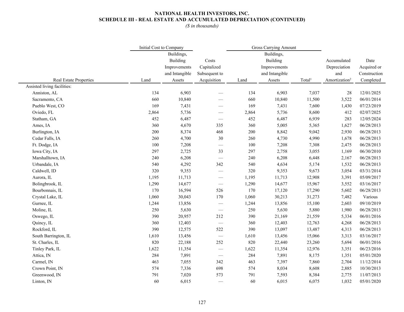 Assisted living facilities: Anniston, AL 134 6,903 — 134 6,903 7,037 28 12/01/2025 Sacramento, CA 660 10,840 — 660 10,840 11,500 3,522 06/01/2014 Pueblo West, CO 169 7,431 — 169 7,431 7,600 1,430 07/23/2019 Oviedo, FL 2,864 5,736 — 2,864 5,736 8,600 412 02/07/2025 Statham, GA 452 6,487 — 452 6,487 6,939 283 12/05/2024 Ames, IA 360 4,670 335 360 5,005 5,365 1,627 06/28/2013 Burlington, IA 200 8,374 468 200 8,842 9,042 2,930 06/28/2013 Cedar Falls, IA 260 4,700 30 260 4,730 4,990 1,678 06/28/2013 Ft. Dodge, IA 100 7,208 — 100 7,208 7,308 2,475 06/28/2013 Iowa City, IA 297 2,725 33 297 2,758 3,055 1,169 06/30/2010 Marshalltown, IA 240 6,208 — 240 6,208 6,448 2,167 06/28/2013 Urbandale, IA 540 4,292 342 540 4,634 5,174 1,532 06/28/2013 Caldwell, ID 320 9,353 — 320 9,353 9,673 3,054 03/31/2014 Aurora, IL 1,195 11,713 — 1,195 11,713 12,908 3,391 05/09/2017 Bolingbrook, IL 1,290 14,677 — 1,290 14,677 15,967 3,552 03/16/2017 Bourbonnais, IL 170 16,594 526 170 17,120 17,290 5,602 06/28/2013 Crystal Lake, IL 1,060 30,043 170 1,060 30,213 31,273 7,482 Various Gurnee, IL 1,244 13,856 — 1,244 13,856 15,100 2,603 09/10/2019 Moline, IL 250 5,630 — 250 5,630 5,880 1,980 06/28/2013 Oswego, IL 390 20,957 212 390 21,169 21,559 5,334 06/01/2016 Quincy, IL 360 12,403 — 360 12,403 12,763 4,268 06/28/2013 Rockford, IL 390 12,575 522 390 13,097 13,487 4,313 06/28/2013 South Barrington, IL 1,610 13,456 — 1,610 13,456 15,066 3,313 03/16/2017 St. Charles, IL 820 22,188 252 820 22,440 23,260 5,694 06/01/2016 Tinley Park, IL 1,622 11,354 — 1,622 11,354 12,976 3,351 06/23/2016 Attica, IN 284 7,891 — 284 7,891 8,175 1,351 05/01/2020 Carmel, IN 463 7,055 342 463 7,397 7,860 2,704 11/12/2014 Crown Point, IN 574 7,336 698 574 8,034 8,608 2,885 10/30/2013 Greenwood, IN 791 7,020 573 791 7,593 8,384 2,775 11/07/2013 Linton, IN 60 6,015 — 60 6,015 6,075 1,032 05/01/2020 Initial Cost to Company Gross Carrying Amount Buildings, Buildings, Building Costs Building Accumulated Date Improvements Capitalized Improvements Depreciation Acquired or and Intangible Subsequent to and Intangible and Construction Real Estate Properties Land Assets Acquisition Land Assets Total1 Amortization2 Completed NATIONAL HEALTH INVESTORS, INC. SCHEDULE III - REAL ESTATE AND ACCUMULATED DEPRECIATION (CONTINUED) ($ in thousands) 127