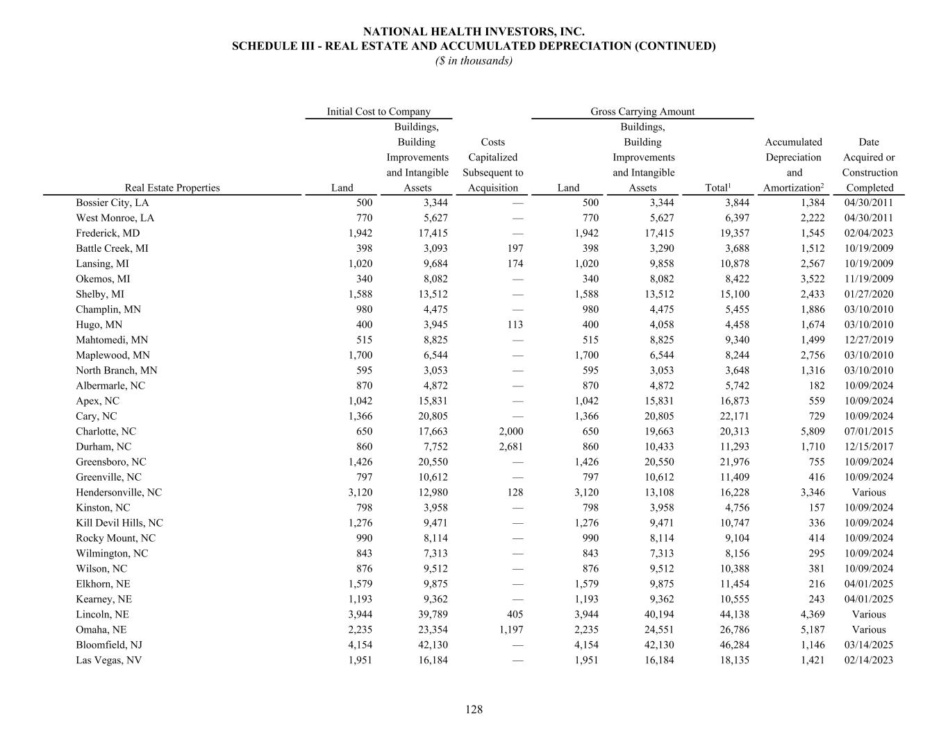 Bossier City, LA 500 3,344 — 500 3,344 3,844 1,384 04/30/2011 West Monroe, LA 770 5,627 — 770 5,627 6,397 2,222 04/30/2011 Frederick, MD 1,942 17,415 — 1,942 17,415 19,357 1,545 02/04/2023 Battle Creek, MI 398 3,093 197 398 3,290 3,688 1,512 10/19/2009 Lansing, MI 1,020 9,684 174 1,020 9,858 10,878 2,567 10/19/2009 Okemos, MI 340 8,082 — 340 8,082 8,422 3,522 11/19/2009 Shelby, MI 1,588 13,512 — 1,588 13,512 15,100 2,433 01/27/2020 Champlin, MN 980 4,475 — 980 4,475 5,455 1,886 03/10/2010 Hugo, MN 400 3,945 113 400 4,058 4,458 1,674 03/10/2010 Mahtomedi, MN 515 8,825 — 515 8,825 9,340 1,499 12/27/2019 Maplewood, MN 1,700 6,544 — 1,700 6,544 8,244 2,756 03/10/2010 North Branch, MN 595 3,053 — 595 3,053 3,648 1,316 03/10/2010 Albermarle, NC 870 4,872 — 870 4,872 5,742 182 10/09/2024 Apex, NC 1,042 15,831 — 1,042 15,831 16,873 559 10/09/2024 Cary, NC 1,366 20,805 — 1,366 20,805 22,171 729 10/09/2024 Charlotte, NC 650 17,663 2,000 650 19,663 20,313 5,809 07/01/2015 Durham, NC 860 7,752 2,681 860 10,433 11,293 1,710 12/15/2017 Greensboro, NC 1,426 20,550 — 1,426 20,550 21,976 755 10/09/2024 Greenville, NC 797 10,612 — 797 10,612 11,409 416 10/09/2024 Hendersonville, NC 3,120 12,980 128 3,120 13,108 16,228 3,346 Various Kinston, NC 798 3,958 — 798 3,958 4,756 157 10/09/2024 Kill Devil Hills, NC 1,276 9,471 — 1,276 9,471 10,747 336 10/09/2024 Rocky Mount, NC 990 8,114 — 990 8,114 9,104 414 10/09/2024 Wilmington, NC 843 7,313 — 843 7,313 8,156 295 10/09/2024 Wilson, NC 876 9,512 — 876 9,512 10,388 381 10/09/2024 Elkhorn, NE 1,579 9,875 — 1,579 9,875 11,454 216 04/01/2025 Kearney, NE 1,193 9,362 — 1,193 9,362 10,555 243 04/01/2025 Lincoln, NE 3,944 39,789 405 3,944 40,194 44,138 4,369 Various Omaha, NE 2,235 23,354 1,197 2,235 24,551 26,786 5,187 Various Bloomfield, NJ 4,154 42,130 — 4,154 42,130 46,284 1,146 03/14/2025 Las Vegas, NV 1,951 16,184 — 1,951 16,184 18,135 1,421 02/14/2023 Initial Cost to Company Gross Carrying Amount Buildings, Buildings, Building Costs Building Accumulated Date Improvements Capitalized Improvements Depreciation Acquired or and Intangible Subsequent to and Intangible and Construction Real Estate Properties Land Assets Acquisition Land Assets Total1 Amortization2 Completed NATIONAL HEALTH INVESTORS, INC. SCHEDULE III - REAL ESTATE AND ACCUMULATED DEPRECIATION (CONTINUED) ($ in thousands) 128
