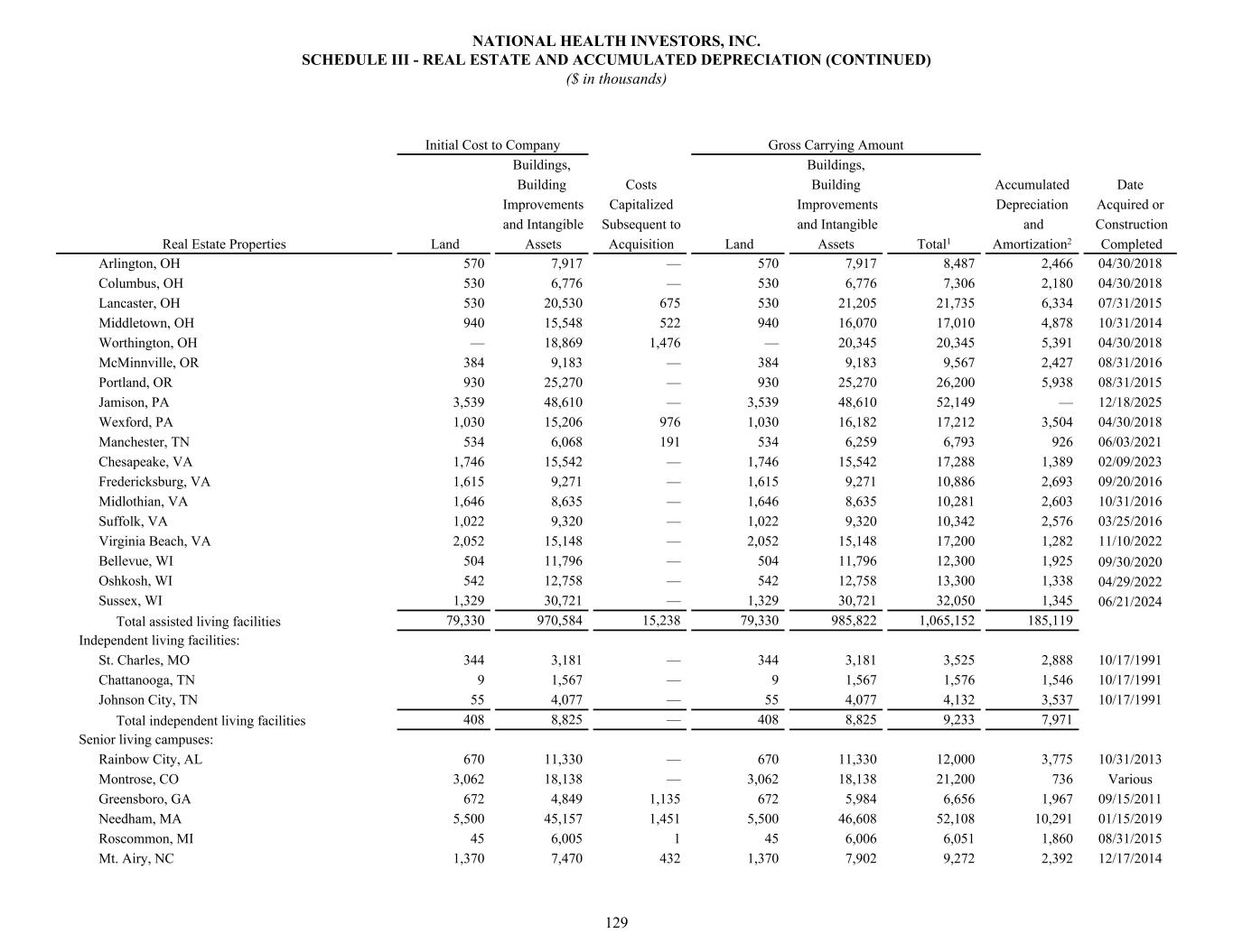 Arlington, OH 570 7,917 — 570 7,917 8,487 2,466 04/30/2018 Columbus, OH 530 6,776 — 530 6,776 7,306 2,180 04/30/2018 Lancaster, OH 530 20,530 675 530 21,205 21,735 6,334 07/31/2015 Middletown, OH 940 15,548 522 940 16,070 17,010 4,878 10/31/2014 Worthington, OH — 18,869 1,476 — 20,345 20,345 5,391 04/30/2018 McMinnville, OR 384 9,183 — 384 9,183 9,567 2,427 08/31/2016 Portland, OR 930 25,270 — 930 25,270 26,200 5,938 08/31/2015 Jamison, PA 3,539 48,610 — 3,539 48,610 52,149 — 12/18/2025 Wexford, PA 1,030 15,206 976 1,030 16,182 17,212 3,504 04/30/2018 Manchester, TN 534 6,068 191 534 6,259 6,793 926 06/03/2021 Chesapeake, VA 1,746 15,542 — 1,746 15,542 17,288 1,389 02/09/2023 Fredericksburg, VA 1,615 9,271 — 1,615 9,271 10,886 2,693 09/20/2016 Midlothian, VA 1,646 8,635 — 1,646 8,635 10,281 2,603 10/31/2016 Suffolk, VA 1,022 9,320 — 1,022 9,320 10,342 2,576 03/25/2016 Virginia Beach, VA 2,052 15,148 — 2,052 15,148 17,200 1,282 11/10/2022 Bellevue, WI 504 11,796 — 504 11,796 12,300 1,925 09/30/2020 Oshkosh, WI 542 12,758 — 542 12,758 13,300 1,338 04/29/2022 Sussex, WI 1,329 30,721 — 1,329 30,721 32,050 1,345 06/21/2024 Total assisted living facilities 79,330 970,584 15,238 79,330 985,822 1,065,152 185,119 Independent living facilities: St. Charles, MO 344 3,181 — 344 3,181 3,525 2,888 10/17/1991 Chattanooga, TN 9 1,567 — 9 1,567 1,576 1,546 10/17/1991 Johnson City, TN 55 4,077 — 55 4,077 4,132 3,537 10/17/1991 Total independent living facilities 408 8,825 — 408 8,825 9,233 7,971 Senior living campuses: Rainbow City, AL 670 11,330 — 670 11,330 12,000 3,775 10/31/2013 Montrose, CO 3,062 18,138 — 3,062 18,138 21,200 736 Various Greensboro, GA 672 4,849 1,135 672 5,984 6,656 1,967 09/15/2011 Needham, MA 5,500 45,157 1,451 5,500 46,608 52,108 10,291 01/15/2019 Roscommon, MI 45 6,005 1 45 6,006 6,051 1,860 08/31/2015 Mt. Airy, NC 1,370 7,470 432 1,370 7,902 9,272 2,392 12/17/2014 Initial Cost to Company Gross Carrying Amount Buildings, Buildings, Building Costs Building Accumulated Date Improvements Capitalized Improvements Depreciation Acquired or and Intangible Subsequent to and Intangible and Construction Real Estate Properties Land Assets Acquisition Land Assets Total1 Amortization2 Completed NATIONAL HEALTH INVESTORS, INC. SCHEDULE III - REAL ESTATE AND ACCUMULATED DEPRECIATION (CONTINUED) ($ in thousands) 129