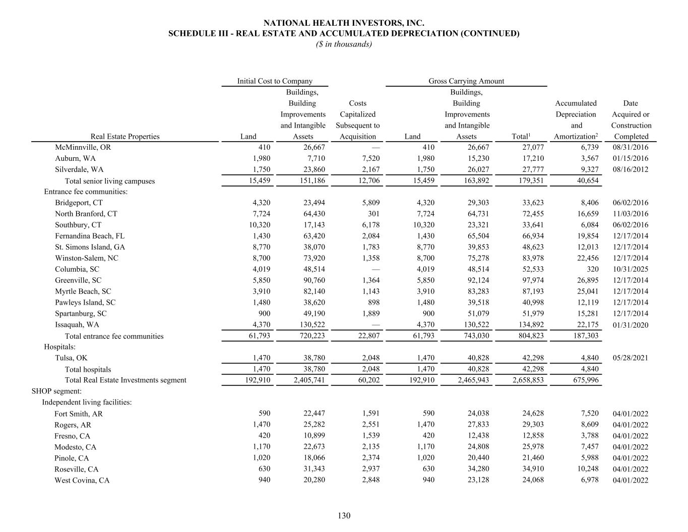 McMinnville, OR 410 26,667 — 410 26,667 27,077 6,739 08/31/2016 Auburn, WA 1,980 7,710 7,520 1,980 15,230 17,210 3,567 01/15/2016 Silverdale, WA 1,750 23,860 2,167 1,750 26,027 27,777 9,327 08/16/2012 Total senior living campuses 15,459 151,186 12,706 15,459 163,892 179,351 40,654 Entrance fee communities: Bridgeport, CT 4,320 23,494 5,809 4,320 29,303 33,623 8,406 06/02/2016 North Branford, CT 7,724 64,430 301 7,724 64,731 72,455 16,659 11/03/2016 Southbury, CT 10,320 17,143 6,178 10,320 23,321 33,641 6,084 06/02/2016 Fernandina Beach, FL 1,430 63,420 2,084 1,430 65,504 66,934 19,854 12/17/2014 St. Simons Island, GA 8,770 38,070 1,783 8,770 39,853 48,623 12,013 12/17/2014 Winston-Salem, NC 8,700 73,920 1,358 8,700 75,278 83,978 22,456 12/17/2014 Columbia, SC 4,019 48,514 — 4,019 48,514 52,533 320 10/31/2025 Greenville, SC 5,850 90,760 1,364 5,850 92,124 97,974 26,895 12/17/2014 Myrtle Beach, SC 3,910 82,140 1,143 3,910 83,283 87,193 25,041 12/17/2014 Pawleys Island, SC 1,480 38,620 898 1,480 39,518 40,998 12,119 12/17/2014 Spartanburg, SC 900 49,190 1,889 900 51,079 51,979 15,281 12/17/2014 Issaquah, WA 4,370 130,522 — 4,370 130,522 134,892 22,175 01/31/2020 Total entrance fee communities 61,793 720,223 22,807 61,793 743,030 804,823 187,303 Hospitals: Tulsa, OK 1,470 38,780 2,048 1,470 40,828 42,298 4,840 05/28/2021 Total hospitals 1,470 38,780 2,048 1,470 40,828 42,298 4,840 Total Real Estate Investments segment 192,910 2,405,741 60,202 192,910 2,465,943 2,658,853 675,996 SHOP segment: Independent living facilities: Fort Smith, AR 590 22,447 1,591 590 24,038 24,628 7,520 04/01/2022 Rogers, AR 1,470 25,282 2,551 1,470 27,833 29,303 8,609 04/01/2022 Fresno, CA 420 10,899 1,539 420 12,438 12,858 3,788 04/01/2022 Modesto, CA 1,170 22,673 2,135 1,170 24,808 25,978 7,457 04/01/2022 Pinole, CA 1,020 18,066 2,374 1,020 20,440 21,460 5,988 04/01/2022 Roseville, CA 630 31,343 2,937 630 34,280 34,910 10,248 04/01/2022 West Covina, CA 940 20,280 2,848 940 23,128 24,068 6,978 04/01/2022 Initial Cost to Company Gross Carrying Amount Buildings, Buildings, Building Costs Building Accumulated Date Improvements Capitalized Improvements Depreciation Acquired or and Intangible Subsequent to and Intangible and Construction Real Estate Properties Land Assets Acquisition Land Assets Total1 Amortization2 Completed NATIONAL HEALTH INVESTORS, INC. SCHEDULE III - REAL ESTATE AND ACCUMULATED DEPRECIATION (CONTINUED) ($ in thousands) 130