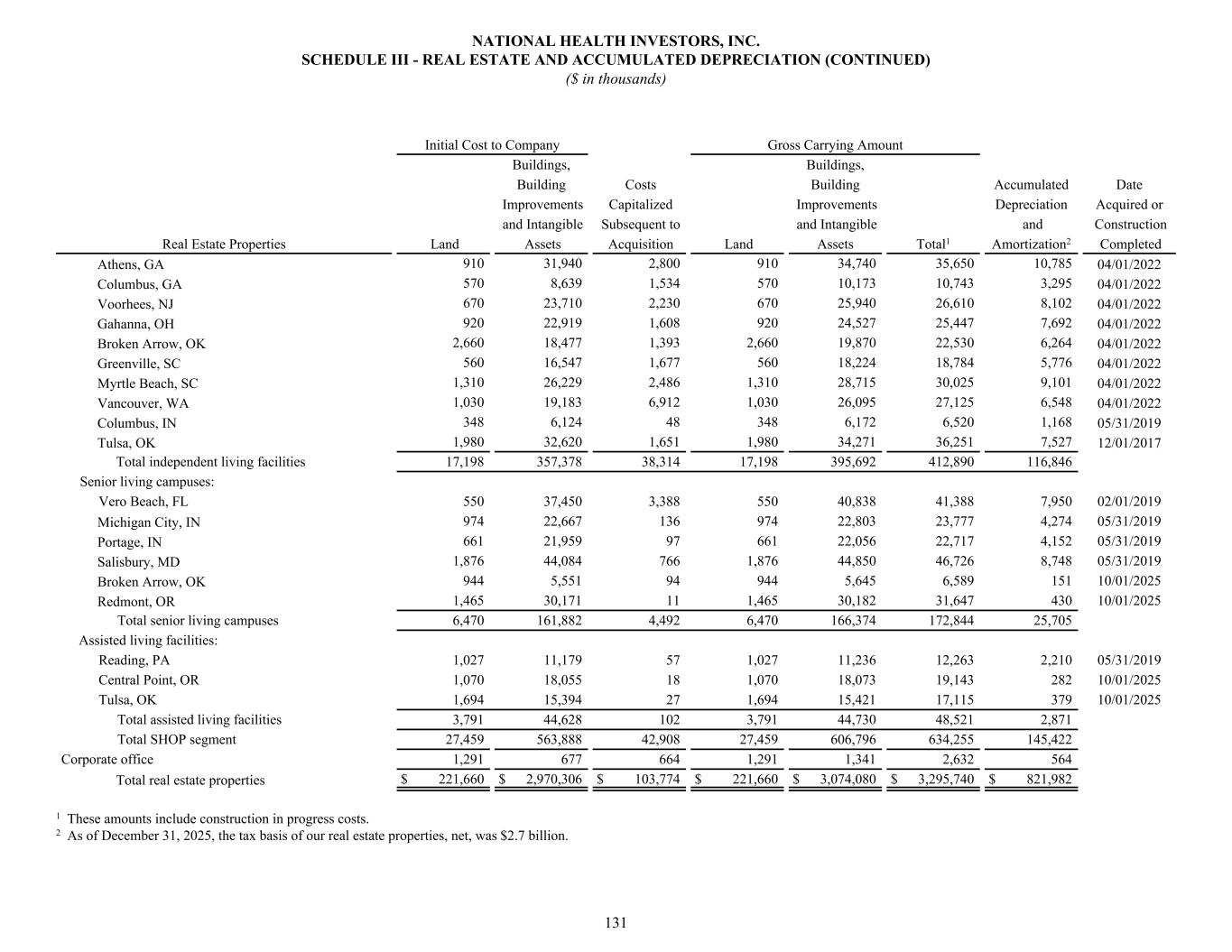 Athens, GA 910 31,940 2,800 910 34,740 35,650 10,785 04/01/2022 Columbus, GA 570 8,639 1,534 570 10,173 10,743 3,295 04/01/2022 Voorhees, NJ 670 23,710 2,230 670 25,940 26,610 8,102 04/01/2022 Gahanna, OH 920 22,919 1,608 920 24,527 25,447 7,692 04/01/2022 Broken Arrow, OK 2,660 18,477 1,393 2,660 19,870 22,530 6,264 04/01/2022 Greenville, SC 560 16,547 1,677 560 18,224 18,784 5,776 04/01/2022 Myrtle Beach, SC 1,310 26,229 2,486 1,310 28,715 30,025 9,101 04/01/2022 Vancouver, WA 1,030 19,183 6,912 1,030 26,095 27,125 6,548 04/01/2022 Columbus, IN 348 6,124 48 348 6,172 6,520 1,168 05/31/2019 Tulsa, OK 1,980 32,620 1,651 1,980 34,271 36,251 7,527 12/01/2017 Total independent living facilities 17,198 357,378 38,314 17,198 395,692 412,890 116,846 Senior living campuses: Vero Beach, FL 550 37,450 3,388 550 40,838 41,388 7,950 02/01/2019 Michigan City, IN 974 22,667 136 974 22,803 23,777 4,274 05/31/2019 Portage, IN 661 21,959 97 661 22,056 22,717 4,152 05/31/2019 Salisbury, MD 1,876 44,084 766 1,876 44,850 46,726 8,748 05/31/2019 Broken Arrow, OK 944 5,551 94 944 5,645 6,589 151 10/01/2025 Redmont, OR 1,465 30,171 11 1,465 30,182 31,647 430 10/01/2025 Total senior living campuses 6,470 161,882 4,492 6,470 166,374 172,844 25,705 Assisted living facilities: Reading, PA 1,027 11,179 57 1,027 11,236 12,263 2,210 05/31/2019 Central Point, OR 1,070 18,055 18 1,070 18,073 19,143 282 10/01/2025 Tulsa, OK 1,694 15,394 27 1,694 15,421 17,115 379 10/01/2025 Total assisted living facilities 3,791 44,628 102 3,791 44,730 48,521 2,871 Total SHOP segment 27,459 563,888 42,908 27,459 606,796 634,255 145,422 Corporate office 1,291 677 664 1,291 1,341 2,632 564 Total real estate properties $ 221,660 $ 2,970,306 $ 103,774 $ 221,660 $ 3,074,080 $ 3,295,740 $ 821,982 Initial Cost to Company Gross Carrying Amount Buildings, Buildings, Building Costs Building Accumulated Date Improvements Capitalized Improvements Depreciation Acquired or and Intangible Subsequent to and Intangible and Construction Real Estate Properties Land Assets Acquisition Land Assets Total1 Amortization2 Completed 1 These amounts include construction in progress costs. 2 As of December 31, 2025, the tax basis of our real estate properties, net, was $2.7 billion. NATIONAL HEALTH INVESTORS, INC. SCHEDULE III - REAL ESTATE AND ACCUMULATED DEPRECIATION (CONTINUED) ($ in thousands) 131