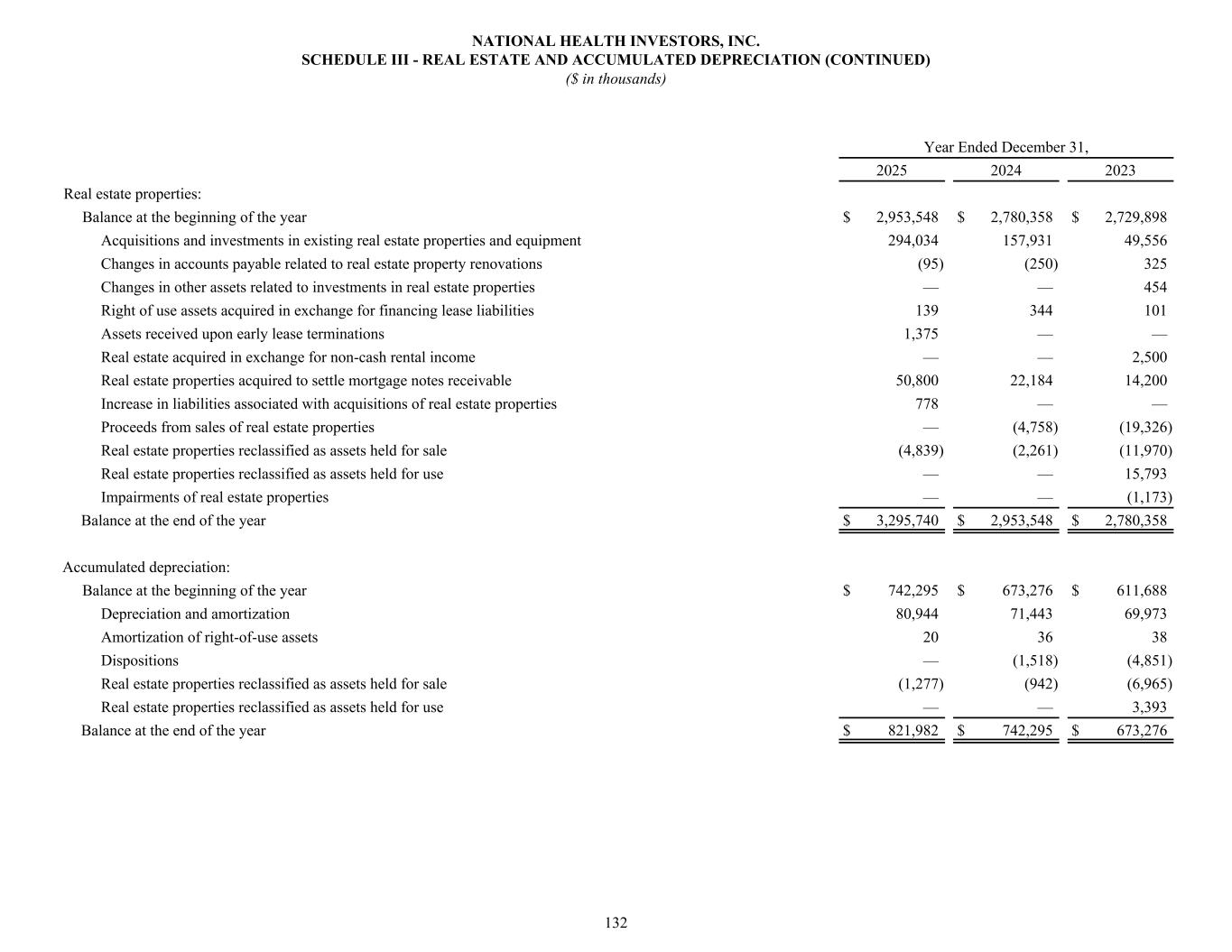 Year Ended December 31, 2025 2024 2023 Real estate properties: Balance at the beginning of the year $ 2,953,548 $ 2,780,358 $ 2,729,898 Acquisitions and investments in existing real estate properties and equipment 294,034 157,931 49,556 Changes in accounts payable related to real estate property renovations (95) (250) 325 Changes in other assets related to investments in real estate properties — — 454 Right of use assets acquired in exchange for financing lease liabilities 139 344 101 Assets received upon early lease terminations 1,375 — — Real estate acquired in exchange for non-cash rental income — — 2,500 Real estate properties acquired to settle mortgage notes receivable 50,800 22,184 14,200 Increase in liabilities associated with acquisitions of real estate properties 778 — — Proceeds from sales of real estate properties — (4,758) (19,326) Real estate properties reclassified as assets held for sale (4,839) (2,261) (11,970) Real estate properties reclassified as assets held for use — — 15,793 Impairments of real estate properties — — (1,173) Balance at the end of the year $ 3,295,740 $ 2,953,548 $ 2,780,358 Accumulated depreciation: Balance at the beginning of the year $ 742,295 $ 673,276 $ 611,688 Depreciation and amortization 80,944 71,443 69,973 Amortization of right-of-use assets 20 36 38 Dispositions — (1,518) (4,851) Real estate properties reclassified as assets held for sale (1,277) (942) (6,965) Real estate properties reclassified as assets held for use — — 3,393 Balance at the end of the year $ 821,982 $ 742,295 $ 673,276 NATIONAL HEALTH INVESTORS, INC. SCHEDULE III - REAL ESTATE AND ACCUMULATED DEPRECIATION (CONTINUED) ($ in thousands) 132