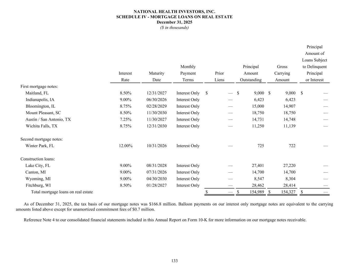 Principal Amount of Loans Subject Monthly Principal Gross to Delinquent Interest Maturity Payment Prior Amount Carrying Principal Rate Date Terms Liens Outstanding Amount or Interest First mortgage notes: Maitland, FL 8.50% 12/31/2027 Interest Only $ — $ 9,000 $ 9,000 $ — Indianapolis, IA 9.00% 06/30/2026 Interest Only — 6,423 6,423 — Bloomington, IL 8.75% 02/28/2029 Interest Only — 15,000 14,907 — Mount Pleasant, SC 8.50% 11/30/2030 Interest Only — 18,750 18,750 — Austin / San Antonio, TX 7.25% 11/30/2027 Interest Only — 14,731 14,748 — Wichita Falls, TX 8.75% 12/31/2030 Interest Only — 11,250 11,139 — Second mortgage notes: Winter Park, FL 12.00% 10/31/2026 Interest Only — 725 722 — Construction loans: Lake City, FL 9.00% 08/31/2028 Interest Only — 27,401 27,220 — Canton, MI 9.00% 07/31/2026 Interest Only — 14,700 14,700 — Wyoming, MI 9.00% 04/30/2030 Interest Only — 8,547 8,304 — Fitchburg, WI 8.50% 01/28/2027 Interest Only — 28,462 28,414 — Total mortgage loans on real estate $ — $ 154,989 $ 154,327 $ — As of December 31, 2025, the tax basis of our mortgage notes was $166.8 million. Balloon payments on our interest only mortgage notes are equivalent to the carrying amounts listed above except for unamortized commitment fees of $0.7 million. Reference Note 4 to our consolidated financial statements included in this Annual Report on Form 10-K for more information on our mortgage notes receivable. NATIONAL HEALTH INVESTORS, INC. SCHEDULE IV - MORTGAGE LOANS ON REAL ESTATE December 31, 2025 ($ in thousands) 133