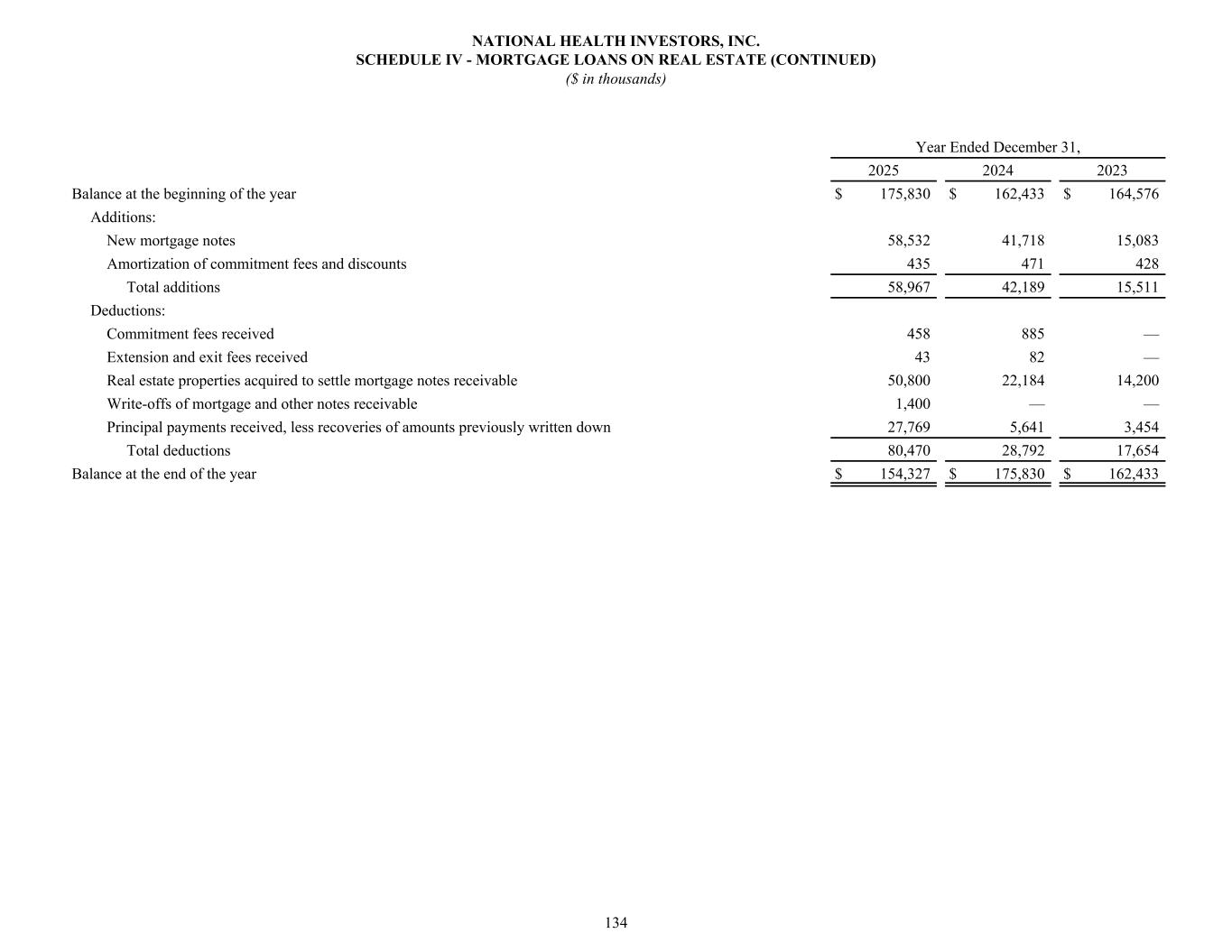 Year Ended December 31, 2025 2024 2023 Balance at the beginning of the year $ 175,830 $ 162,433 $ 164,576 Additions: New mortgage notes 58,532 41,718 15,083 Amortization of commitment fees and discounts 435 471 428 Total additions 58,967 42,189 15,511 Deductions: Commitment fees received 458 885 — Extension and exit fees received 43 82 — Real estate properties acquired to settle mortgage notes receivable 50,800 22,184 14,200 Write-offs of mortgage and other notes receivable 1,400 — — Principal payments received, less recoveries of amounts previously written down 27,769 5,641 3,454 Total deductions 80,470 28,792 17,654 Balance at the end of the year $ 154,327 $ 175,830 $ 162,433 NATIONAL HEALTH INVESTORS, INC. SCHEDULE IV - MORTGAGE LOANS ON REAL ESTATE (CONTINUED) ($ in thousands) 134