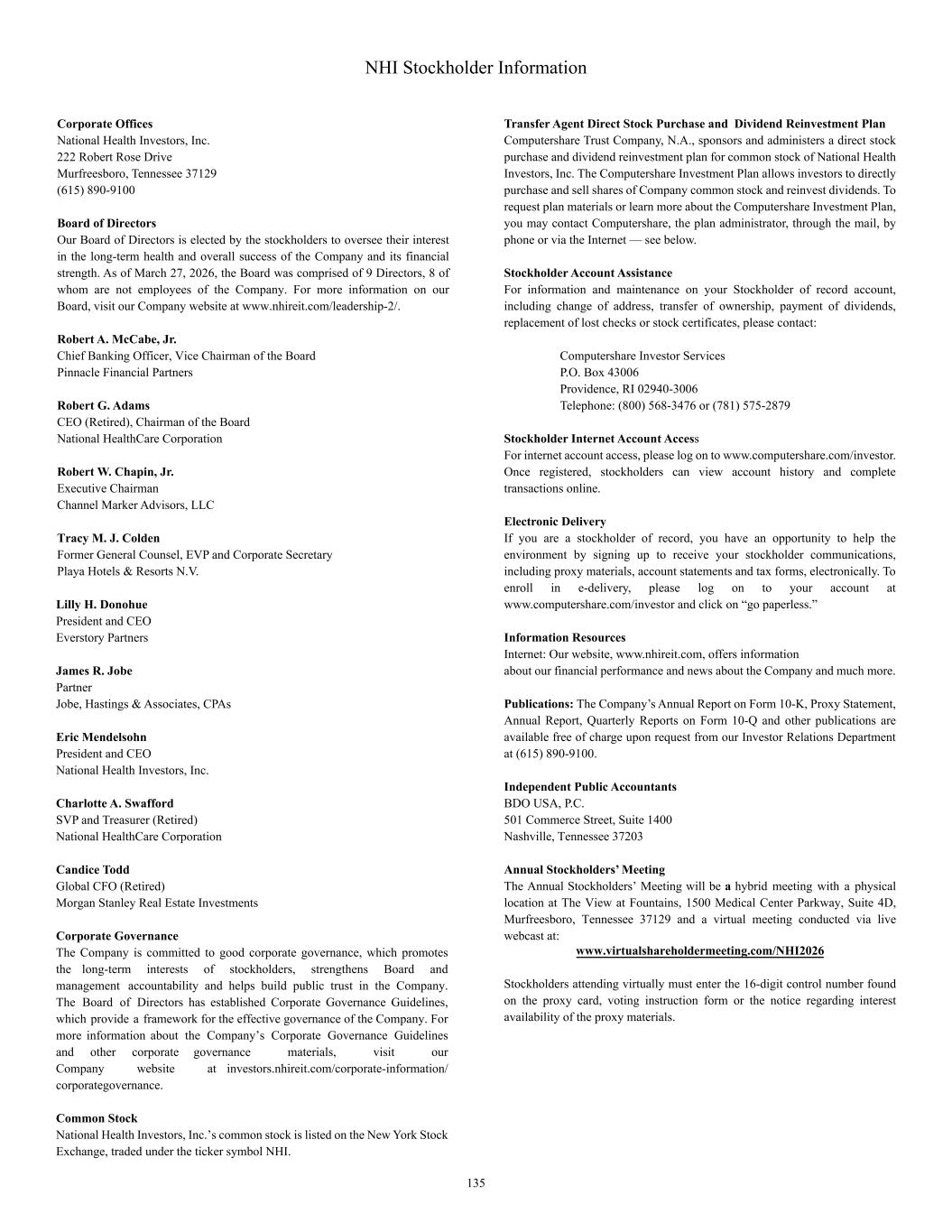 NHI Stockholder Information Corporate Offices National Health Investors, Inc. 222 Robert Rose Drive Murfreesboro, Tennessee 37129 (615) 890-9100 Board of Directors Our Board of Directors is elected by the stockholders to oversee their interest in the long-term health and overall success of the Company and its financial strength. As of March 27, 2026, the Board was comprised of 9 Directors, 8 of whom are not employees of the Company. For more information on our Board, visit our Company website at www.nhireit.com/leadership-2/. Robert A. McCabe, Jr. Chief Banking Officer, Vice Chairman of the Board Pinnacle Financial Partners Robert G. Adams CEO (Retired), Chairman of the Board National HealthCare Corporation Robert W. Chapin, Jr. Executive Chairman Channel Marker Advisors, LLC Tracy M. J. Colden Former General Counsel, EVP and Corporate Secretary Playa Hotels & Resorts N.V. Lilly H. Donohue President and CEO Everstory Partners James R. Jobe Partner Jobe, Hastings & Associates, CPAs Eric Mendelsohn President and CEO National Health Investors, Inc. Charlotte A. Swafford SVP and Treasurer (Retired) National HealthCare Corporation Candice Todd Global CFO (Retired) Morgan Stanley Real Estate Investments Corporate Governance The Company is committed to good corporate governance, which promotes the long-term interests of stockholders, strengthens Board and management accountability and helps build public trust in the Company. The Board of Directors has established Corporate Governance Guidelines, which provide a framework for the effective governance of the Company. For more information about the Company’s Corporate Governance Guidelines and other corporate governance materials, visit our Company website at investors.nhireit.com/corporate-information/ corporategovernance. Common Stock National Health Investors, Inc.’s common stock is listed on the New York Stock Exchange, traded under the ticker symbol NHI. Transfer Agent Direct Stock Purchase and Dividend Reinvestment Plan Computershare Trust Company, N.A., sponsors and administers a direct stock purchase and dividend reinvestment plan for common stock of National Health Investors, Inc. The Computershare Investment Plan allows investors to directly purchase and sell shares of Company common stock and reinvest dividends. To request plan materials or learn more about the Computershare Investment Plan, you may contact Computershare, the plan administrator, through the mail, by phone or via the Internet — see below. Stockholder Account Assistance For information and maintenance on your Stockholder of record account, including change of address, transfer of ownership, payment of dividends, replacement of lost checks or stock certificates, please contact: Computershare Investor Services P.O. Box 43006 Providence, RI 02940-3006 Telephone: (800) 568-3476 or (781) 575-2879 Stockholder Internet Account Access For internet account access, please log on to www.computershare.com/investor. Once registered, stockholders can view account history and complete transactions online. Electronic Delivery If you are a stockholder of record, you have an opportunity to help the environment by signing up to receive your stockholder communications, including proxy materials, account statements and tax forms, electronically. To enroll in e-delivery, please log on to your account at www.computershare.com/investor and click on “go paperless.” Information Resources Internet: Our website, www.nhireit.com, offers information about our financial performance and news about the Company and much more. Publications: The Company’s Annual Report on Form 10-K, Proxy Statement, Annual Report, Quarterly Reports on Form 10-Q and other publications are available free of charge upon request from our Investor Relations Department at (615) 890-9100. Independent Public Accountants BDO USA, P.C. 501 Commerce Street, Suite 1400 Nashville, Tennessee 37203 Annual Stockholders’ Meeting The Annual Stockholders’ Meeting will be a hybrid meeting with a physical location at The View at Fountains, 1500 Medical Center Parkway, Suite 4D, Murfreesboro, Tennessee 37129 and a virtual meeting conducted via live webcast at: www.virtualshareholdermeeting.com/NHI2026 Stockholders attending virtually must enter the 16-digit control number found on the proxy card, voting instruction form or the notice regarding interest availability of the proxy materials. 135