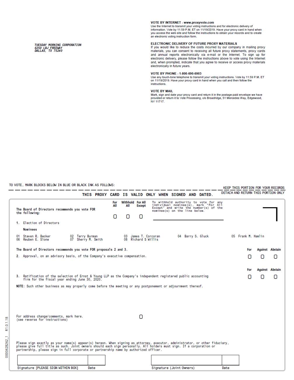 VOTE BY INTERNET - www.proxyvote.com Use the Internet to transmit your voting instructions and for electronic delivery of information. Vote by 11:59 P.M. ET on 11/19/2019. Have your proxy card in hand when you access the web site and follow the instructions to obtain your records and to create an electronic voting instruction form. ELECTRONIC DELIVERY OF FUTURE PROXY MATERIALS If you would like to reduce the costs incurred by our company in mailing proxy materials, you can consent to receiving all future proxy statements, proxy cards and annual reports electronically via e-mail or the Internet. To sign up for electronic delivery, please follow the instructions above to vote using the Internet and, when prompted, indicate that you agree to receive or access proxy materials electronically in future years. TUESDAY MORNING CORPORATION 6250 LBJ FREEWAY DALLAS, TX 75240 VOTE BY PHONE - 1-800-690-6903 Use any touch-tone telephone to transmit your voting instructions. Vote by 11:59 P.M. ET on 11/19/2019. Have your proxy card in hand when you call and then follow the instructions. VOTE BY MAIL Mark, sign and date your proxy card and return it in the postage-paid envelope we have provided or return it to Vote Processing, c/o Broadridge, 51 Mercedes Way, Edgewood, NY 11717. TO VOTE, MARK BLOCKS BELOW IN BLUE OR BLACK INK AS FOLLOWS: KEEP THIS PORTION FOR YOUR RECORDS DETACH AND RETURN THIS PORTION ONLY THIS PROXY CARD IS VALID ONLY WHEN SIGNED AND DATED. For Withhold For All Except To withhold authority to vote for any individual nominee(s), mark “For All Except” and write the number(s) of the AllAll The Board of Directors recommends you vote FOR the following: nominee(s) on the line below. 0 0 0 1. Election of Directors Nominees 01 Steven R. Becker 06 Reuben E. Slone 02 Terry Burman 07 Sherry M. Smith 03 James T. Corcoran 08 Richard S Willis 04 Barry S. Gluck 05 Frank M. Hamlin The Board of Directors recommends you vote FOR proposals 2 and 3. 2. Approval, on an advisory basis, of the Company's executive compensation. For 0 For 0 Against 0 Against 0 Abstain 0 Abstain 0 3. Ratification of the selection of Ernst & Young LLP as the Company's independent registered public accounting firm for the fiscal year ending June 30, 2020. NOTE: Such other business as may properly come before the meeting or any postponement or adjournment thereof. 0 For address change/comments, mark here. (see reverse for instructions) Please sign exactly as your name(s) appear(s) hereon. When signing as attorney, executor, administrator, or other fiduciary, please give full title as such. Joint owners should each sign personally. All holders must sign. If a corporation or partnership, please sign in full corporate or partnership name by authorized officer. Signature [PLEASE SIGN WITHIN BOX] Date Signature (Joint Owners) Date 0000428262_1 R1.0.1.18