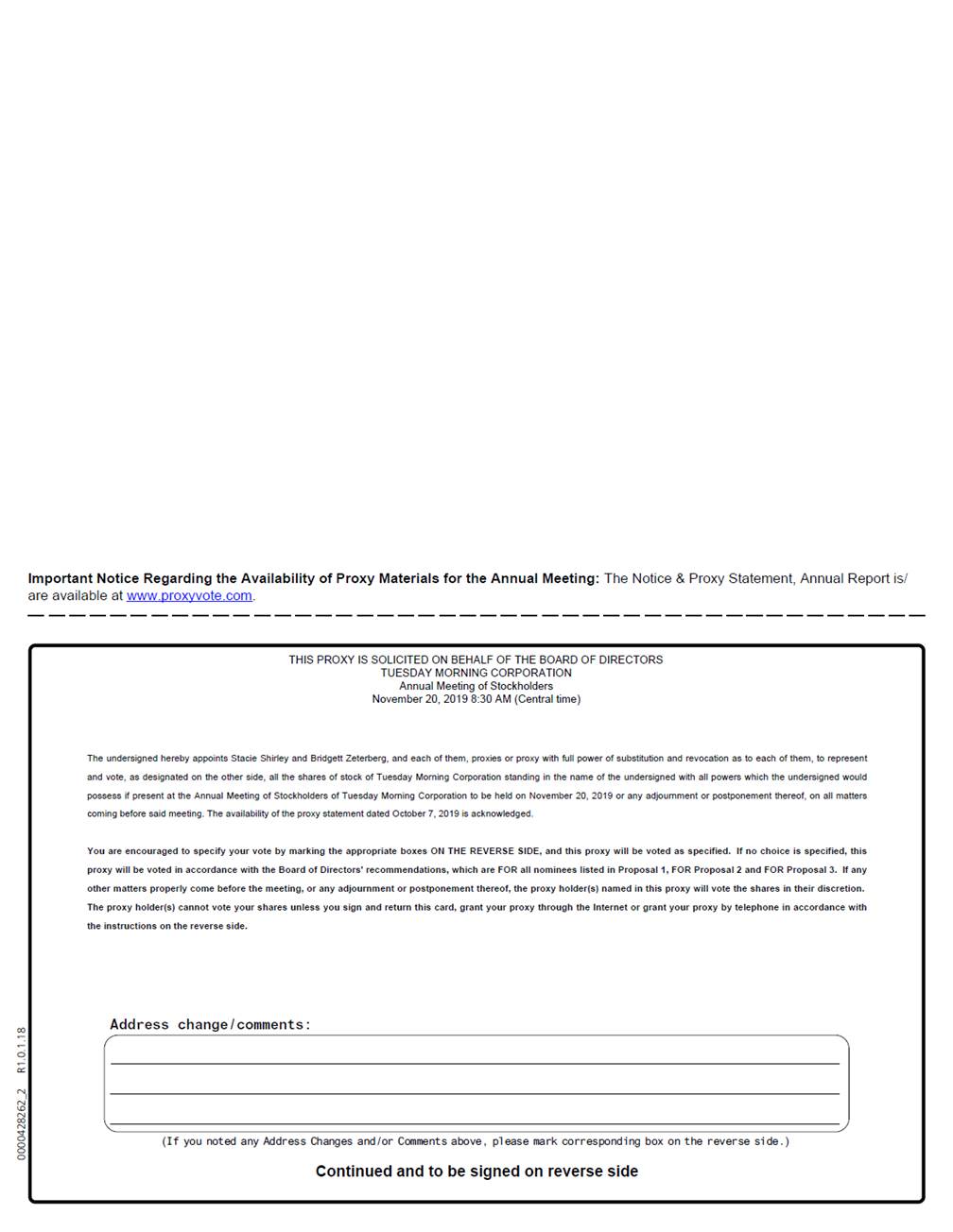 Important Notice Regarding the Availability of Proxy Materials for the Annual Meeting: The Notice & Proxy Statement, Annual Report is/ are available at www.proxyvote.com. THIS PROXY IS SOLICITED ON BEHALF OF THE BOARD OF DIRECTORS TUESDAY MORNING CORPORATION Annual Meeting of Stockholders November 20, 2019 8:30 AM (Central time) The undersigned hereby appoints Stacie Shirley and Bridgett Zeterberg, and each of them, proxies or proxy with full power of substitution and revocation as to each of them, to represent and vote, as designated on the other side, all the shares of stock of Tuesday Morning Corporation standing in the name of the undersigned with all powers which the undersigned would possess if present at the Annual Meeting of Stockholders of Tuesday Morning Corporation to be held on November 20, 2019 or any adjournment or postponement thereof, on all matters coming before said meeting. The availability of the proxy statement dated October 7, 2019 is acknowledged. You are encouraged to specify your vote by marking the appropriate boxes ON THE REVERSE SIDE, and this proxy will be voted as specified. If no choice is specified, this proxy will be voted in accordance with the Board of Directors' recommendations, which are FOR all nominees listed in Proposal 1, FOR Proposal 2 and FOR Proposal 3. If any other matters properly come before the meeting, or any adjournment or postponement thereof, the proxy holder(s) named in this proxy will vote the shares in their discretion. The proxy holder(s) cannot vote your shares unless you sign and return this card, grant your proxy through the Internet or grant your proxy by telephone in accordance with the instructions on the reverse side. Address change/comments: (If you noted any Address Changes and/or Comments above, please mark corresponding box on the reverse side.) Continued and to be signed on reverse side 0000428262_2 R1.0.1.18