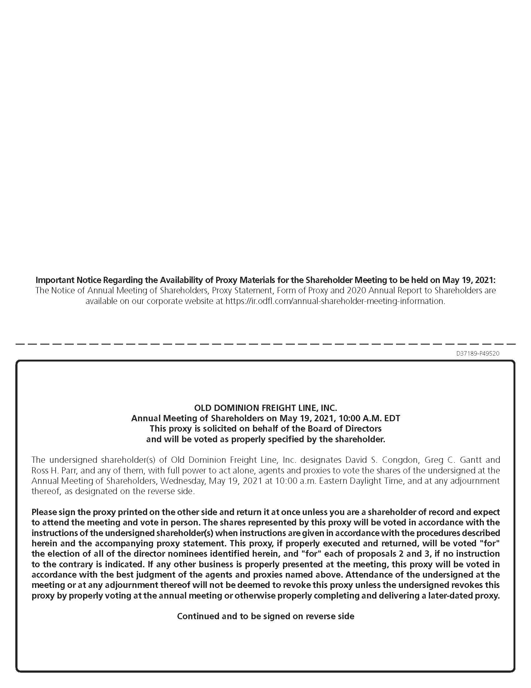 Important Notice Regarding the Availability of Proxy Materials for the Shareholder Meeting to be held on May 19, 2021: The Notice of Annual Meeting of Shareholders, Proxy Statement, Form of Proxy and 2020 Annual Report to Shareholders are available on our corporate website at https://ir.odfl.com/annual-shareholder-meeting-information. D37189-P49520 OLD DOMINION FREIGHT LINE, INC. Annual Meeting of Shareholders on May 19, 2021, 10:00 A.M. EDT This proxy is solicited on behalf of the Board of Directors and will be voted as properly specified by the shareholder. The undersigned shareholder(s) of Old Dominion Freight Line, Inc. designates David S. Congdon, Greg C. Gantt and Ross H. Parr, and any of them, with full power to act alone, agents and proxies to vote the shares of the undersigned at the Annual Meeting of Shareholders, Wednesday, May 19, 2021 at 10:00 a.m. Eastern Daylight Time, and at any adjournment thereof, as designated on the reverse side. Please sign the proxy printed on the other side and return it at once unless you are a shareholder of record and expect to attend the meeting and vote in person. The shares represented by this proxy will be voted in accordance with the instructions of the undersigned shareholder(s) when instructions are given in accordance with the procedures described herein and the accompanying proxy statement. This proxy, if properly executed and returned, will be voted “for” the election of all of the director nominees identified herein, and “for” each of proposals 2 and 3, if no instruction to the contrary is indicated. If any other business is properly presented at the meeting, this proxy will be voted in accordance with the best judgment of the agents and proxies named above. Attendance of the undersigned at the meeting or at any adjournment thereof will not be deemed to revoke this proxy unless the undersigned revokes this proxy by properly voting at the annual meeting or otherwise properly completing and delivering a later-dated proxy. Continued and to be signed on reverse side