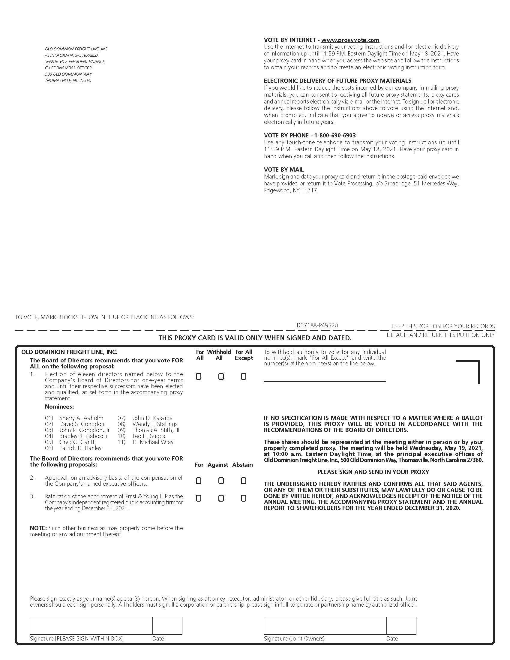 OLD DOMINION FREIGHT LINE, INC. ATTN: ADAM N. SATTERFIELD, SENIOR VICE PRESIDENT-FINANCE, CHIEF FINANCIAL OFFICER 500 OLD DOMINION WAY THOMASVILLE, NC 27360 VOTE BY INTERNET -www.proxyvote.com Use the internet to transmit your voting instructions and for electronic delivery of information up until 11:59 P.M. Eastern Daylight Time on May 18, 2021. Have your proxy card in hand when you access the web site and follow the instructions to obtain your records and to create an electronic voting instruction form. ELECTRONIC DELIVERY OF FUTURE PROXY MATERIALS If you would like to reduce the costs incurred by our company in mailing proxy materials, you can consent to receiving all future proxy statements, proxy cards and annual reports electronically via e-mail or the Internet. To sign up for electronic delivery, please follow the instructions above to vote using the Internet and, when prompted, indicate that you agree to receive or access proxy materials electronically in future years. VOTE BY PHONE - 1-800-690-6903 Use any touch-tone telephone to transmit your voting instructions up until 11:59 P.M. Eastern Daylight Time on May 18, 2021. Have your proxy card in hand when you call and then follow the instructions. VOTE BY MAIL Mark, sign and date your proxy card and return it in the postage-paid envelope we have provided or return it to Vote Processing, c/o Broadridge, 51 Mercedes Way, Edgewood, NY 11717. TO VOTE, MARK BLOCKS BELOW IN BLUE OR BLACK INK AS FOLLOWS: D37188-P49520 KEEP THIS PORTION FOR YOUR RECORDS DETACH AND RETURN THIS PORTION ONLY THIS PROXY CARD IS VALID ONLY WHEN SIGNED AND DATED. OLD DOMINION FREIGHT LINE, INC. The Board of Directors recommends that you vote FOR ALL on the following proposal: 1. Election of eleven directors named below to the Company’s Board of Directors for one-year terms and until their respective successors have been elected and qualified, as set forth in the accompanying proxy statement. For All Withhold All For All Except Nominees: 01) Sherry A. Aaholm 02) David S. Congdon 03) John R. Congdon, Jr. 04) Bradley R. Gabosch 05) Greg C. Gantt 06) Patrick D. Hanley 07) John D. Kasarda 08) Wendy T. Stallings 09) Thomas A. Stich, III 10) Leo H. Suggs 11) D. Michael Wray The Board of Directors recommends that you vote FOR the following proposals: 2. Approval , on an advisory basis, of the compensation of the Company’s named executive officers. 3. Ratification of the appointment of Ernst & Young LLP as the Company’s independent registered public accounting firm for the year ending December 31, 2021.NOTE: Such other business as may properly come before the meeting or any adjournment thereof. For Against Abstain To withhold authority to vote for any individual nominee(s), mark “For All Except” and write the number(s) of the nominee(s) on the line below. IF NO SPECIFICATION IS MADE WITH RESPECT TO A MATTER WHERE A BALLOT IS PROVIDED THIS PROXY WILL BE VOTED IN ACCORDANCE WITH THE RECOMMENDATIONS OF THE BOARD OF DIRECTORS. These shares should be represented at the meeting either in person or by your properly completed proxy. The meeting will be held Wednesday, May 19, 2021, at 10:00 a.m. Eastern Daylight Time, at the principal executive offices of Old Dominion Freight Line, Inc., 500 Old Dominion Way, Thomasville, North Carolina 27360. PLEASE SIGN AND SEND IN YOUR PROXY THE UNDERSIGNED HEREBY RATIFIES AND CONFIRMS ALL THAT SAID AGENTS, OR ANY OF THEM OR THEIR SUBSTITUES, MAY LAWFULLY DO OR CAUSE TO BE DONE BY VIRTURE HEREOF, AND ACKNOWLEDGES RECEIPT OF THE NOTICE OF THE ANNUAL MEETING, THE ACCOMPANYING PROXY STATEMENT AND THE ANNUAL REPORT TO SHAREHOLDERS FOR THE YEAR ENDED DECEMBER 31, 2020. Please sign exactly as your name(s) appear(s) hereon. When signing as attorney, executor, administrator, or other fiduciary, please give full title as such. Joint owners should each sign personally. All holders must sign. If a corporation or partnership, please sign in full corporate or partnership name by authorized officer. Signature [PLEASE SIGN WITHIN BOX] Date Signature (Joint Owners) Date