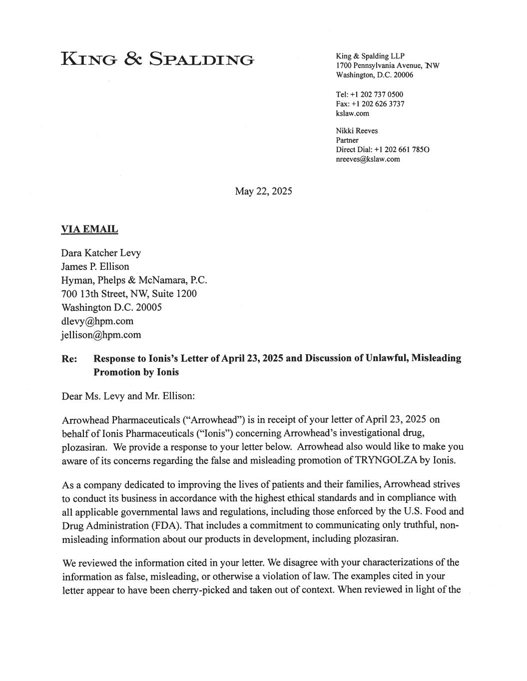 LAW OFFICES HYMAN, PHELPS & MCNAMARA, P.C. DARA KATCHER LEVY JAMES P. ELLISON VlA EMAfL AND F EDERAL EXPR~S Patrick O'Brien 700 THIRTEENTH STREET, NW SUITE 1200 WASHINGTON, DC 20005-5929 (202) 737-5600 FACSIMILE (202) 737-9329 www hpm com April 23, 2025 Chief Operating Officer and General Counsel Arrowhead Pharmaceuticals 177 East Colorado Boulevard Suite 700 Pasadena, CA 91105 Direct Dial (202) 737-4290 Dlevv•0'hgm .c om Direct Dial (202) 737-4294 JEllison@hpm.com Re: Arrowhead's Unlawful Promotion of Plozasiran Subcutaneous Injection Dear Mr. 0 'Brien: Our law firm represents Ionis Pharmaceuticals ("Ionis"). We are writing to you in your capacity as General Counsel to Arrowhead Pharmaceuticals ("Arrowhead") concerning your client's investigational drug, plozasiran. As we explain below, we have substantial evidence of unlawful conduct by your client with respect to this drug. This conduct gives rise to violations of federal laws, such as the Lanham Act, enforceable by Ionis. In addition, your client's conduct is actionable under state law, such as California's Unfair Competition Law, as well as common law claims of tortious interference that Ionis can bring in federal or state court. Because of the serious nature of this conduct, we ask that you promptly investigate it and take immediate corrective and preventative actions. Because of the harm it is causing our client, we ask that you provide us with a response within ten (10) working days. We thank you in advance for your prompt attention to this important matter that we hope we can resolve on mutually acceptable terms. At its core, the problem is that your client is making false and misleading communications about plozasiran and comparing it to Ionis's FDA-approved drug, TRYNGOLZA ( olezarsen). Arrowhead engages in a concerning course of conduct by publicizing misinformation and "promoting" plozasiran as superior to TRYNGOLZA for