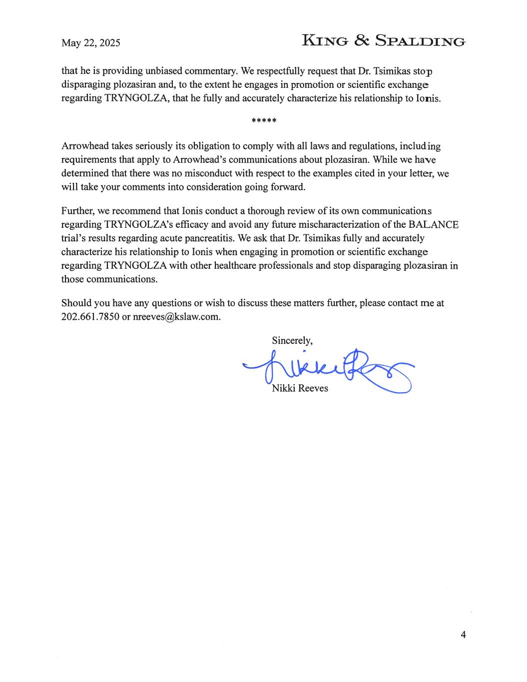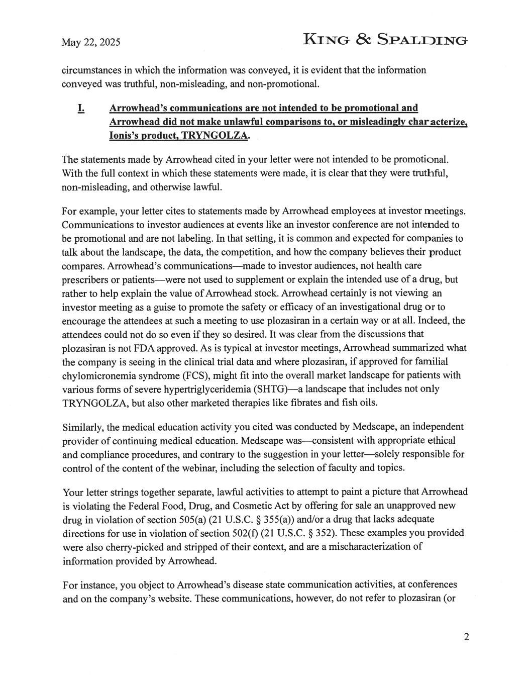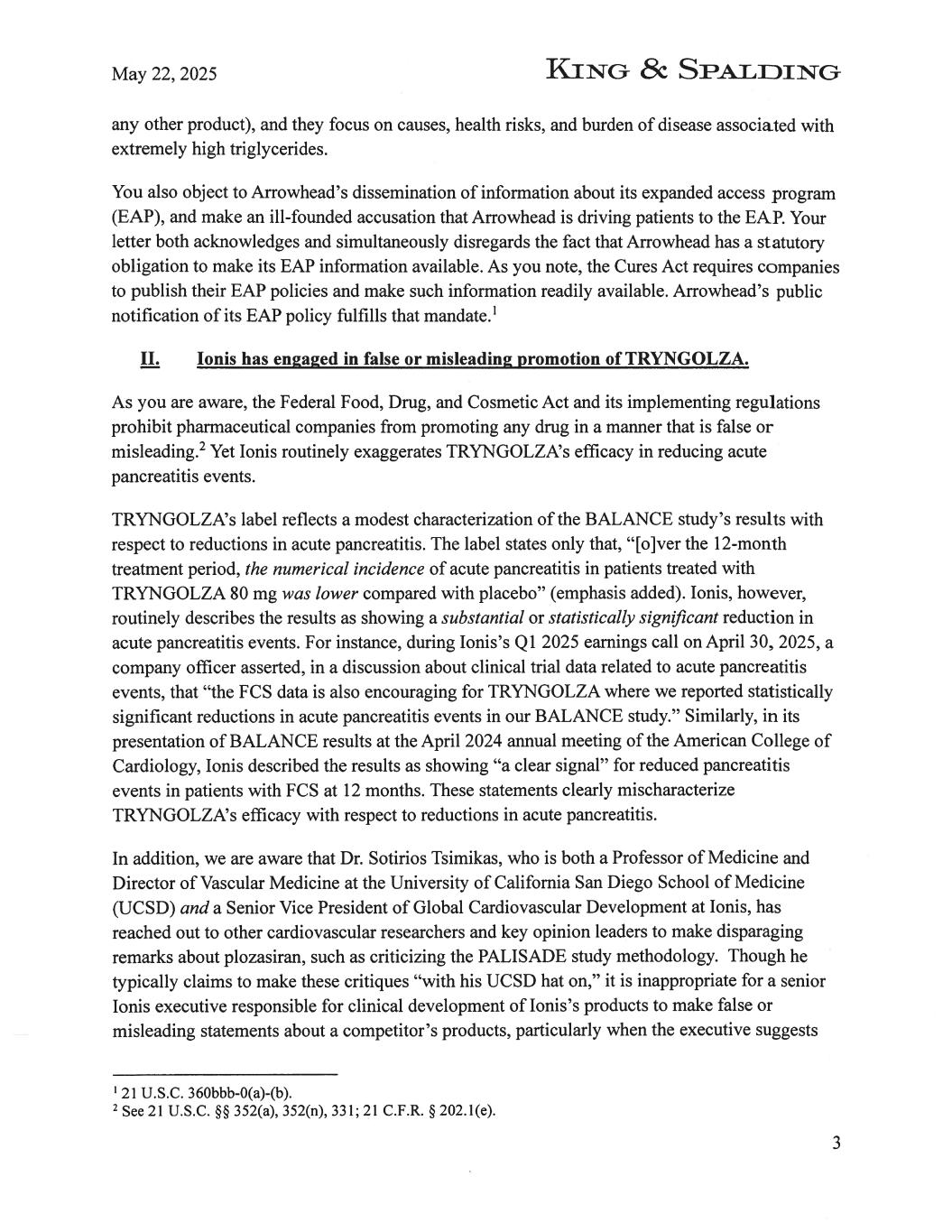 Arrowhead Pharmaceuticals April 23, 2025 Page2 HYMAN, PHELPS & MCNAMARA, P.C. both the treatment of familial chylomicronemia syndrome ("FCS") and severe hypertriglyceridemia ("sHTG") ahead of any review or approval of plozasiran by the Food and Drug Administration ( 'FDA') and in violation of numerous federal and state laws. As such, Arrowhead is marketing an unapproved new drug in violation of sections 505(a and 30l(d) of the Federal Food Drug and Cosmetic Act ( FDC Act'), and Arrowhead statements misbrand plozasiran in violation of the FDC Act§§ 502(a) and 301(a) and FDA s implementing regulations. Arrowhead's disparaging communications mislead healthcare professionals, consumers and investors. In so doing, these communications violate the Lanham Act, as well as state laws such as the California Unfair Competition Laws, Cal. Bus. & Prof. Code, § 17200 et seq. Arrowhead's communications are also subject to direct enforcement by the FDA. If Arrowhead does not immediately cease and desist such unlawful communications and take prompt corrective action, Ionis will initiate steps for relief from the courts and appropriate authorities. A. False and Misleading Superiority Claims Arrowhead repeatedly has disseminated a number of actionable comparative claims regarding Ionis's FDA-approved product, TRYNGOLZA. Between misleading cross-study comparisons of study data to misrepresentations of TRYNGOLZA's approved patient populations, Arrowhead has disparaged Ionis' s product and conducted a willful and intentionc).lly false and misleading campaign to direct patients and healthcare professionals away from an FDA-approved drug to an experimental drug. Misleading Cross-Study Comparisons Arrowhead touts superiority of its unapproved plozasiran to Ionis' s approved medicine, TRYNGOLZA, based on selective data presentations and otherwise inappropriate cross-study comparisons between Arrowhead's PALISADE study and Ionis's Balance study. At the TD Cowen Healthcare Conference in March 2025, for example, Arrowhead employees maintained that plozasiran can lower triglycerjdes by 80 percent while olezarsen (TRYNGOLZA) lowers triglycerides by 30 or 40 percent. (Transcript at 3 in Attachment A.) Arrowhead made similar claims at the Medscape Peer to-Peer Presentation from March 10, 2025 1, where A.ITowhead drrectly compared the While the Medscape Peer-to-Peer Presentation was positioned as independent medical education, the presentation was supported by Arrowhead through an educational grant and moderated by Christie Ballantyne, a key opinion leader compensated by Arrowhead (continued .. . )