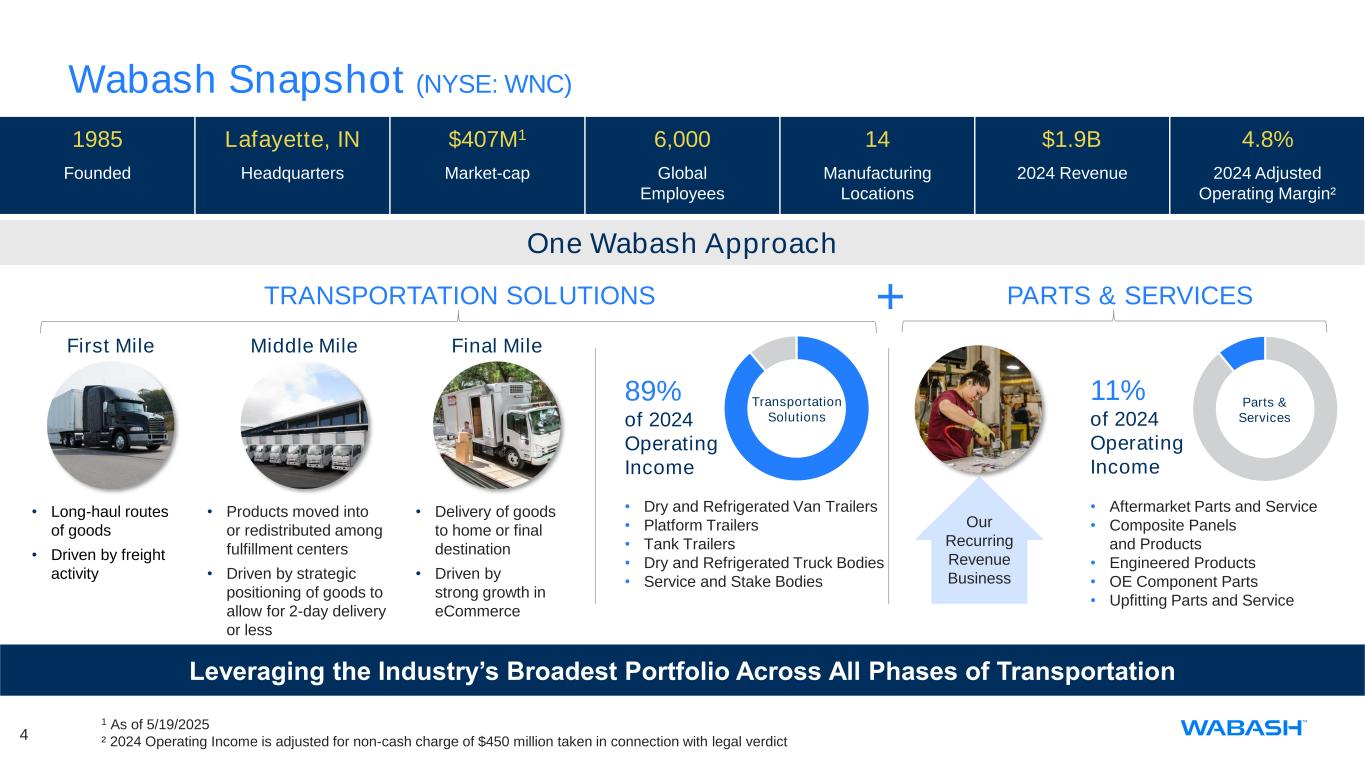 3 Key Messages • Wabash is a leader in transportation solutions with a portfolio of equipment spanning from First to Final Mile • Strategic growth plans are rooted in a clear, long-term vision that aligns with customer needs and industry shifts • Equipment business is complemented by steadily growing Parts & Services offerings which generate more recurring revenues and higher margins in addition to creating greater lifecycle value for customers • 2025 outlook reflects challenging year for customer capital expenditure due to difficult operating conditions and tariff uncertainty • Able to pull multiple levers to preserve/generate cash, if necessary. Have access to ample liquidity with patient debt structure with no restrictive covenants Wabash – Changing How the World Reaches You