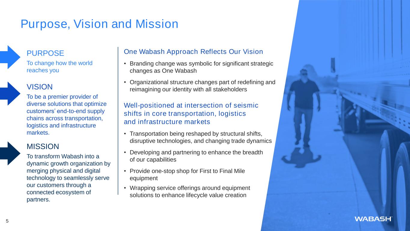 4WNC Investor Day | Wabash Snapshot (NYSE: WNC) Leveraging the Industry’s Broadest Portfolio Across All Phases of Transportation 1985 Lafayette, IN $407M1 6,000 14 $1.9B 4.8% Founded Headquarters Market-cap Global Employees Manufacturing Locations 2024 Revenue 2024 Adjusted Operating Margin² • Long-haul routes of goods • Driven by freight activity • Products moved into or redistributed among fulfillment centers • Driven by strategic positioning of goods to allow for 2-day delivery or less • Delivery of goods to home or final destination • Driven by strong growth in eCommerce First Mile Middle Mile Final Mile One Wabash Approach • Dry and Refrigerated Van Trailers • Platform Trailers • Tank Trailers • Dry and Refrigerated Truck Bodies • Service and Stake Bodies TRANSPORTATION SOLUTIONS PARTS & SERVICES+ Transportation Solutions • Aftermarket Parts and Service • Composite Panels and Products • Engineered Products • OE Component Parts • Upfitting Parts and Service Parts & Services Our Recurring Revenue Business 89% of 2024 Operating Income 11% of 2024 Operating Income 4 1 As of 5/19/2025 ² 2024 Operating Income is adjusted for non-cash charge of $450 million taken in connection with legal verdict