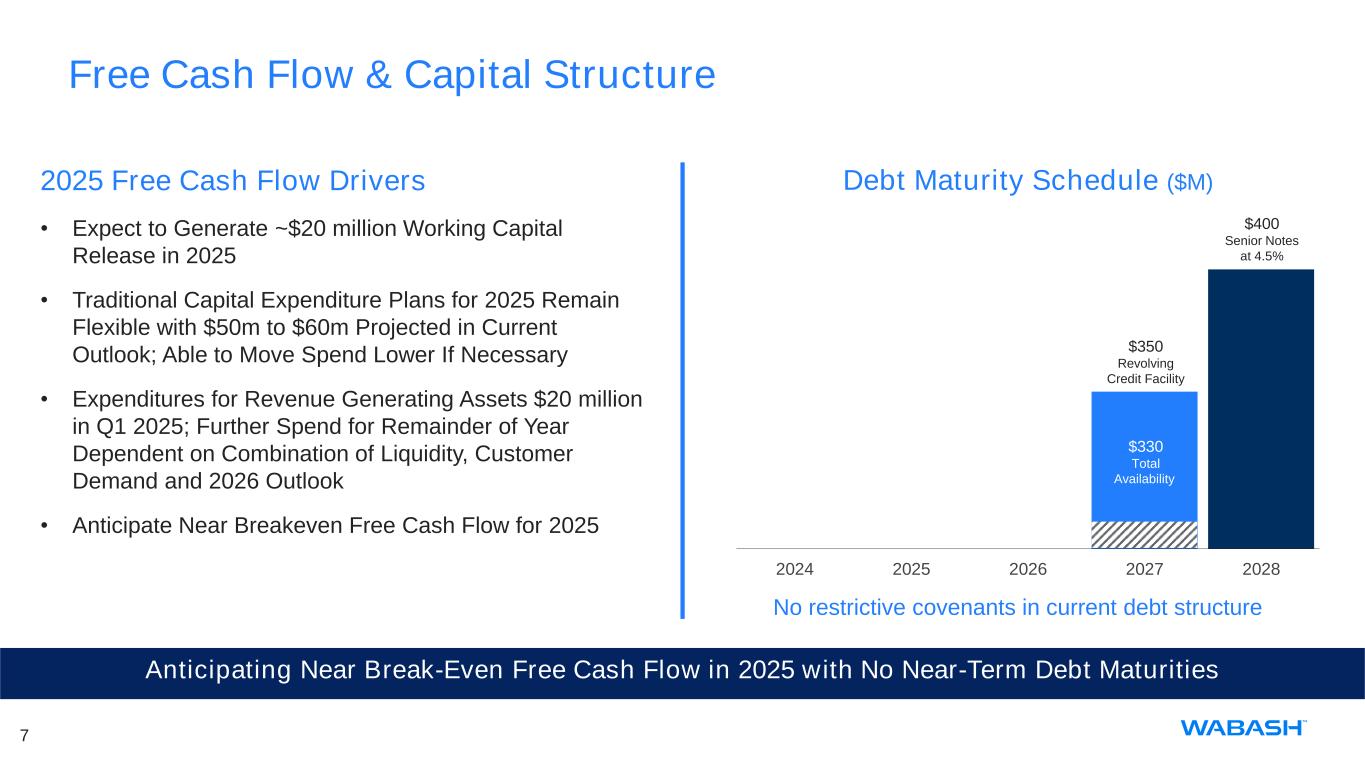 6WNC Investor Day | Growing Our Higher Margin Parts & Services Segment Growth in Parts & Services Increases Recurring Revenue within Wabash’s Portfolio $177 $193 $221 $205 $265 2021 2022 2023 2024 2025E Increasing Amount of Recurring Revenue1 • Increasing recurring revenue provides increased stability through the cycle and a medium-term idiosyncratic growth opportunity • Carrying higher EBITDA margins, growth in Parts & Services generates margin accretion for Wabash • Synergistic relationship between segments as Parts & Services benefits from market-leading equipment portfolio while creating increased lifecycle value for customers 11 1 Recurring revenue reflects the Parts & Services reportable segment revenue.6