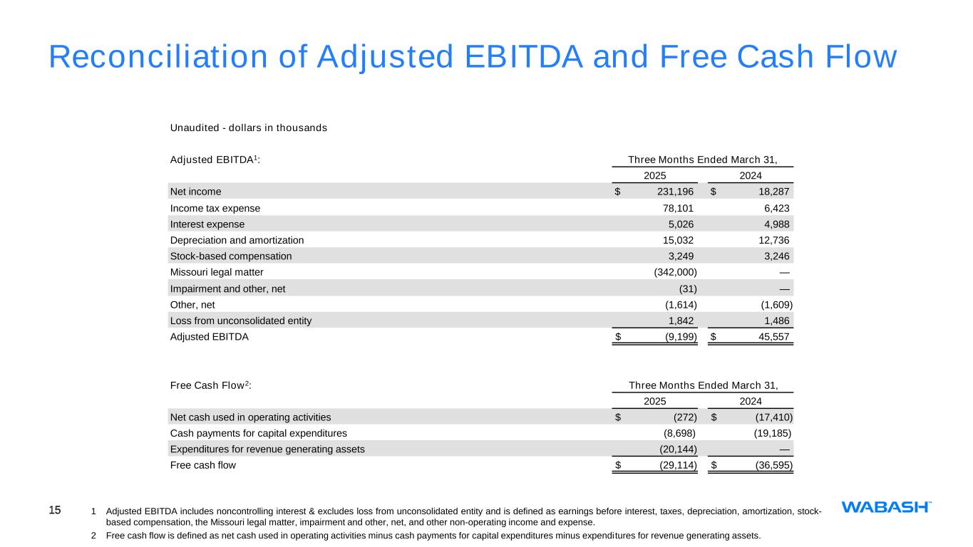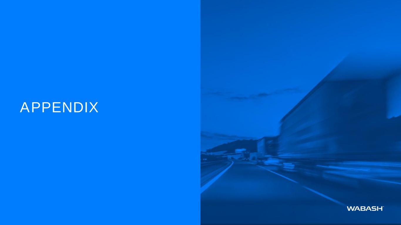 This presentation contains certain forward-looking statements as defined by the Private Securities Litigation Reform Act of 1995. Forward-looking statements convey Wabash National Corporation's (the "Company") current expectations or forecasts of future events. All statements contained in this presentation other than statements of historical fact are forward-looking statements. These forward-looking statements include, among other things, all statements regarding the Company’s outlook for trailer and truck body shipments, backlog, expectations regarding demand levels for trailers, truck bodies, non-trailer equipment and our other diversified product offerings, pricing, profitability and earnings, cash flow and liquidity, opportunity to capture higher margin sales, new product innovations, our growth and diversification strategies, our expectations for improved financial performance during the course of the year and our expectations with regards to capital allocation. These and the Company’s other forward-looking statements are subject to certain risks and uncertainties that could cause actual results to differ materially from those implied by the forward-looking statements. Without limitation, these risks and uncertainties include the Missouri product liability action and the unfavorable jury verdict, the highly cyclical nature of our business, uncertain economic conditions including the possibility that customer demand may not meet our expectations, our backlog may not reflect future sales of our products, increased competition, reliance on certain customers and corporate partnerships, risks of customer pick-up delays, shortages and costs of raw materials including the impact of tariffs or other international trade developments, risks in implementing and sustaining improvements in the Company’s manufacturing operations and cost containment, dependence on industry trends and timing, supplier constraints, labor costs and availability, customer acceptance of and reactions to pricing changes, costs of indebtedness, and our ability to execute on our long- term strategic plan. Readers should review and consider the various disclosures made by the Company in this presentation and in the Company’s reports to its stockholders and periodic reports on Forms 10-K and 10-Q. We cannot give assurance that the expectations reflected in our forward-looking statements will prove to be correct. Our actual results could differ materially from those anticipated in these forward-looking statements. All written and oral forward-looking statements attributable to us are expressly qualified in their entirety by the factors we disclose that could cause our actual results to differ materially from our expectations. In addition to disclosing financial results calculated in accordance with United States generally accepted accounting principles (GAAP), the financial information included in this presentation contains non-GAAP financial measures including adjusted operating (loss) income, adjusted net (loss) income attributable to common stockholders, adjusted diluted earnings per share, adjusted EBITDA, free cash flow, adjusted segment EBITDA, and adjusted segment EBITDA margin. These non-GAAP measures should not be considered a substitute for, or superior to, financial measures and results calculated in accordance with GAAP, including net income, and reconciliations to GAAP financial statements should be carefully evaluated. Adjusted operating (loss) income, a non-GAAP financial measures, exclude certain costs, expenses, other charges, gains or income that are included in the determination of operating income under U.S. GAAP, but that management would not consider important in evaluating the quality of the Company’s operating results as they are not indicative of the Company’s core operating results or may obscure trends useful in evaluating the Company’s continuing activities. Accordingly, the Company presents adjusted operating (loss) income excluding these special items to help investors evaluate our operating performance and trends in our business consistent with how management evaluates such performance and trends. Further, the Company presents adjusted operating (loss) income to provide investors with a better understanding of the Company’s view of our results as compared to prior periods. A reconciliation of adjusted operating (loss) income to operating income, the most comparable GAAP financial measure, is included in the appendix to this presentation. Adjusted net (loss) income attributable to common stockholders and adjusted diluted (loss) earnings per share reflect an adjustment for the Missouri legal matter and the related tax effect of that adjustment. Management believes providing adjusted measures and excluding certain items facilitates comparisons to the Company’s prior year periods and, when combined with the GAAP presentation of net income and diluted net income per share, is beneficial to an investor’s understanding of the Company’s performance. A reconciliation of adjusted net (loss) income attributable to common stockholders and adjusted diluted (loss) earnings per share to net income attributable to common stockholders and diluted earnings per share, the most comparable GAAP financial measures, are included in the appendix to this presentation. Adjusted EBITDA includes noncontrolling interest and excludes loss from unconsolidated entity and is defined as earnings before interest, taxes, depreciation, amortization, stock-based compensation, the Missouri legal matter, impairment and other, net, and other non-operating income and expense. Management believes providing adjusted EBITDA is useful for investors to understand the Company’s performance and results of operations period to period with the exclusion of the items identified above. Management believes the presentation of adjusted EBITDA, when combined with the GAAP presentations of operating income and net income, is 