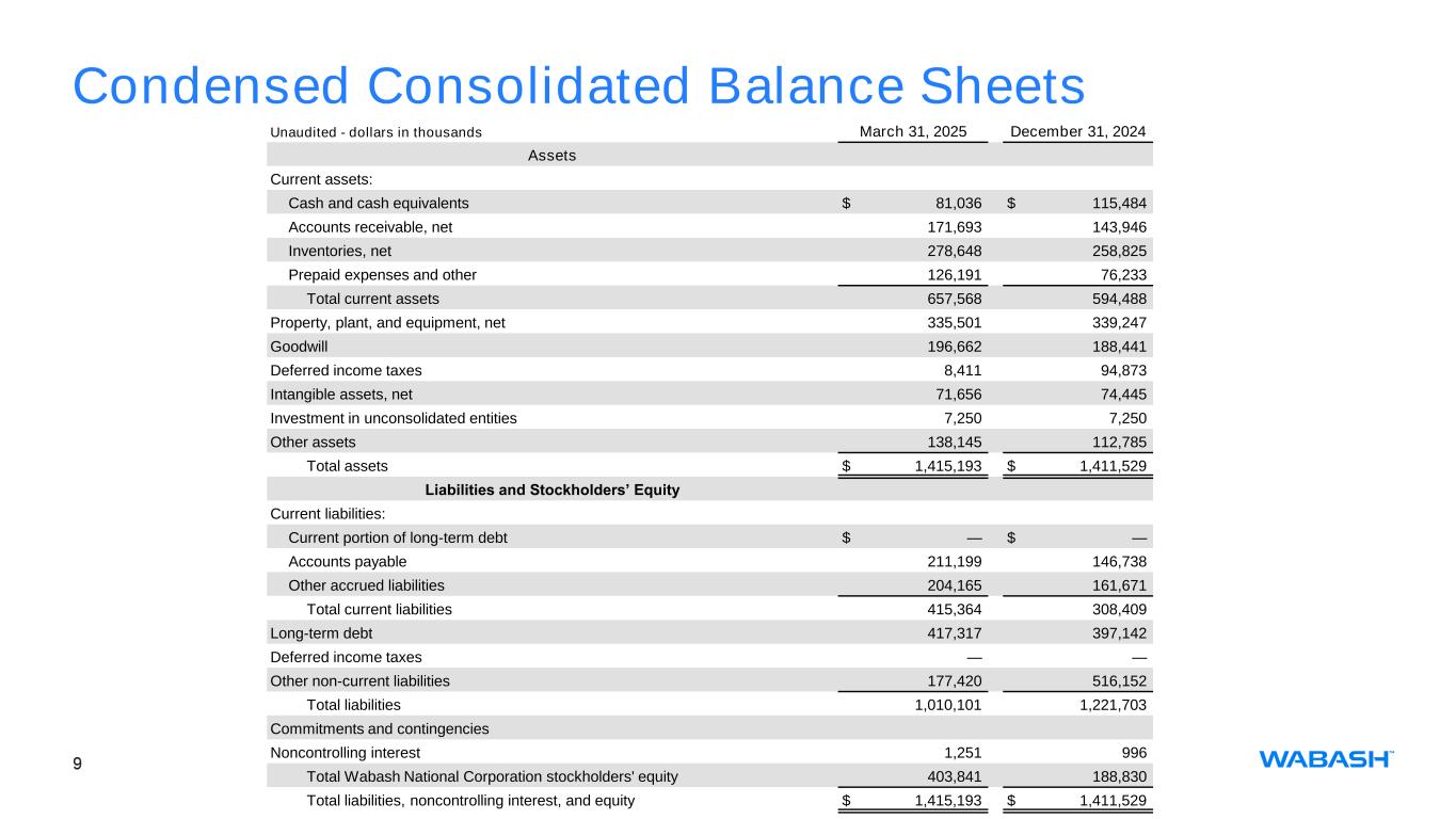 9 Condensed Consolidated Balance Sheets Unaudited - dollars in thousands March 31, 2025 December 31, 2024 Assets Current assets: Cash and cash equivalents $ 81,036 $ 115,484 Accounts receivable, net 171,693 143,946 Inventories, net 278,648 258,825 Prepaid expenses and other 126,191 76,233 Total current assets 657,568 594,488 Property, plant, and equipment, net 335,501 339,247 Goodwill 196,662 188,441 Deferred income taxes 8,411 94,873 Intangible assets, net 71,656 74,445 Investment in unconsolidated entities 7,250 7,250 Other assets 138,145 112,785 Total assets $ 1,415,193 $ 1,411,529 Liabilities and Stockholders’ Equity Current liabilities: Current portion of long-term debt $ — $ — Accounts payable 211,199 146,738 Other accrued liabilities 204,165 161,671 Total current liabilities 415,364 308,409 Long-term debt 417,317 397,142 Deferred income taxes — — Other non-current liabilities 177,420 516,152 Total liabilities 1,010,101 1,221,703 Commitments and contingencies Noncontrolling interest 1,251 996 Total Wabash National Corporation stockholders' equity 403,841 188,830 Total liabilities, noncontrolling interest, and equity $ 1,415,193 $ 1,411,529
