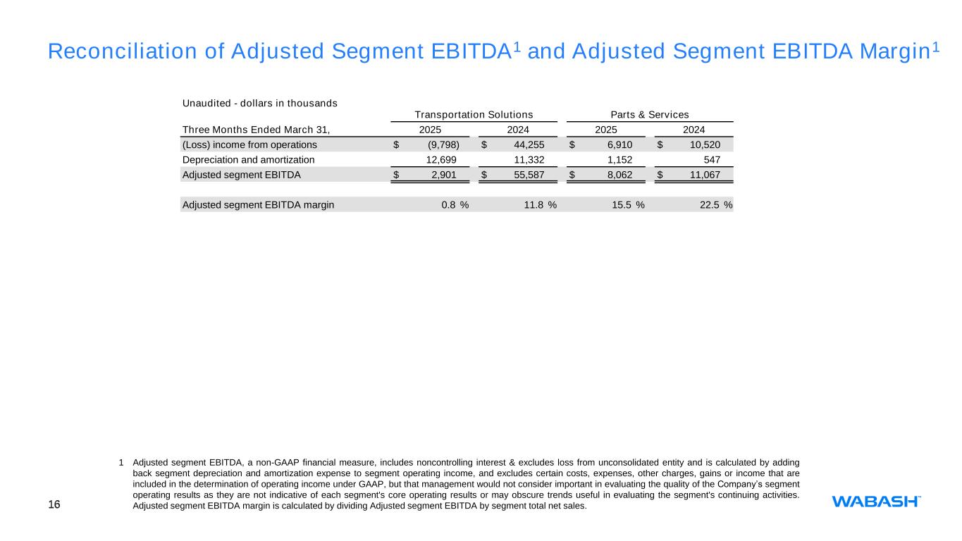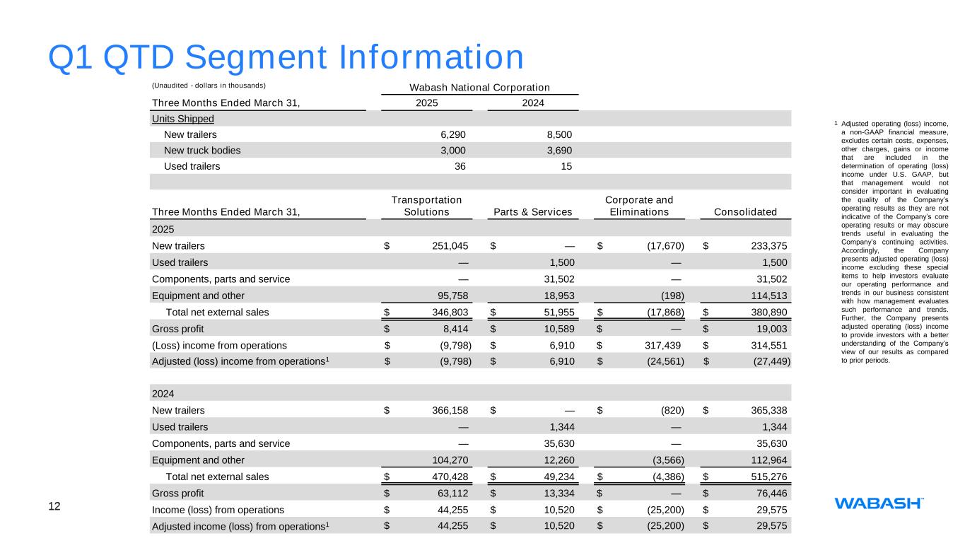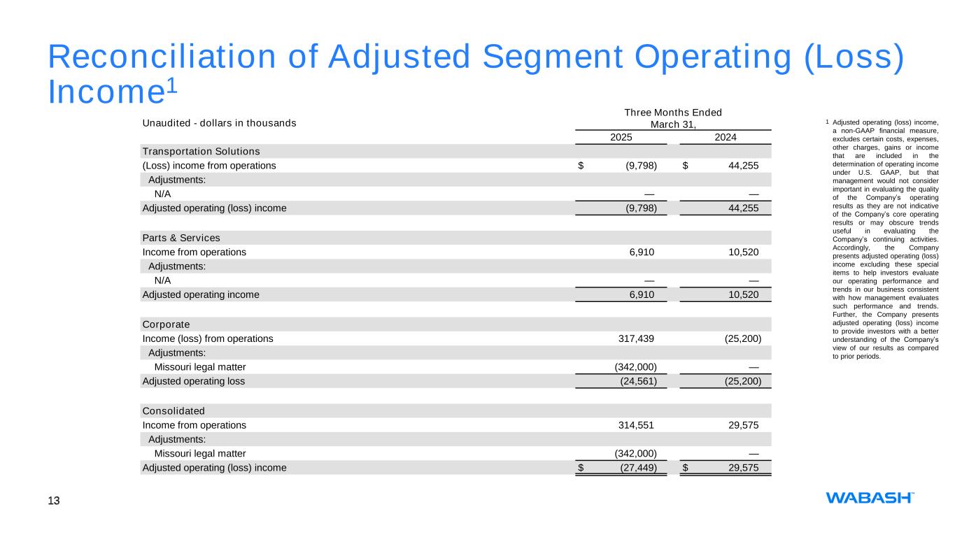 12 Q1 QTD Segment Information (Unaudited - dollars in thousands) Wabash National Corporation Three Months Ended March 31, 2025 2024 Units Shipped New trailers 6,290 8,500 New truck bodies 3,000 3,690 Used trailers 36 15 Three Months Ended March 31, Transportation Solutions Parts & Services Corporate and Eliminations Consolidated 2025 New trailers $ 251,045 $ — $ (17,670) $ 233,375 Used trailers — 1,500 — 1,500 Components, parts and service — 31,502 — 31,502 Equipment and other 95,758 18,953 (198) 114,513 Total net external sales $ 346,803 $ 51,955 $ (17,868) $ 380,890 Gross profit $ 8,414 $ 10,589 $ — $ 19,003 (Loss) income from operations $ (9,798) $ 6,910 $ 317,439 $ 314,551 Adjusted (loss) income from operations1 $ (9,798) $ 6,910 $ (24,561) $ (27,449) 2024 New trailers $ 366,158 $ — $ (820) $ 365,338 Used trailers — 1,344 — 1,344 Components, parts and service — 35,630 — 35,630 Equipment and other 104,270 12,260 (3,566) 112,964 Total net external sales $ 470,428 $ 49,234 $ (4,386) $ 515,276 Gross profit $ 63,112 $ 13,334 $ — $ 76,446 Income (loss) from operations $ 44,255 $ 10,520 $ (25,200) $ 29,575 Adjusted income (loss) from operations1 $ 44,255 $ 10,520 $ (25,200) $ 29,575 1 Adjusted operating (loss) income, a non-GAAP financial measure, excludes certain costs, expenses, other charges, gains or income that are included in the determination of operating (loss) income under U.S. GAAP, but that management would not consider important in evaluating the quality of the Company’s operating results as they are not indicative of the Company’s core operating results or may obscure trends useful in evaluating the Company’s continuing activities. Accordingly, the Company presents adjusted operating (loss) income excluding these special items to help investors evaluate our operating performance and trends in our business consistent with how management evaluates such performance and trends. Further, the Company presents adjusted operating (loss) income to provide investors with a better understanding of the Company’s view of our results as compared to prior periods.