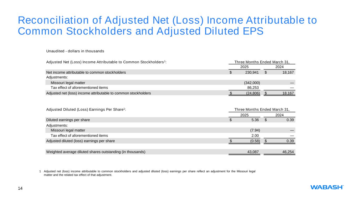 13 Reconciliation of Adjusted Segment Operating (Loss) Income1 Unaudited - dollars in thousands Three Months Ended March 31, 2025 2024 Transportation Solutions (Loss) income from operations $ (9,798) $ 44,255 Adjustments: N/A — — Adjusted operating (loss) income (9,798) 44,255 Parts & Services Income from operations 6,910 10,520 Adjustments: N/A — — Adjusted operating income 6,910 10,520 Corporate Income (loss) from operations 317,439 (25,200) Adjustments: Missouri legal matter (342,000) — Adjusted operating loss (24,561) (25,200) Consolidated Income from operations 314,551 29,575 Adjustments: Missouri legal matter (342,000) — Adjusted operating (loss) income $ (27,449) $ 29,575 1 Adjusted operating (loss) income, a non-GAAP financial measure, excludes certain costs, expenses, other charges, gains or income that are included in the determination of operating income under U.S. GAAP, but that management would not consider important in evaluating the quality of the Company’s operating results as they are not indicative of the Company’s core operating results or may obscure trends useful in evaluating the Company’s continuing activities. Accordingly, the Company presents adjusted operating (loss) income excluding these special items to help investors evaluate our operating performance and trends in our business consistent with how management evaluates such performance and trends. Further, the Company presents adjusted operating (loss) income to provide investors with a better understanding of the Company’s view of our results as compared to prior periods.