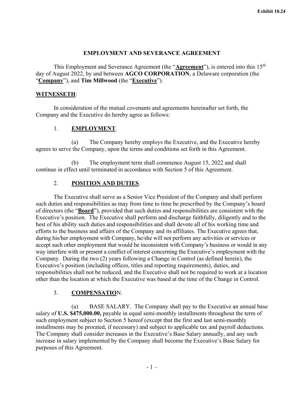 - 1 – EMPLOYMENT AND SEVERANCE AGREEMENT This Employment and Severance Agreement (the “Agreement”), is entered into this 15th day of August 2022, by and between AGCO CORPORATION, a Delaware corporation (the “Company”), and Tim Millwood (the “Executive”). WITNESSETH: In consideration of the mutual covenants and agreements hereinafter set forth, the Company and the Executive do hereby agree as follows: 1. EMPLOYMENT. (a) The Company hereby employs the Executive, and the Executive hereby agrees to serve the Company, upon the terms and conditions set forth in this Agreement. (b) The employment term shall commence August 15, 2022 and shall continue in effect until terminated in accordance with Section 5 of this Agreement. 2. POSITION AND DUTIES. The Executive shall serve as a Senior Vice President of the Company and shall perform such duties and responsibilities as may from time to time be prescribed by the Company’s board of directors (the “Board”), provided that such duties and responsibilities are consistent with the Executive’s position. The Executive shall perform and discharge faithfully, diligently and to the best of his ability such duties and responsibilities and shall devote all of his working time and efforts to the business and affairs of the Company and its affiliates. The Executive agrees that, during his/her employment with Company, he/she will not perform any activities or services or accept such other employment that would be inconsistent with Company’s business or would in any way interfere with or present a conflict of interest concerning the Executive’s employment with the Company. During the two (2) years following a Change in Control (as defined herein), the Executive’s position (including offices, titles and reporting requirements), duties, and responsibilities shall not be reduced, and the Executive shall not be required to work at a location other than the location at which the Executive was based at the time of the Change in Control. 3. COMPENSATION. (a) BASE SALARY. The Company shall pay to the Executive an annual base salary of U.S. $475,000.00, payable in equal semi-monthly installments throughout the term of such employment subject to Section 5 hereof (except that the first and last semi-monthly installments may be prorated, if necessary) and subject to applicable tax and payroll deductions. The Company shall consider increases in the Executive’s Base Salary annually, and any such increase in salary implemented by the Company shall become the Executive’s Base Salary for purposes of this Agreement.