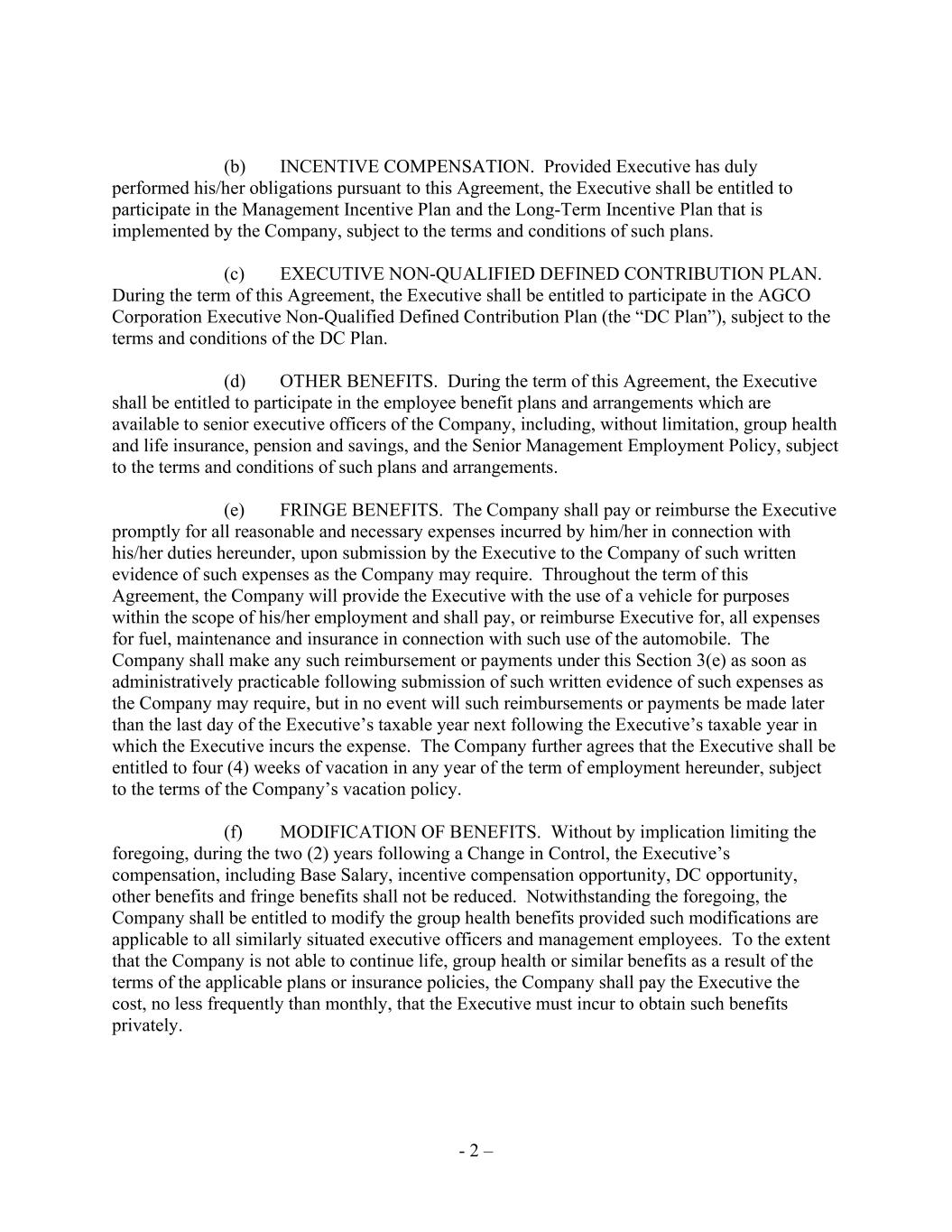 - 2 – (b) INCENTIVE COMPENSATION. Provided Executive has duly performed his/her obligations pursuant to this Agreement, the Executive shall be entitled to participate in the Management Incentive Plan and the Long-Term Incentive Plan that is implemented by the Company, subject to the terms and conditions of such plans. (c) EXECUTIVE NON-QUALIFIED DEFINED CONTRIBUTION PLAN. During the term of this Agreement, the Executive shall be entitled to participate in the AGCO Corporation Executive Non-Qualified Defined Contribution Plan (the “DC Plan”), subject to the terms and conditions of the DC Plan. (d) OTHER BENEFITS. During the term of this Agreement, the Executive shall be entitled to participate in the employee benefit plans and arrangements which are available to senior executive officers of the Company, including, without limitation, group health and life insurance, pension and savings, and the Senior Management Employment Policy, subject to the terms and conditions of such plans and arrangements. (e) FRINGE BENEFITS. The Company shall pay or reimburse the Executive promptly for all reasonable and necessary expenses incurred by him/her in connection with his/her duties hereunder, upon submission by the Executive to the Company of such written evidence of such expenses as the Company may require. Throughout the term of this Agreement, the Company will provide the Executive with the use of a vehicle for purposes within the scope of his/her employment and shall pay, or reimburse Executive for, all expenses for fuel, maintenance and insurance in connection with such use of the automobile. The Company shall make any such reimbursement or payments under this Section 3(e) as soon as administratively practicable following submission of such written evidence of such expenses as the Company may require, but in no event will such reimbursements or payments be made later than the last day of the Executive’s taxable year next following the Executive’s taxable year in which the Executive incurs the expense. The Company further agrees that the Executive shall be entitled to four (4) weeks of vacation in any year of the term of employment hereunder, subject to the terms of the Company’s vacation policy. (f) MODIFICATION OF BENEFITS. Without by implication limiting the foregoing, during the two (2) years following a Change in Control, the Executive’s compensation, including Base Salary, incentive compensation opportunity, DC opportunity, other benefits and fringe benefits shall not be reduced. Notwithstanding the foregoing, the Company shall be entitled to modify the group health benefits provided such modifications are applicable to all similarly situated executive officers and management employees. To the extent that the Company is not able to continue life, group health or similar benefits as a result of the terms of the applicable plans or insurance policies, the Company shall pay the Executive the cost, no less frequently than monthly, that the Executive must incur to obtain such benefits privately.
